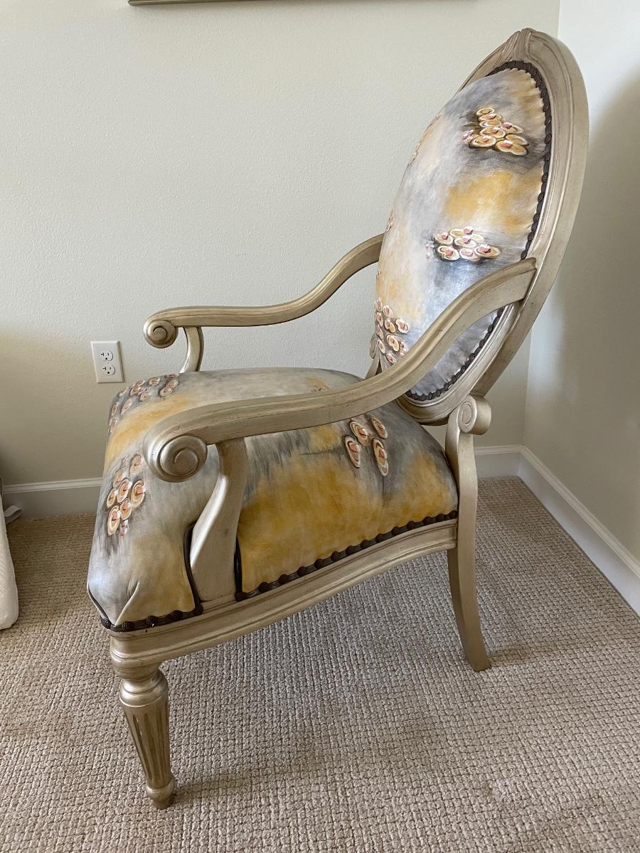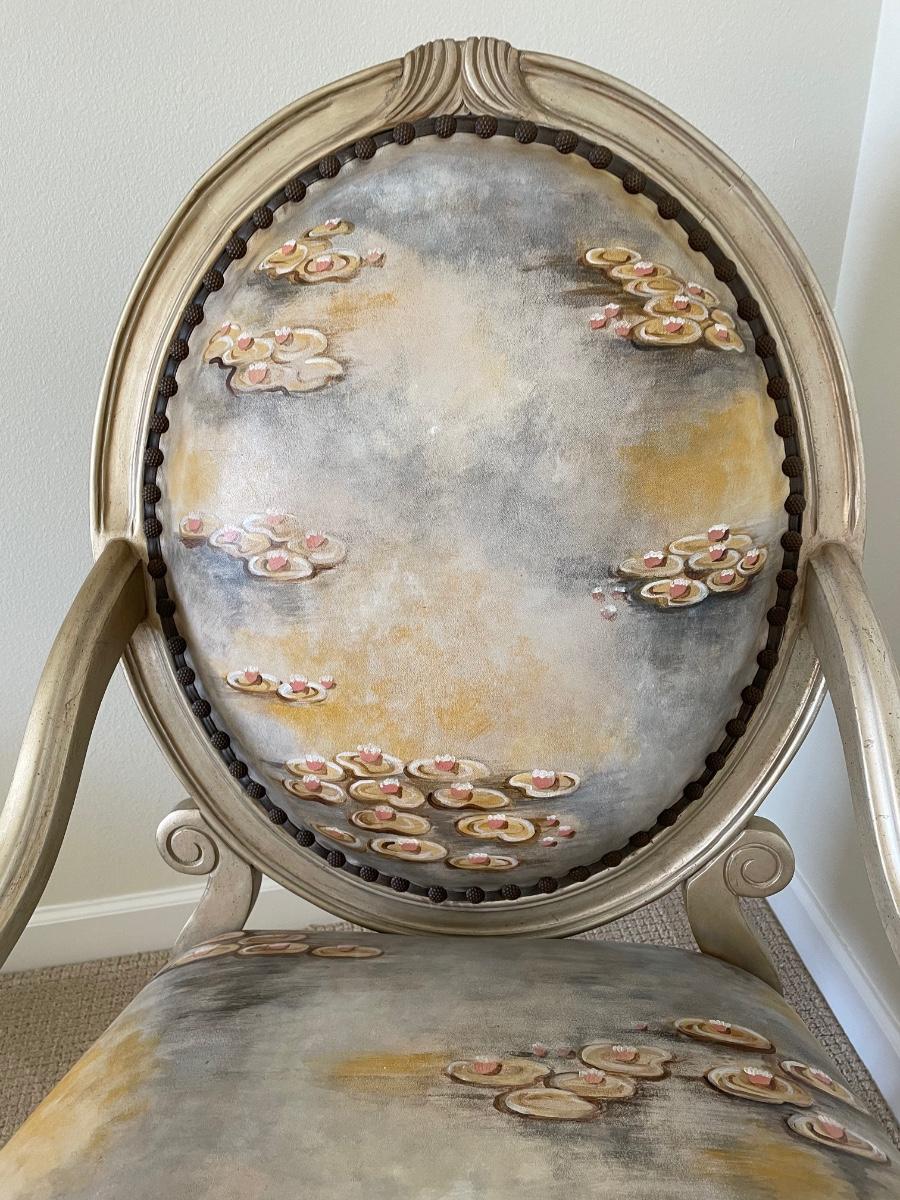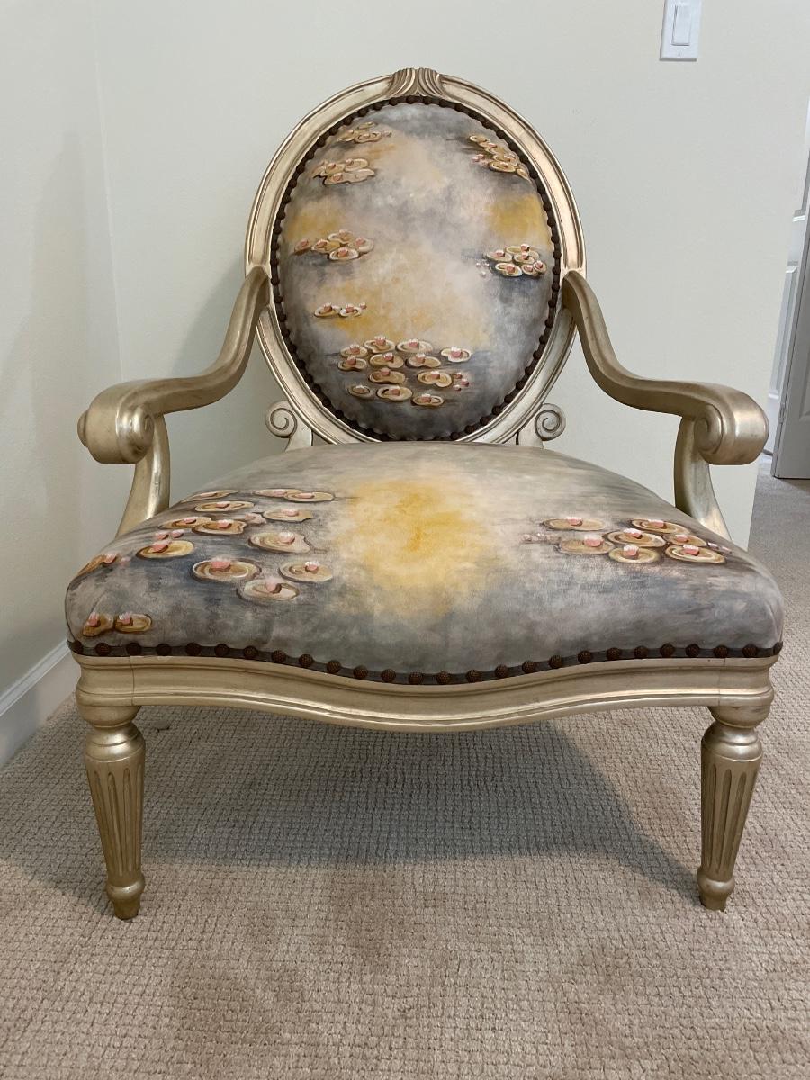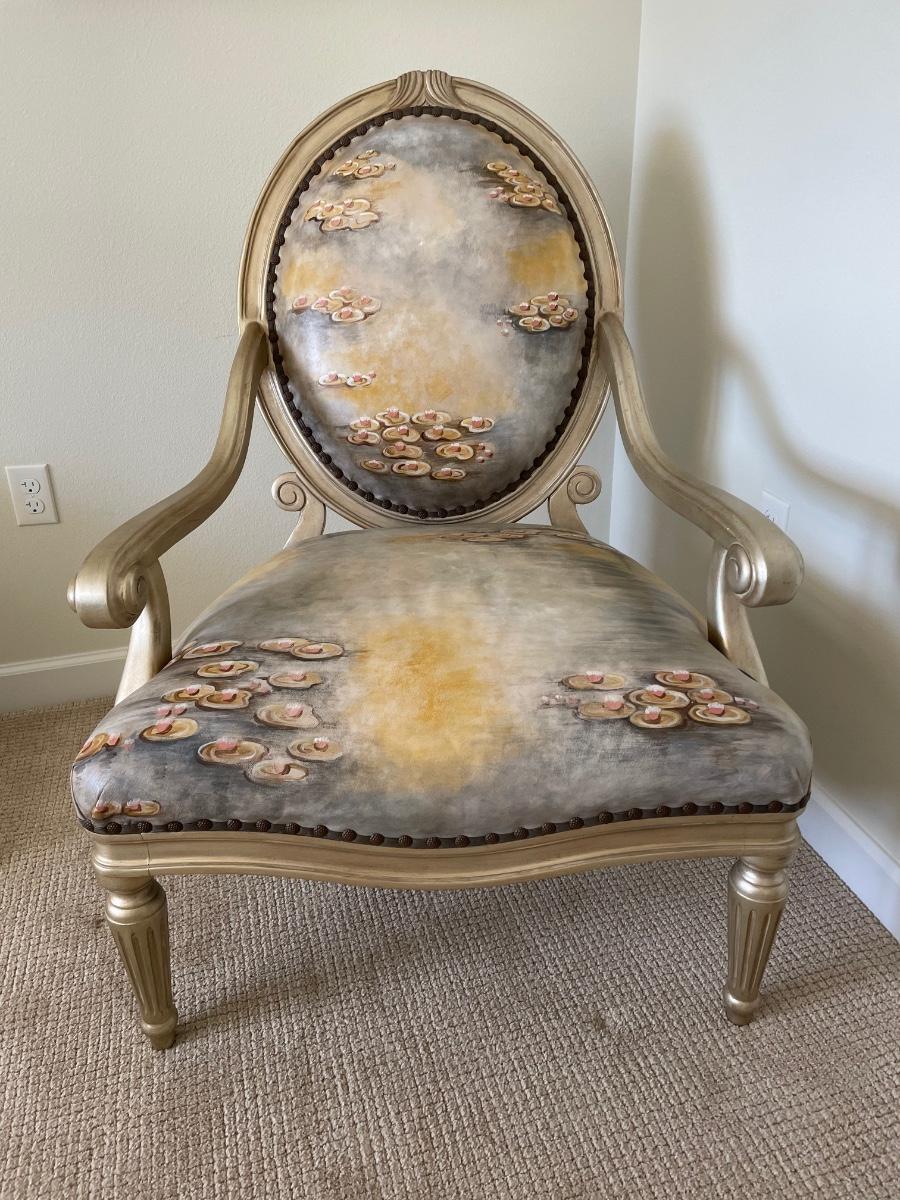 Stunningly beautiful gold chair, upholstered in leather that has been hand painted in a design patterned after Monet's Water Lilies. Made by Councill.