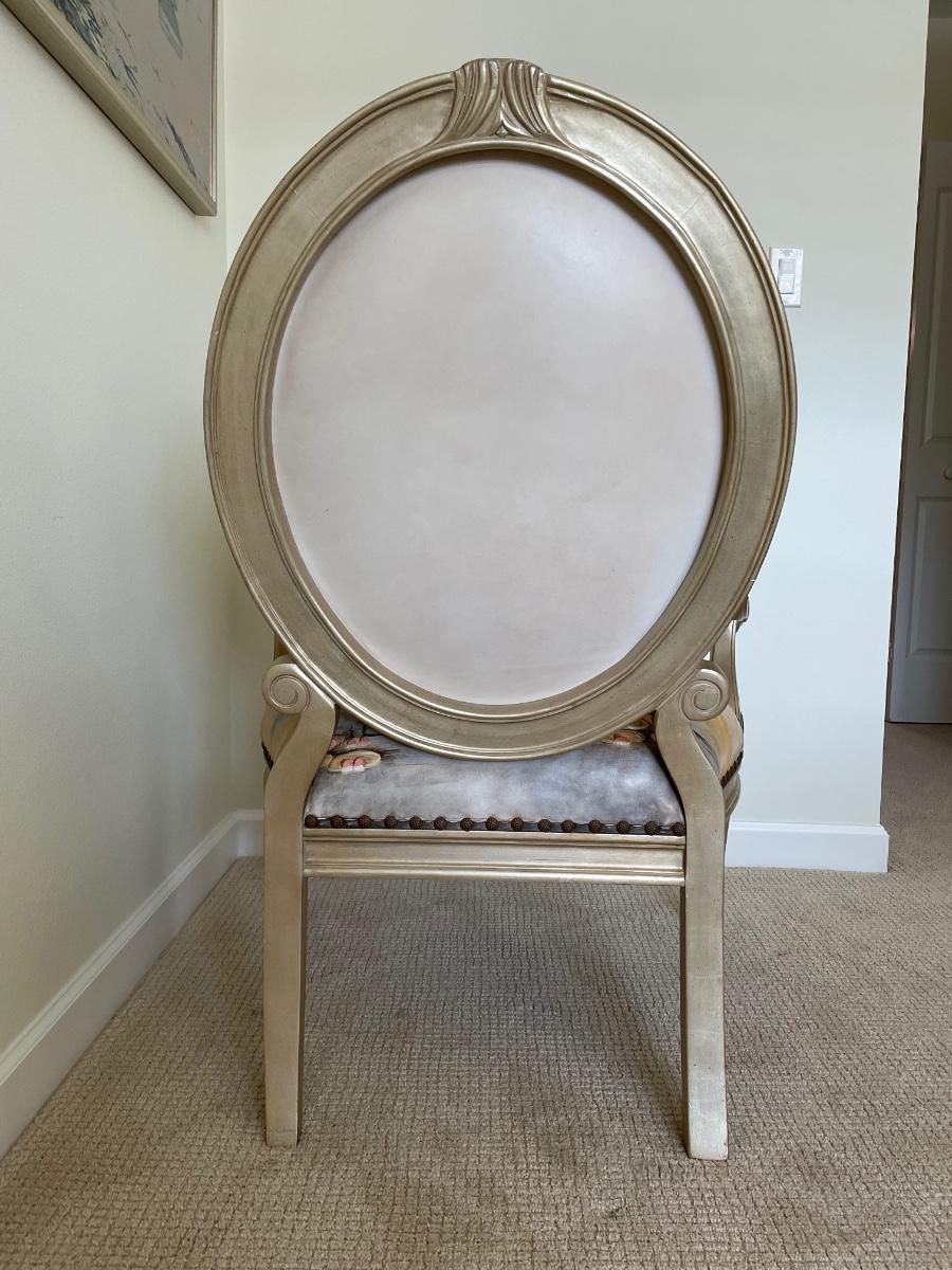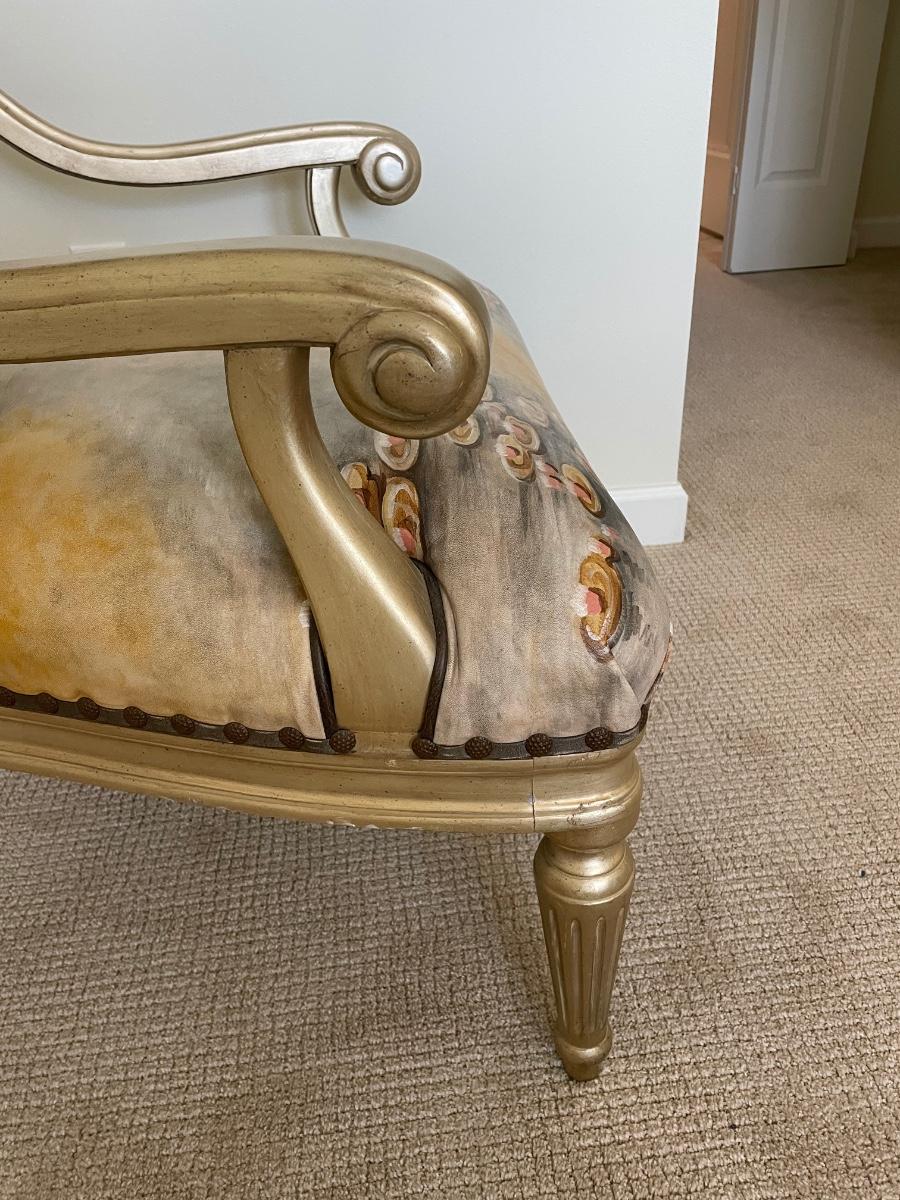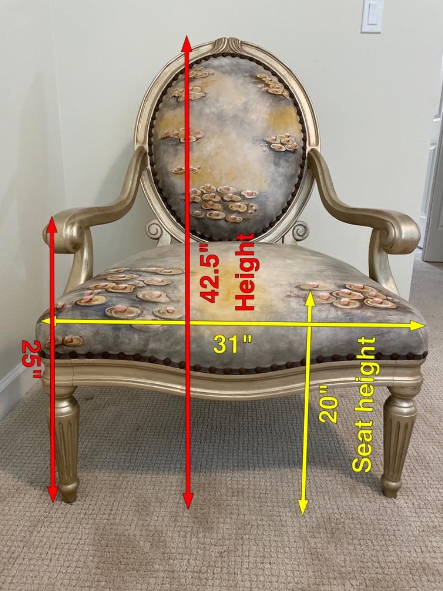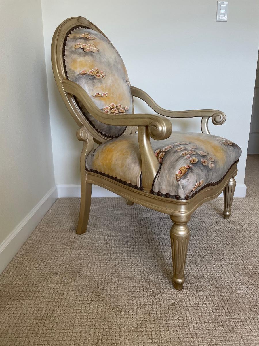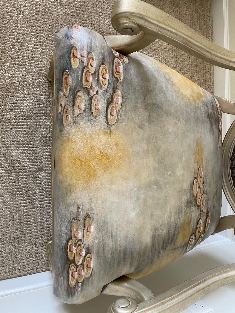 Stunningly beautiful gold chair, upholstered in leather that has been hand painted in a design patterned after Monet's Water Lilies. Made by Councill.