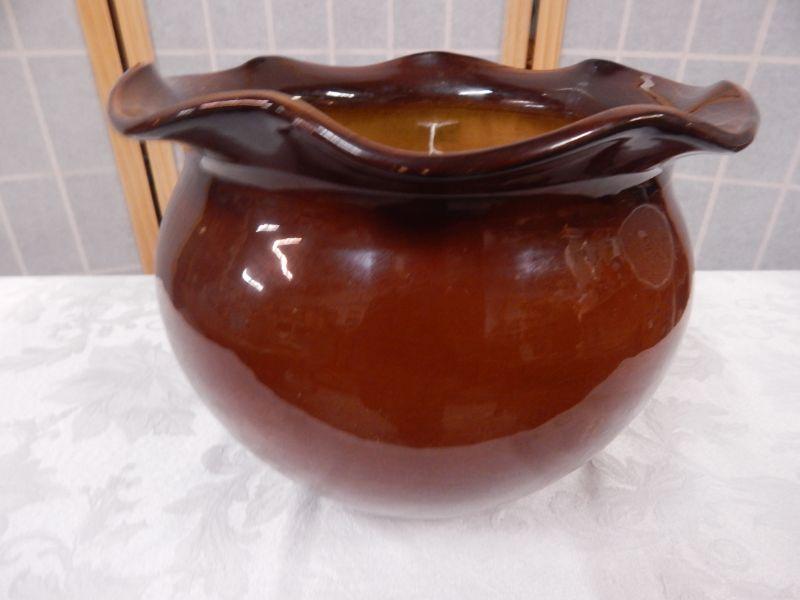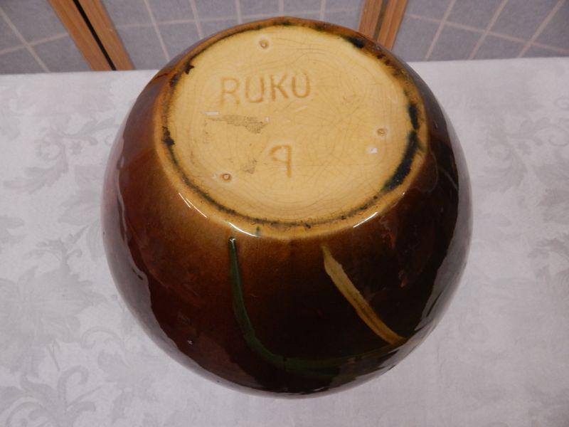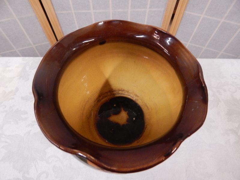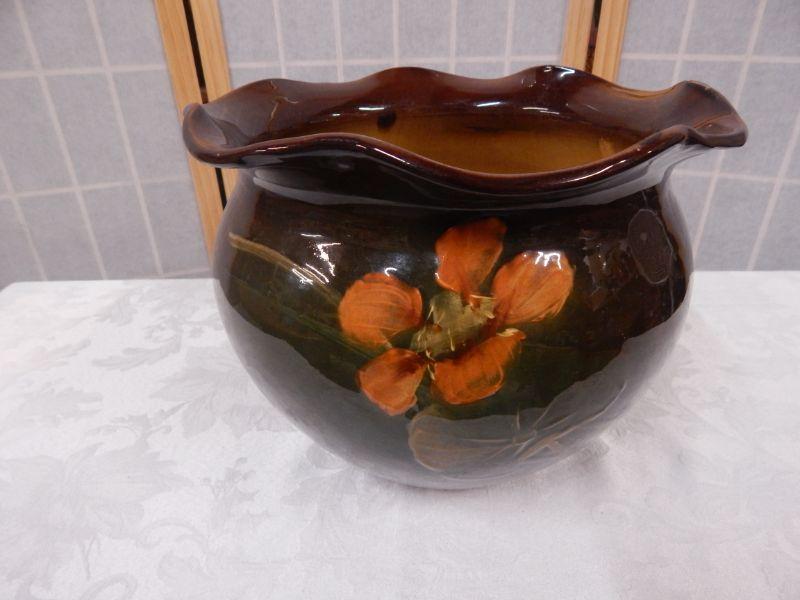 Hand Painted Louwelsa Weller Brown Floral 9" Wavy Edge Flower Pot - Marked Ruku 9 - 2 Cracks on Edge