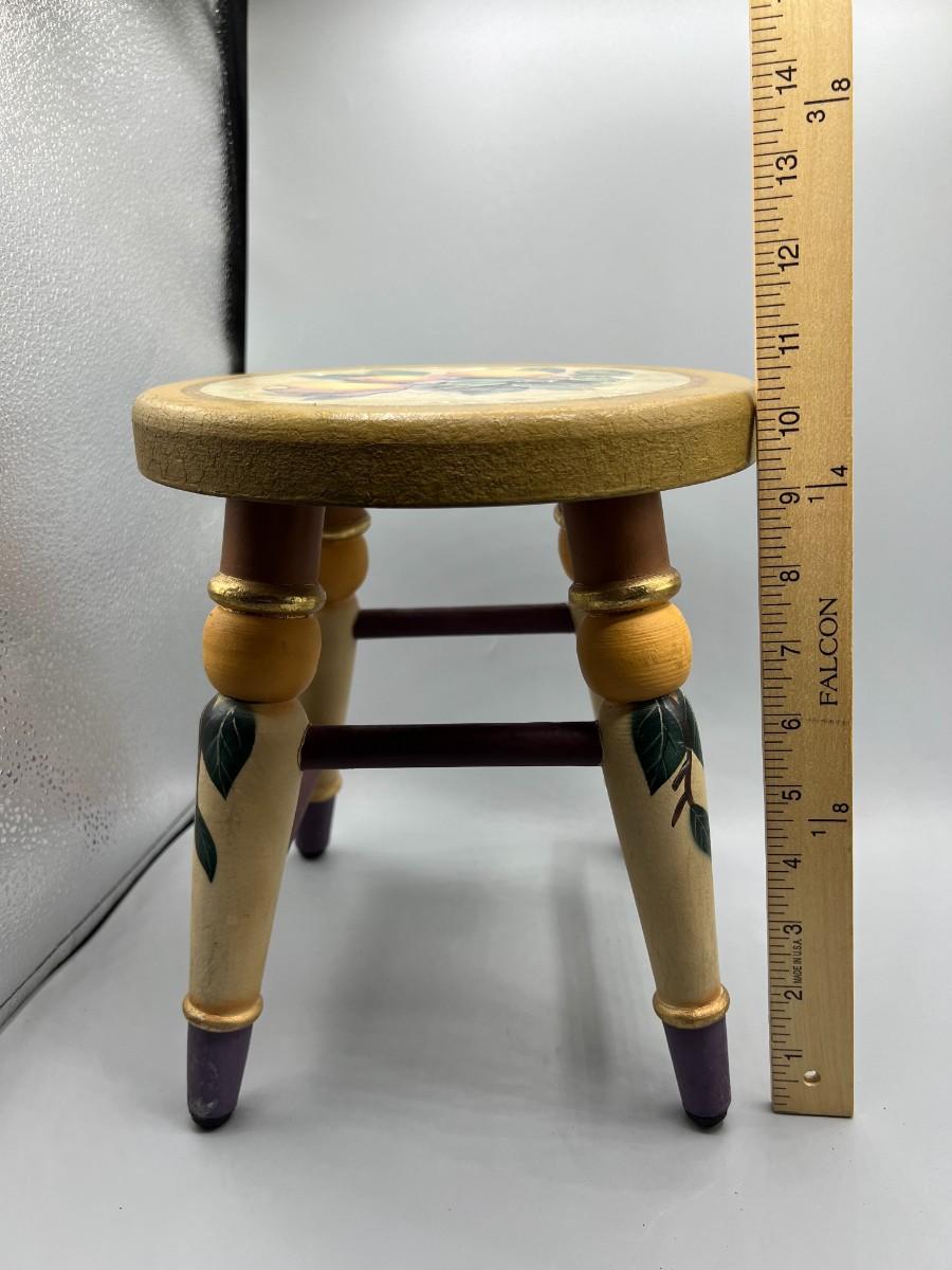 Hand Painted French Provincial Country Rustic Style Decorative Stool. There is a light chip to the rim of the seat, but there is no significant damage and is in overall good displayable condition. Check pictures for more details and for sizing.