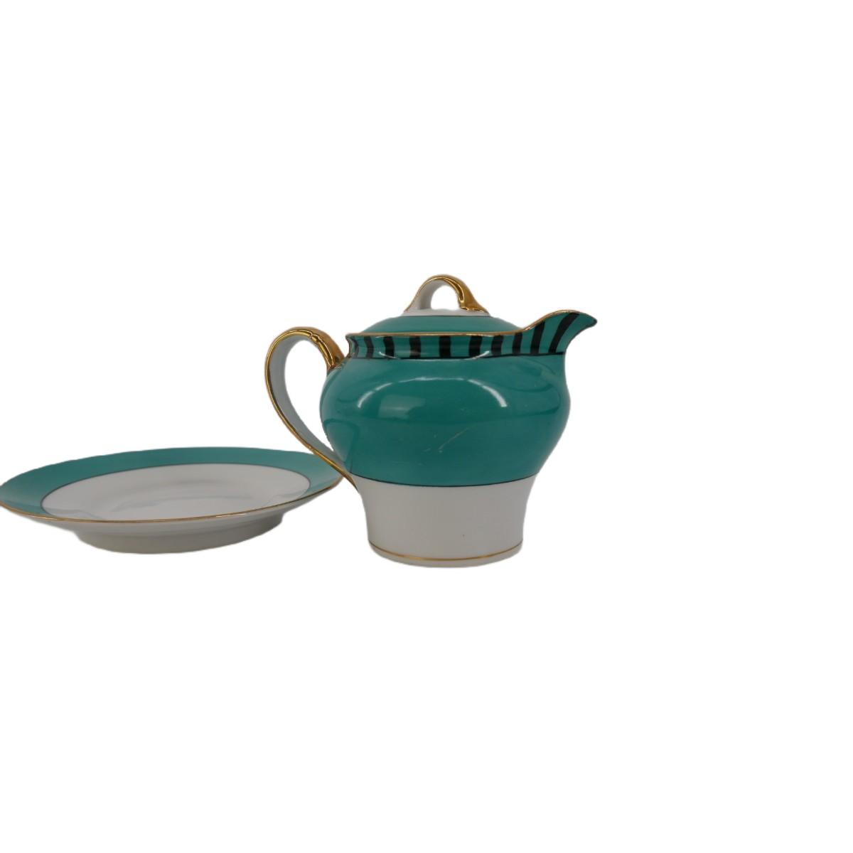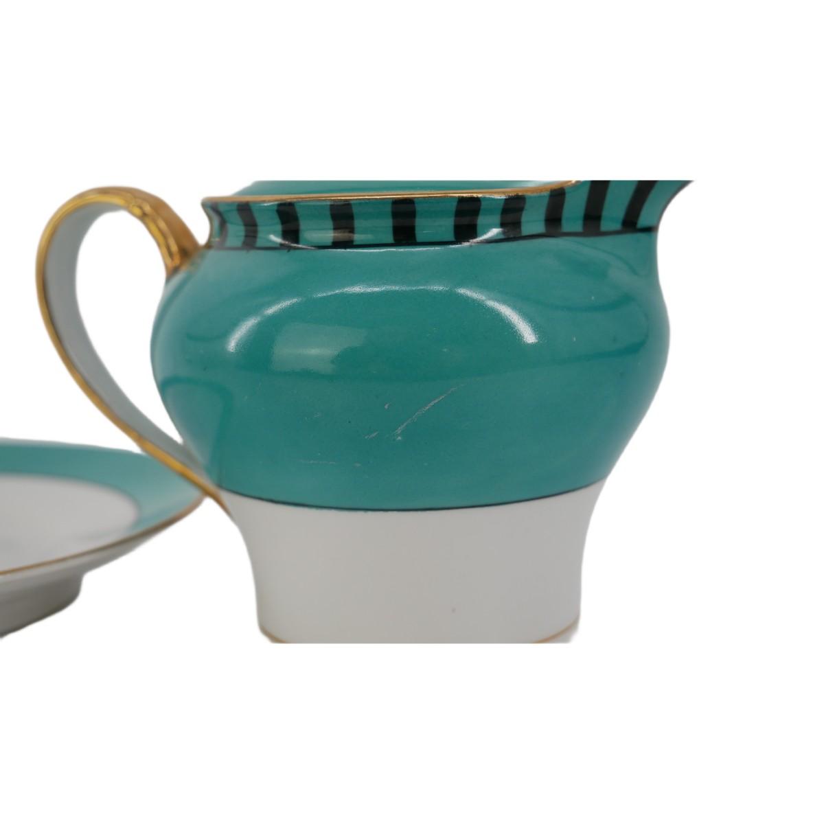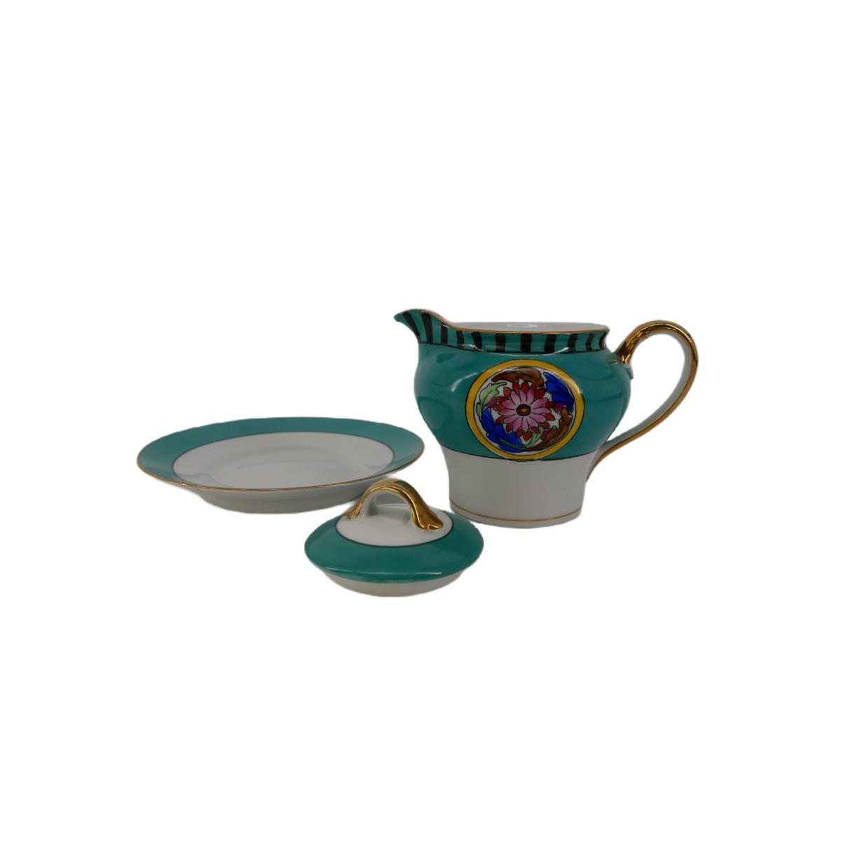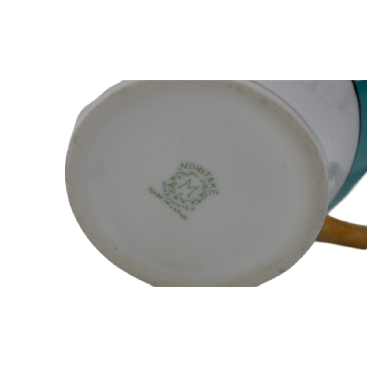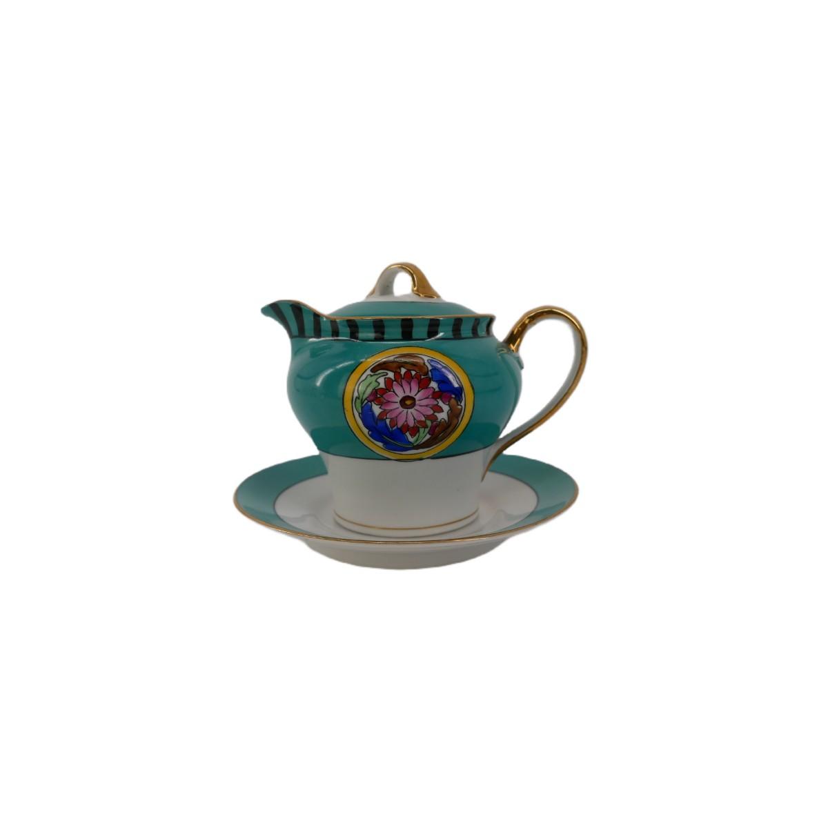 Vintage hand painted miniature teapot and saucer, marked Noritake, made in Japan. Beautiful teal color with floral design. Normal wear and a few paint issues (see photos). Overall good condition. Teapot measures L 5" x H 4", saucer measures 5.5" across. Lot weighs 12 oz. (G16)