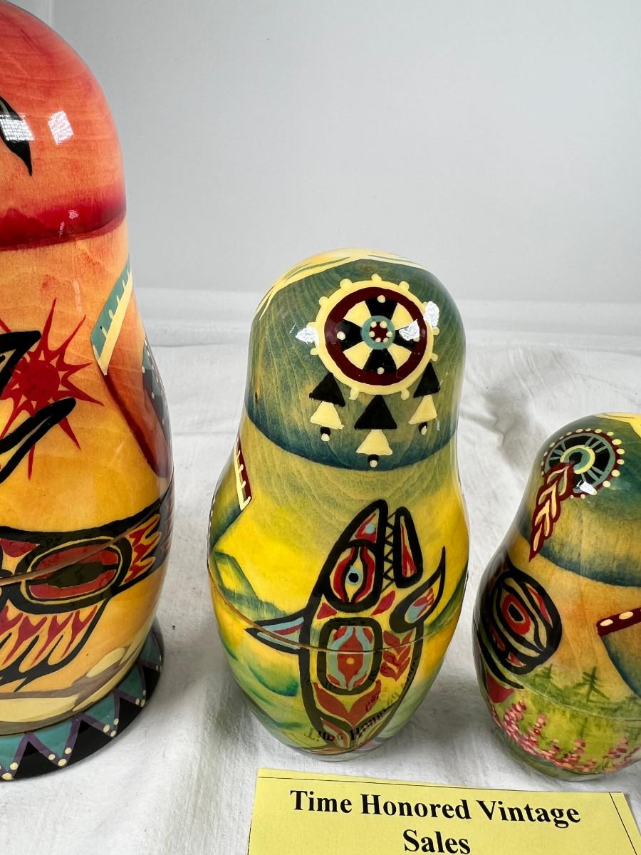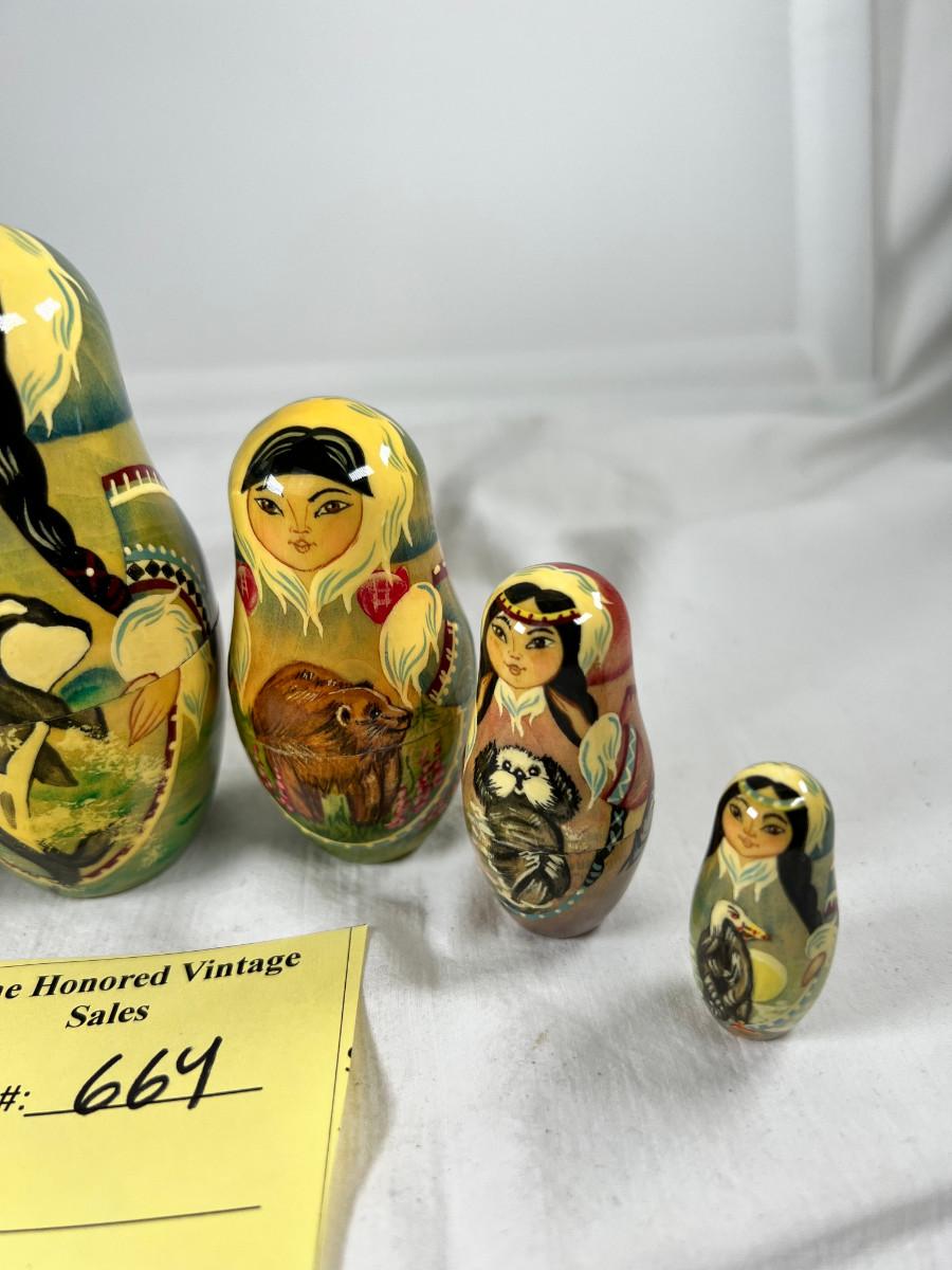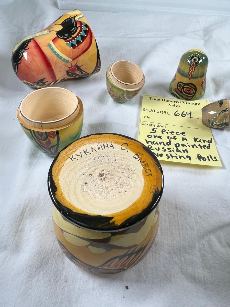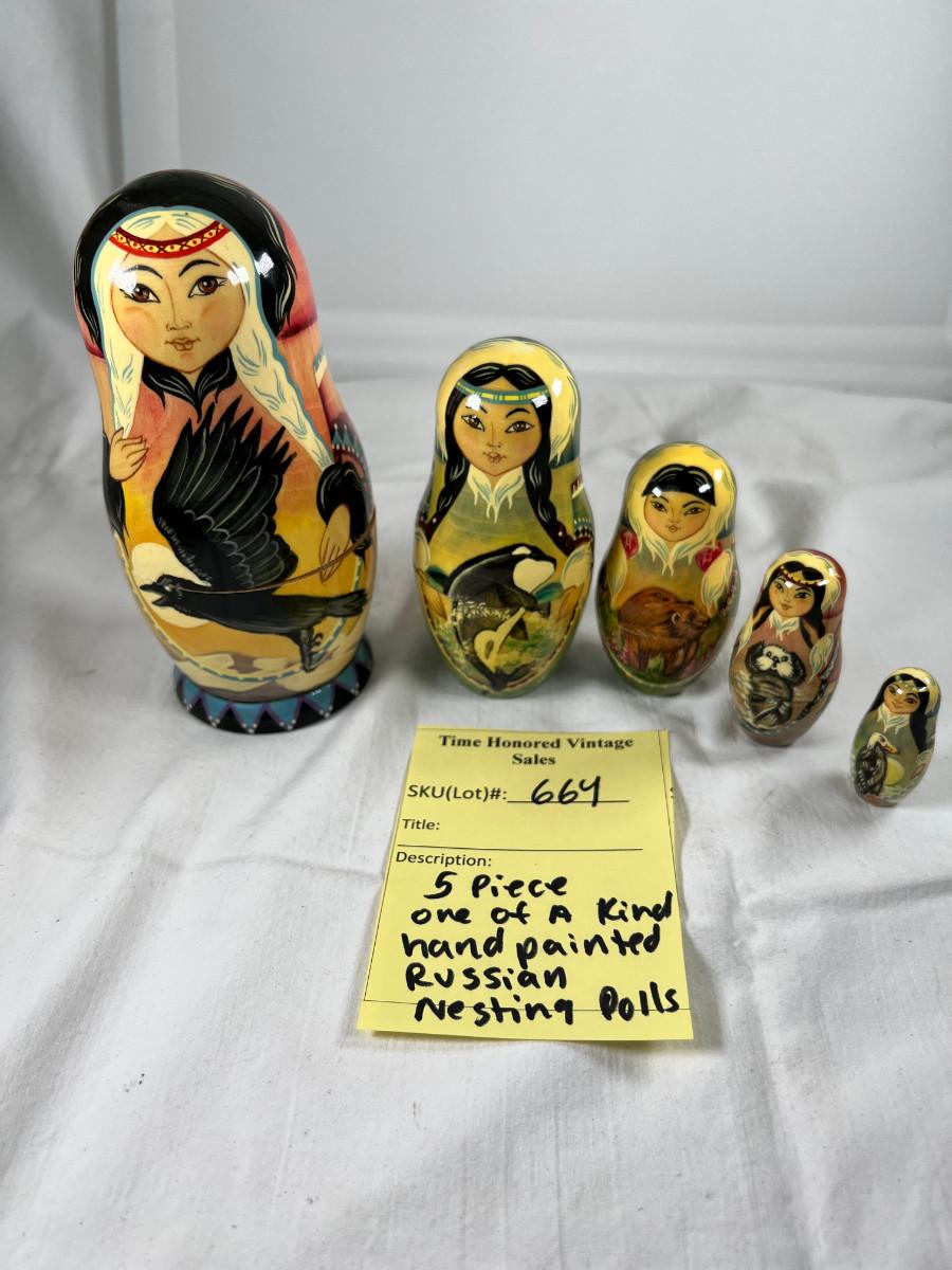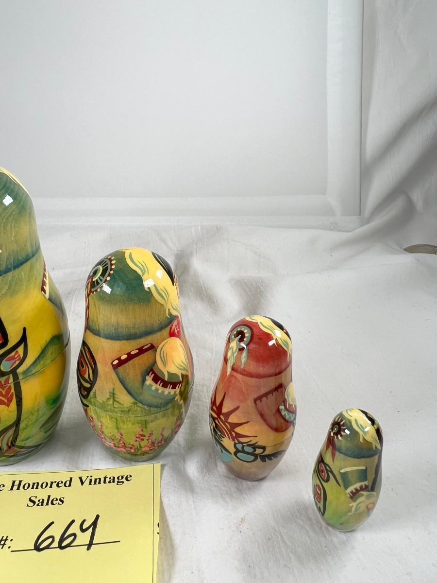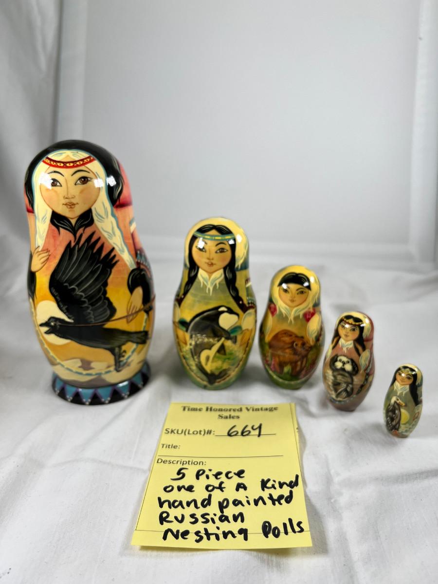 Russian 5 piece nesting dolls . I believe These are made by indigenous Siberian artisans. Pick up is in Saratoga August 6/ or use lugg.com your payment holds item.