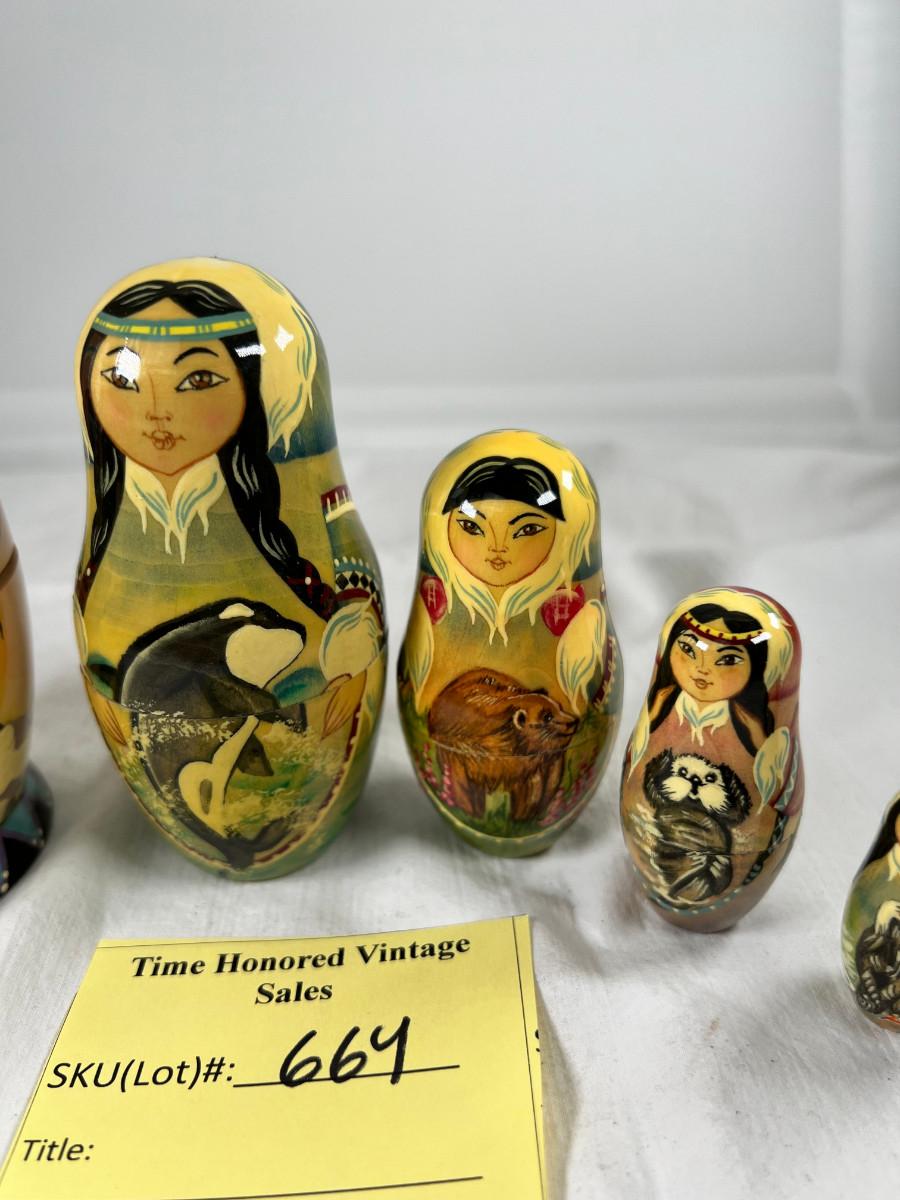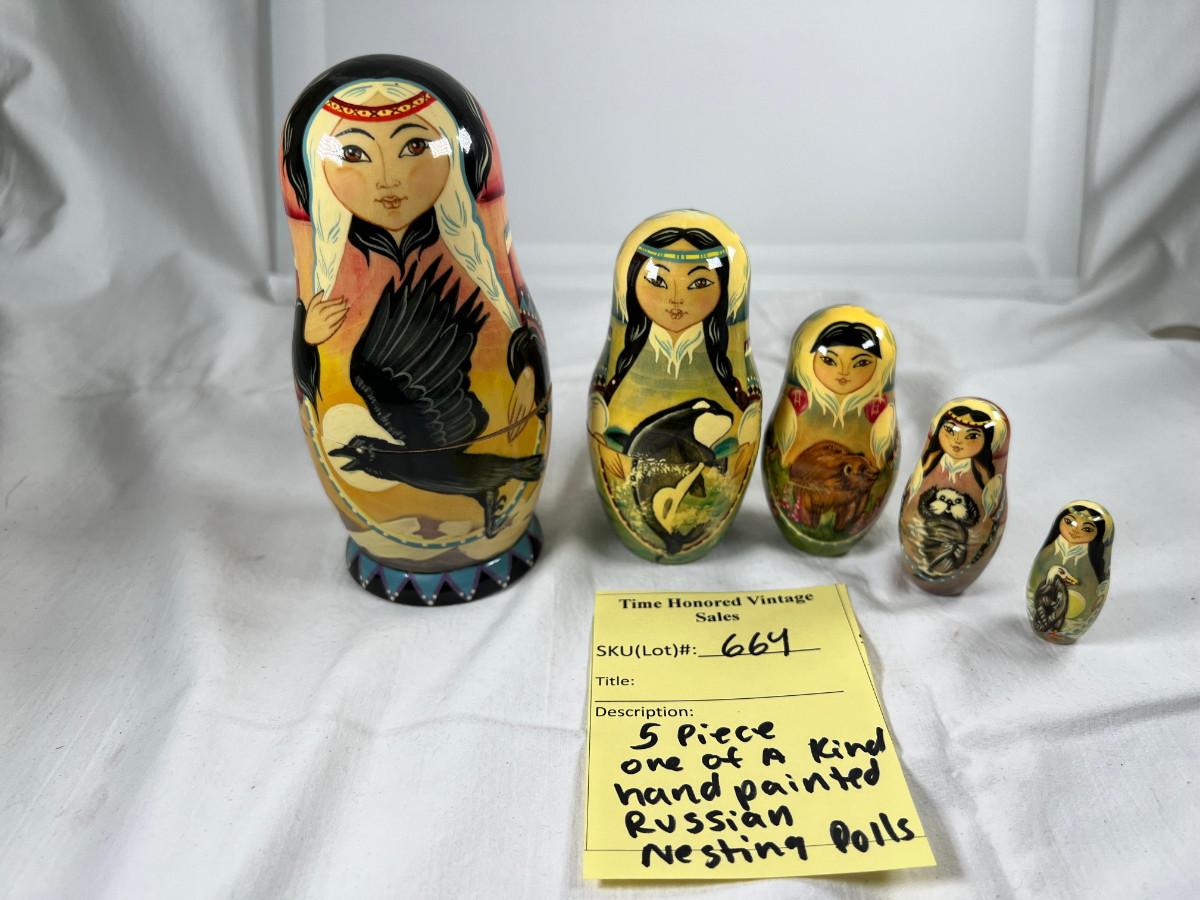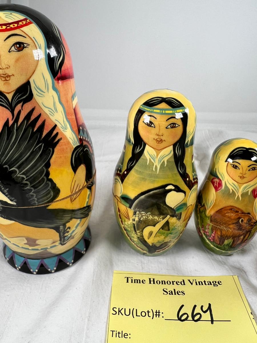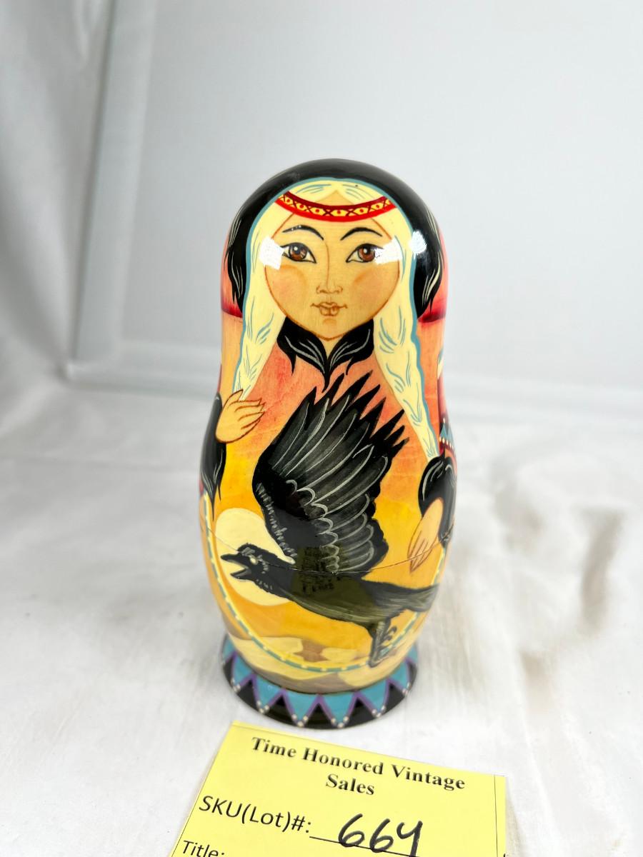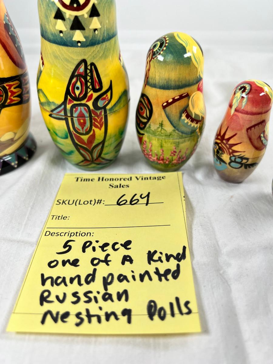 Russian 5 piece nesting dolls . I believe These are made by indigenous Siberian artisans. Pick up is in Saratoga August 6/ or use lugg.com your payment holds item.