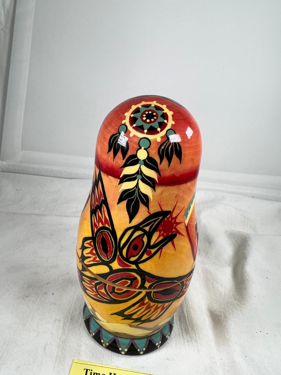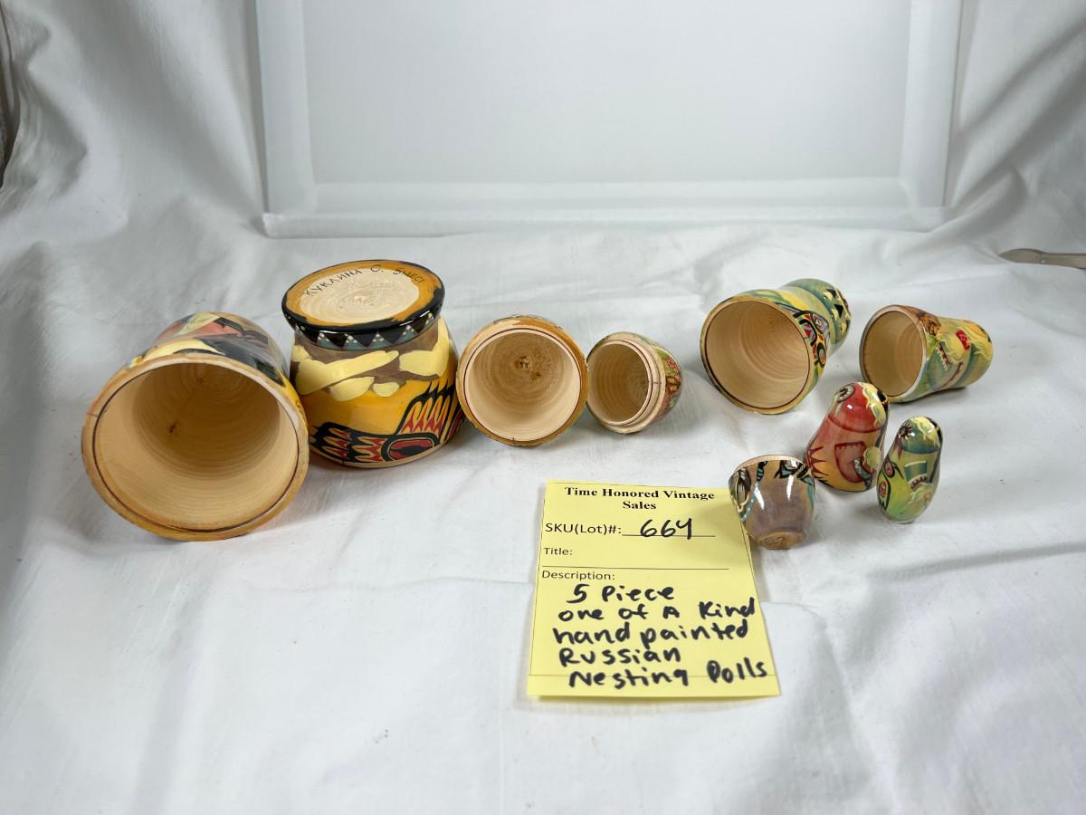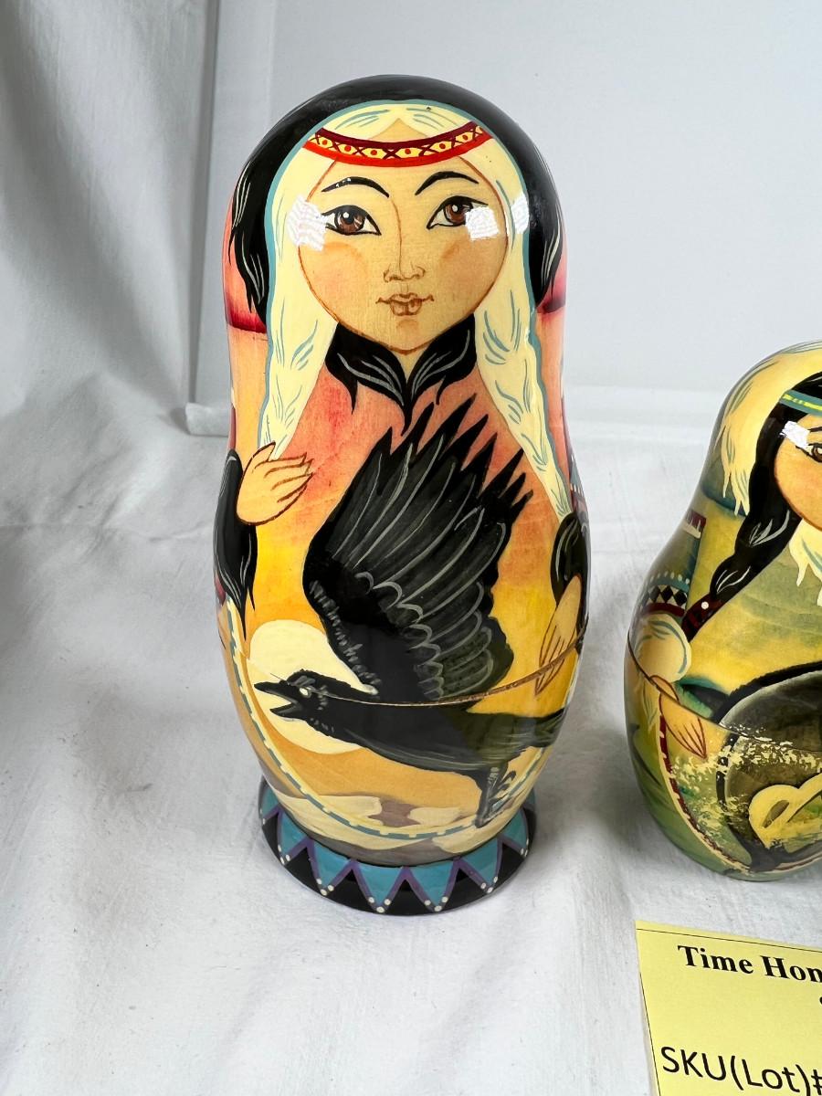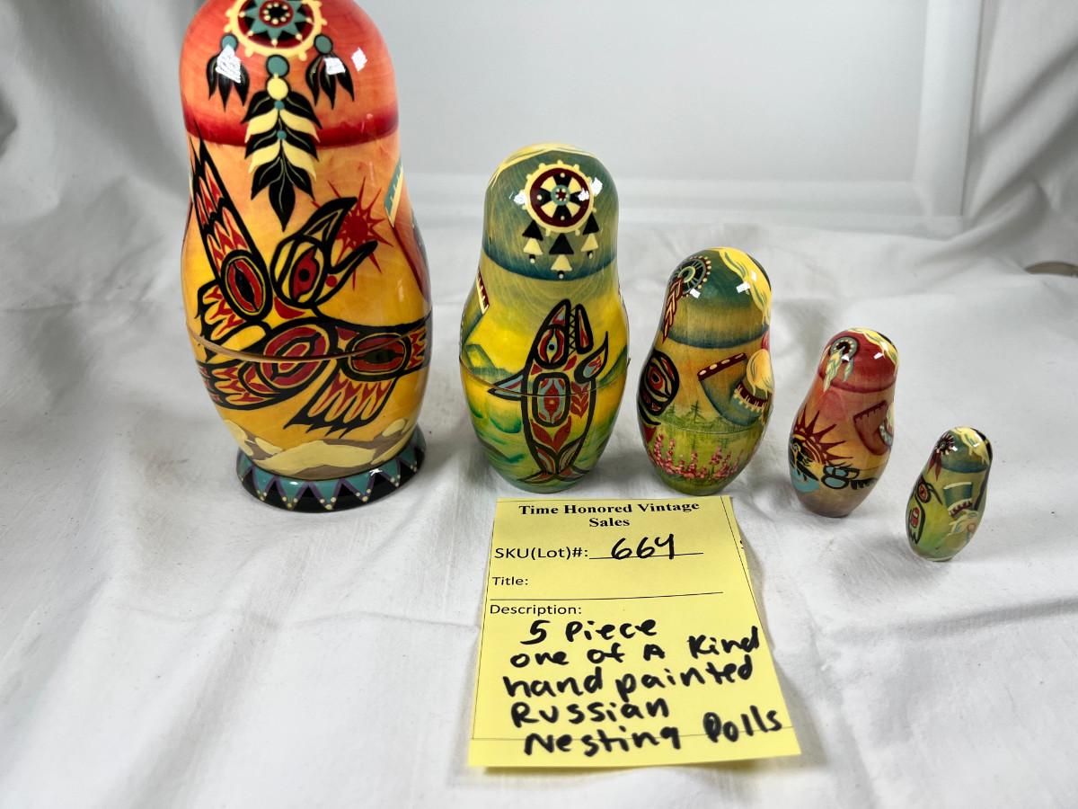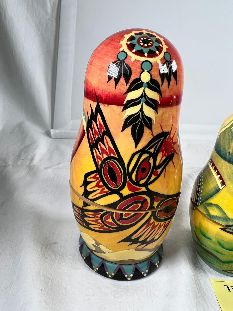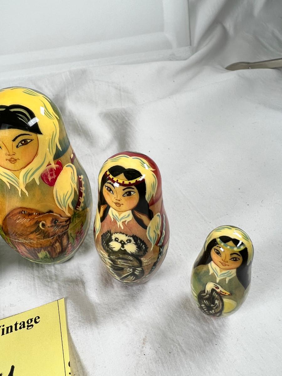 Russian 5 piece nesting dolls . I believe These are made by indigenous Siberian artisans. Pick up is in Saratoga August 6/ or use lugg.com your payment holds item.