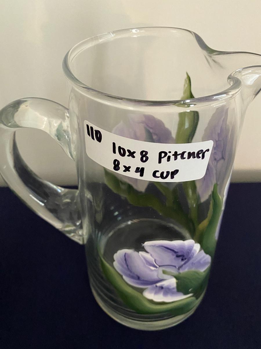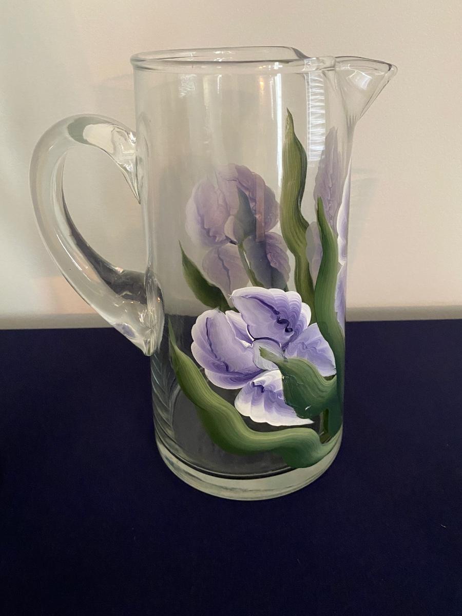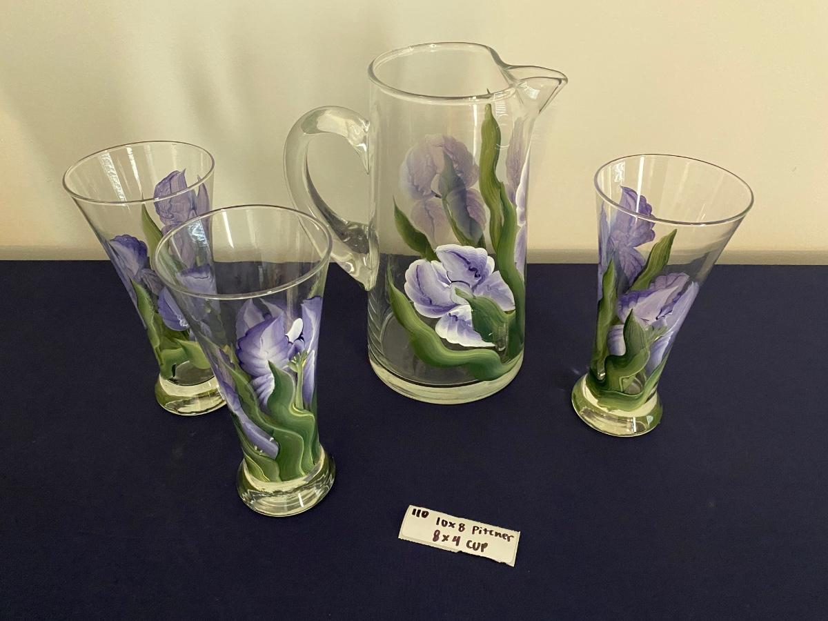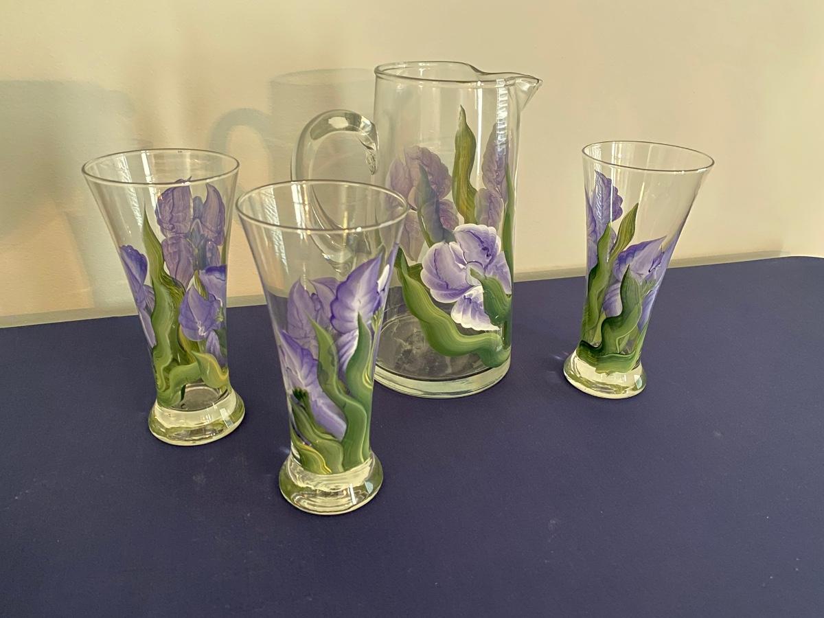 Hand Painted Pitcher and Glass Set Pitcher, 3 Glasses, Purple Flowers, Hand Painted, Pitcher 10x8, Glasses 8 in T