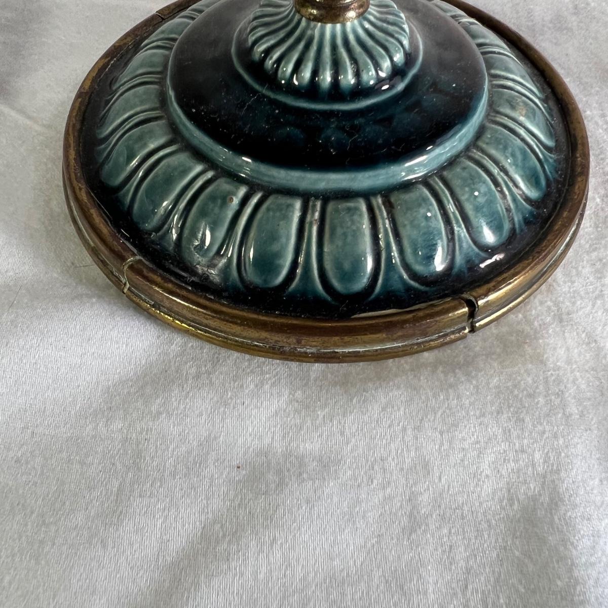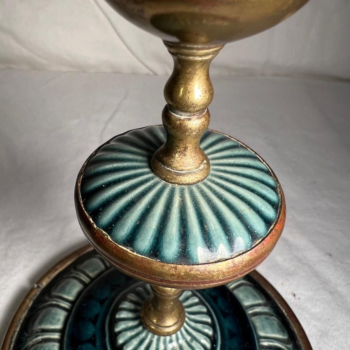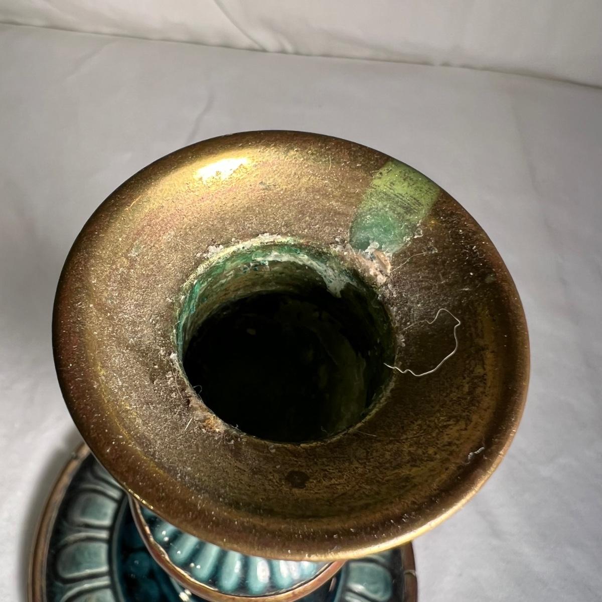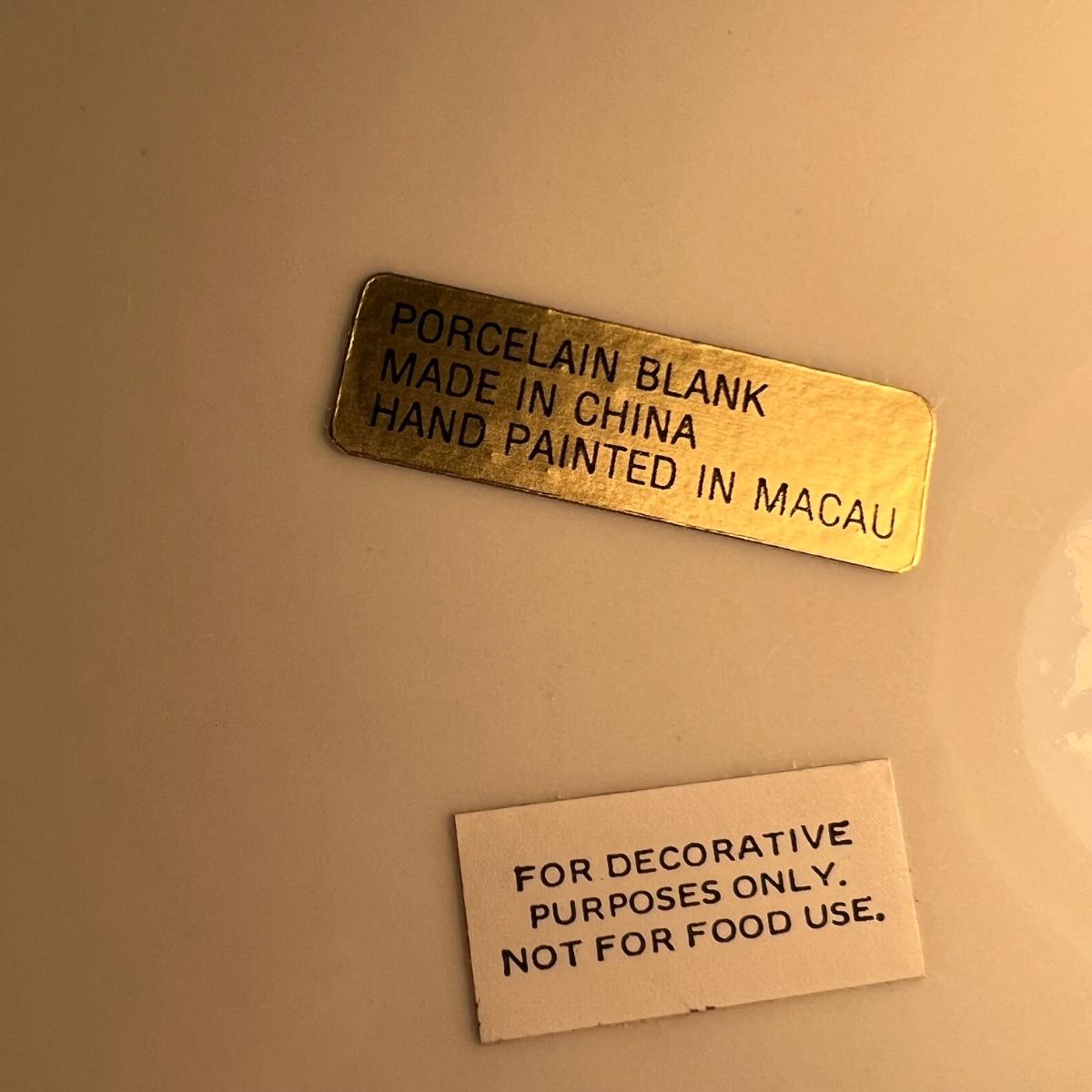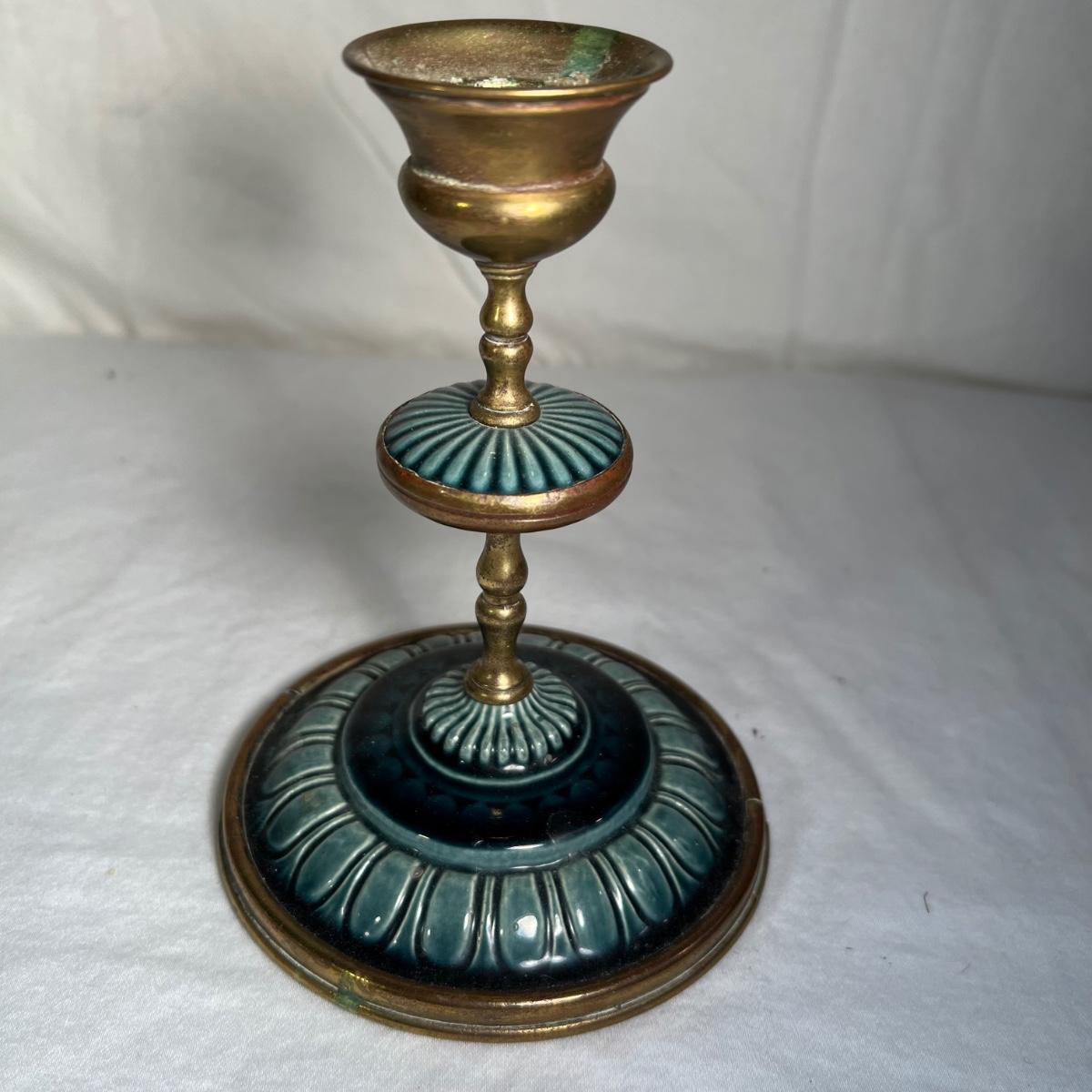 This porcelain plate is hand painted. It's label states that it's from Macau, and it measures 12”D. It has been paired with a brass and pretty blue glazed porcelain candlestick and a brass or brass like demitasse spoon with an inlay of what appears to be blue enamel. Plate stand is included. Candlestick has a little metal oxidation and the base has pulled apart slightly, see images.