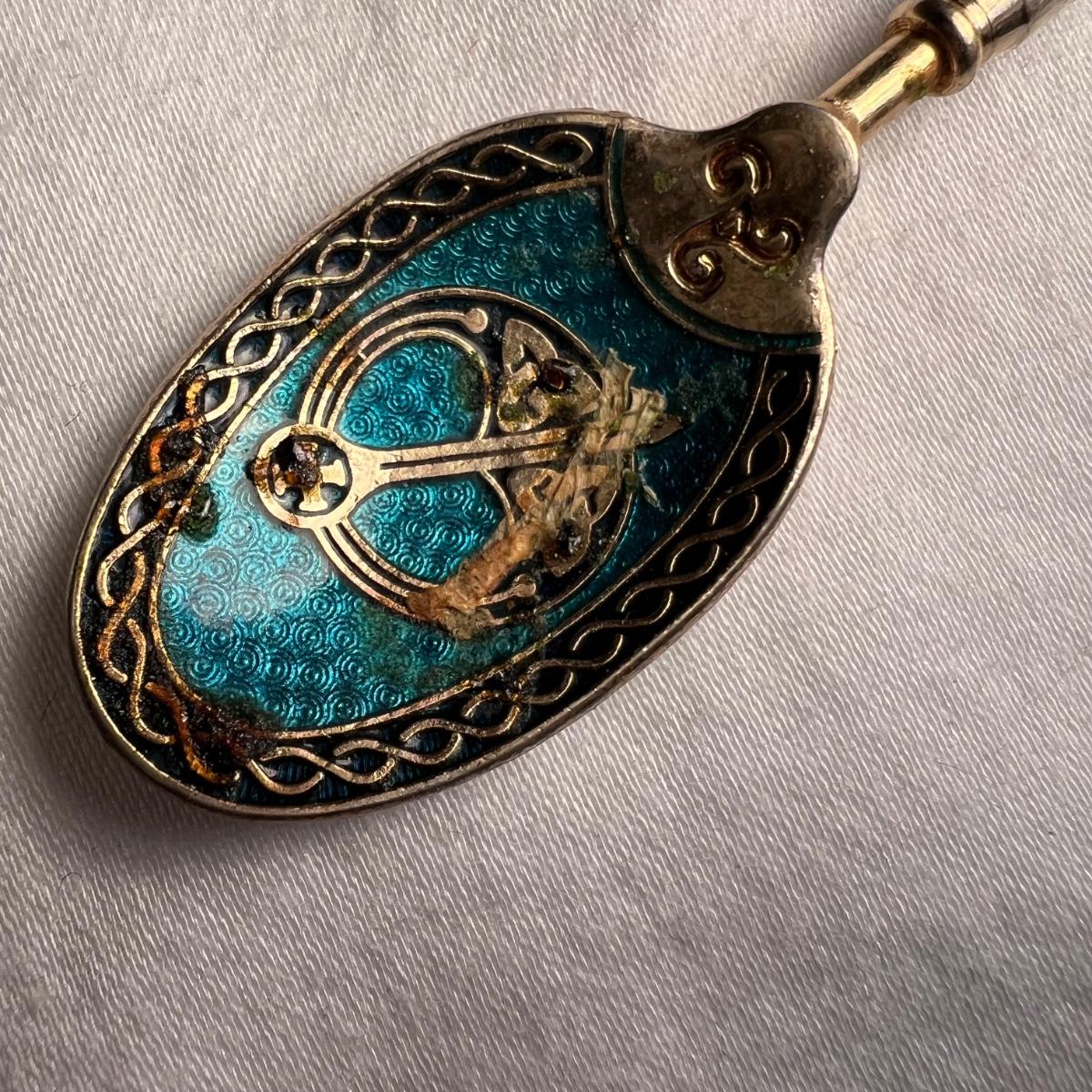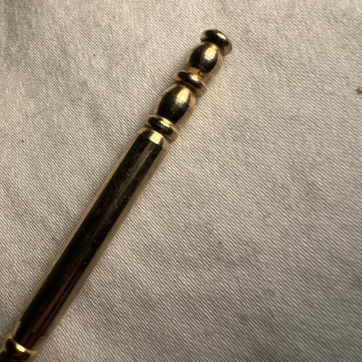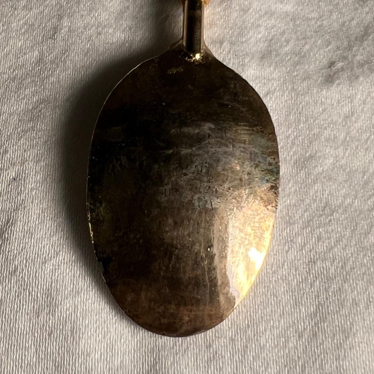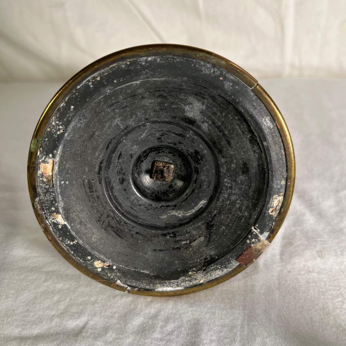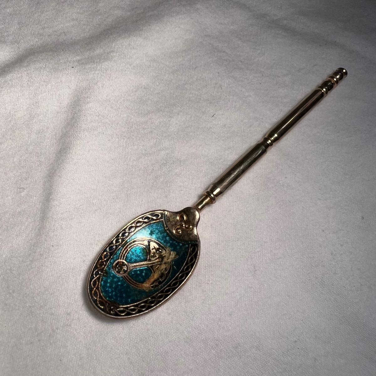 This porcelain plate is hand painted. It's label states that it's from Macau, and it measures 12”D. It has been paired with a brass and pretty blue glazed porcelain candlestick and a brass or brass like demitasse spoon with an inlay of what appears to be blue enamel. Plate stand is included. Candlestick has a little metal oxidation and the base has pulled apart slightly, see images.