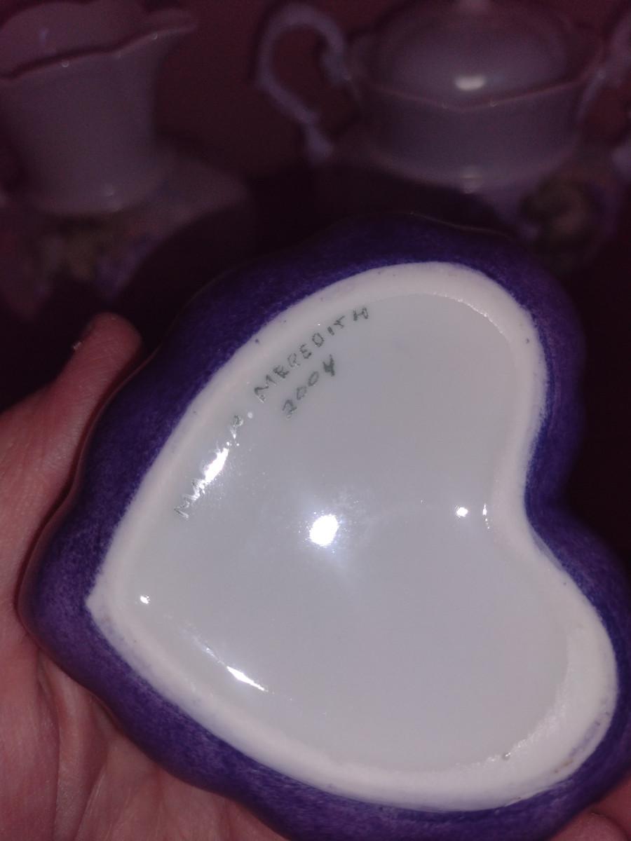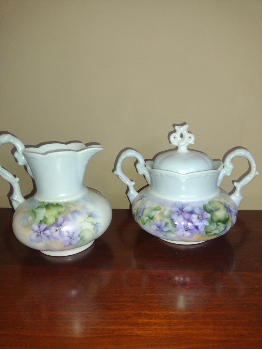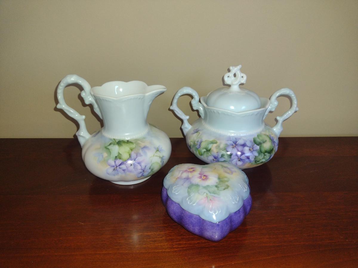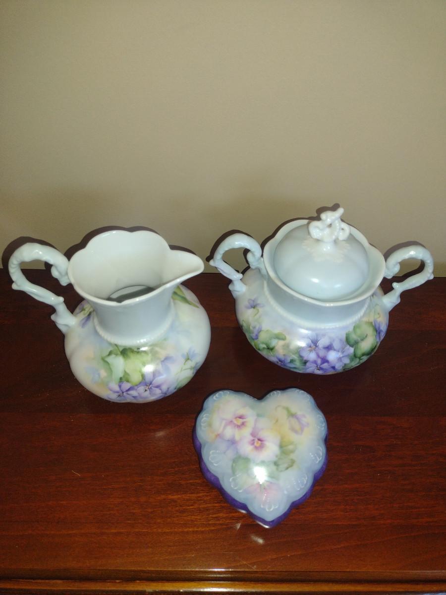 Hand Painted Porcelain House Wares- Creamer, Covered Sugar Bowl, and Heart Shaped Trinket Box