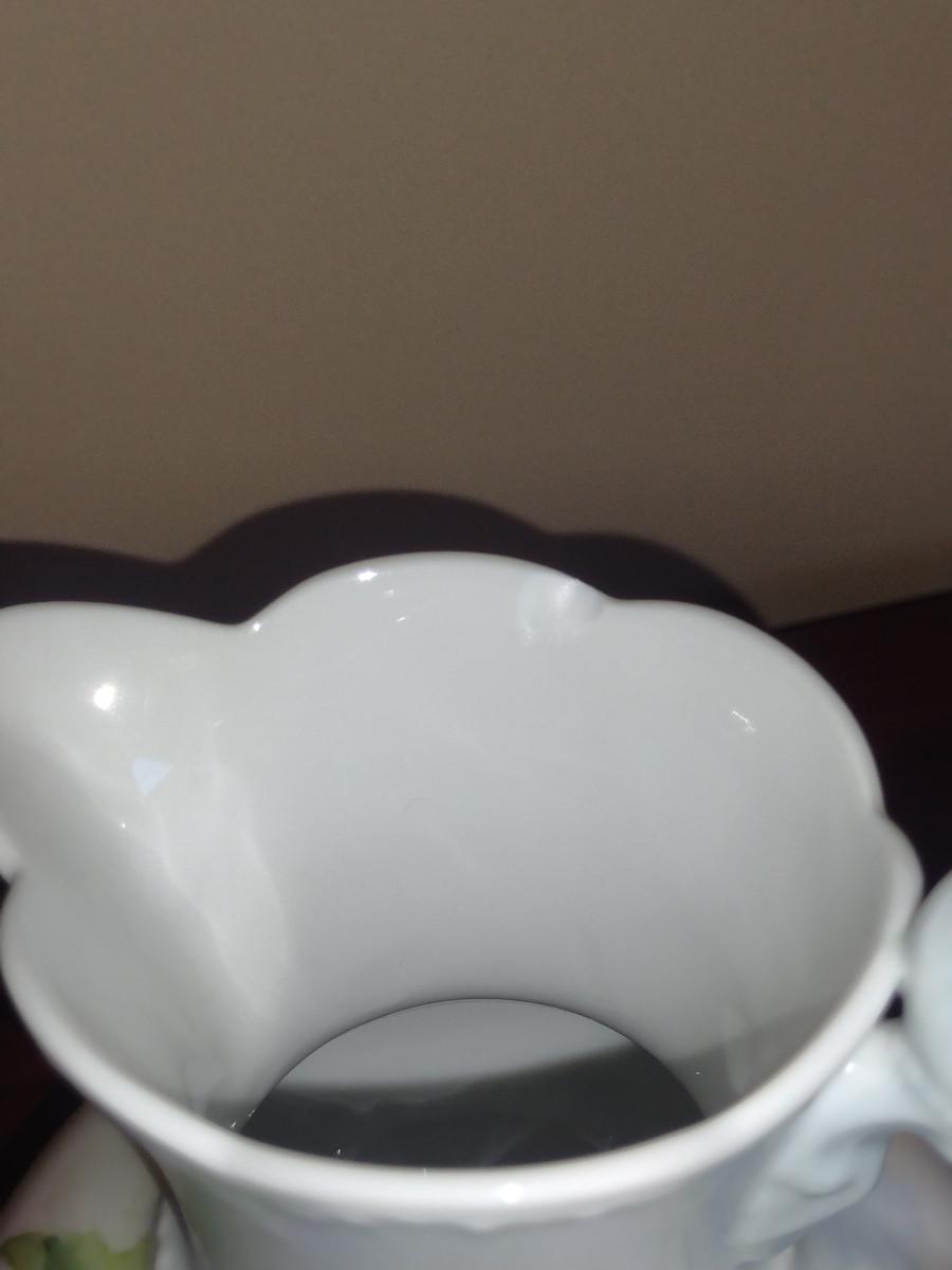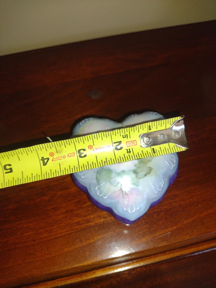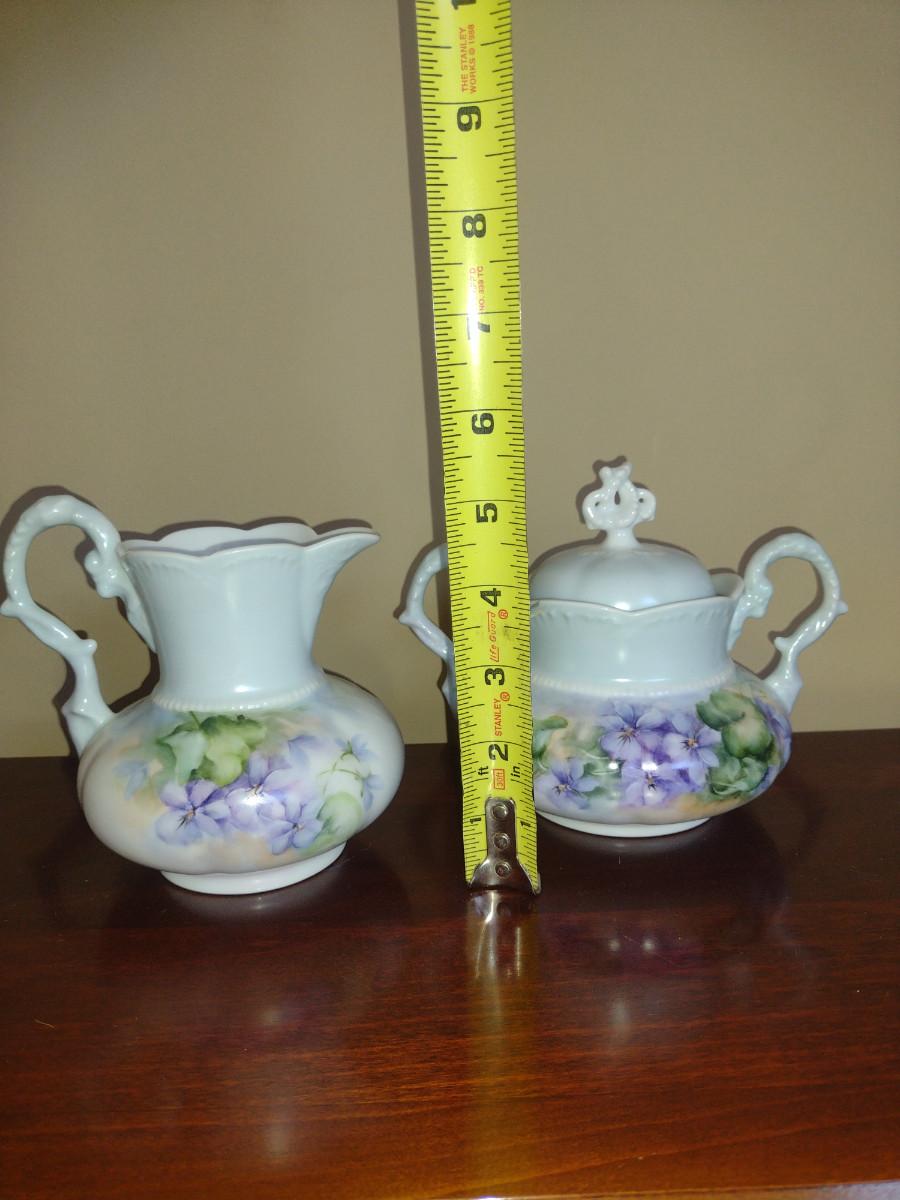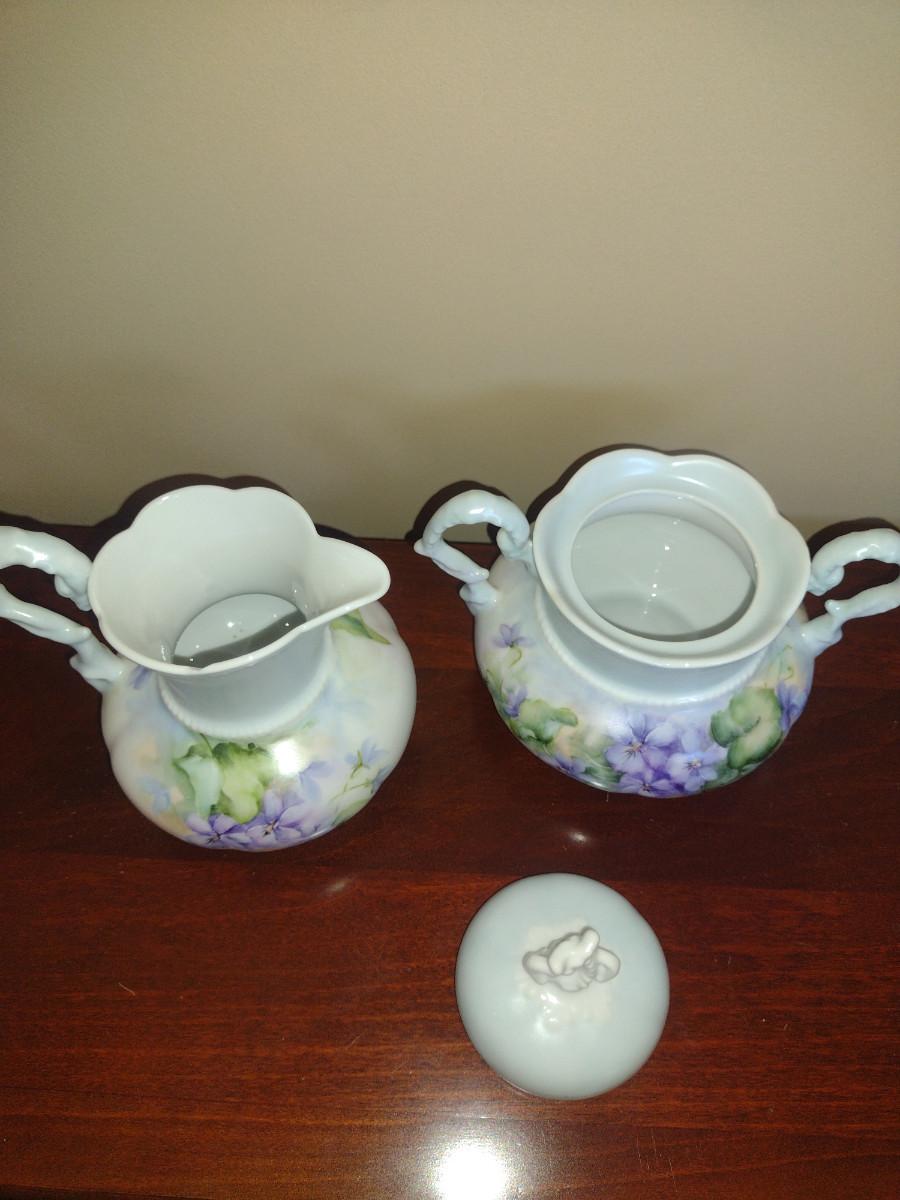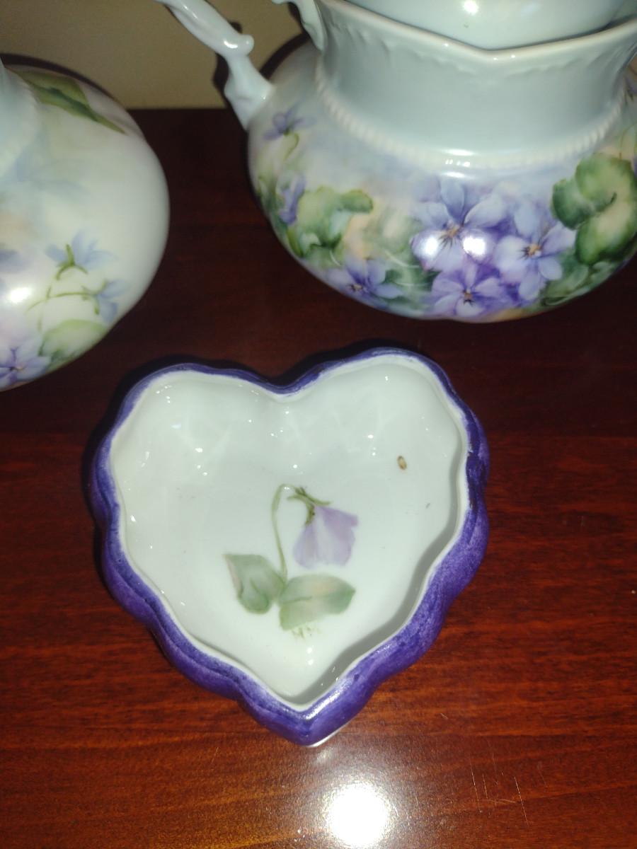 Hand Painted Porcelain House Wares- Creamer, Covered Sugar Bowl, and Heart Shaped Trinket Box. Creamer appears to have chipped edge- please see all pictures.