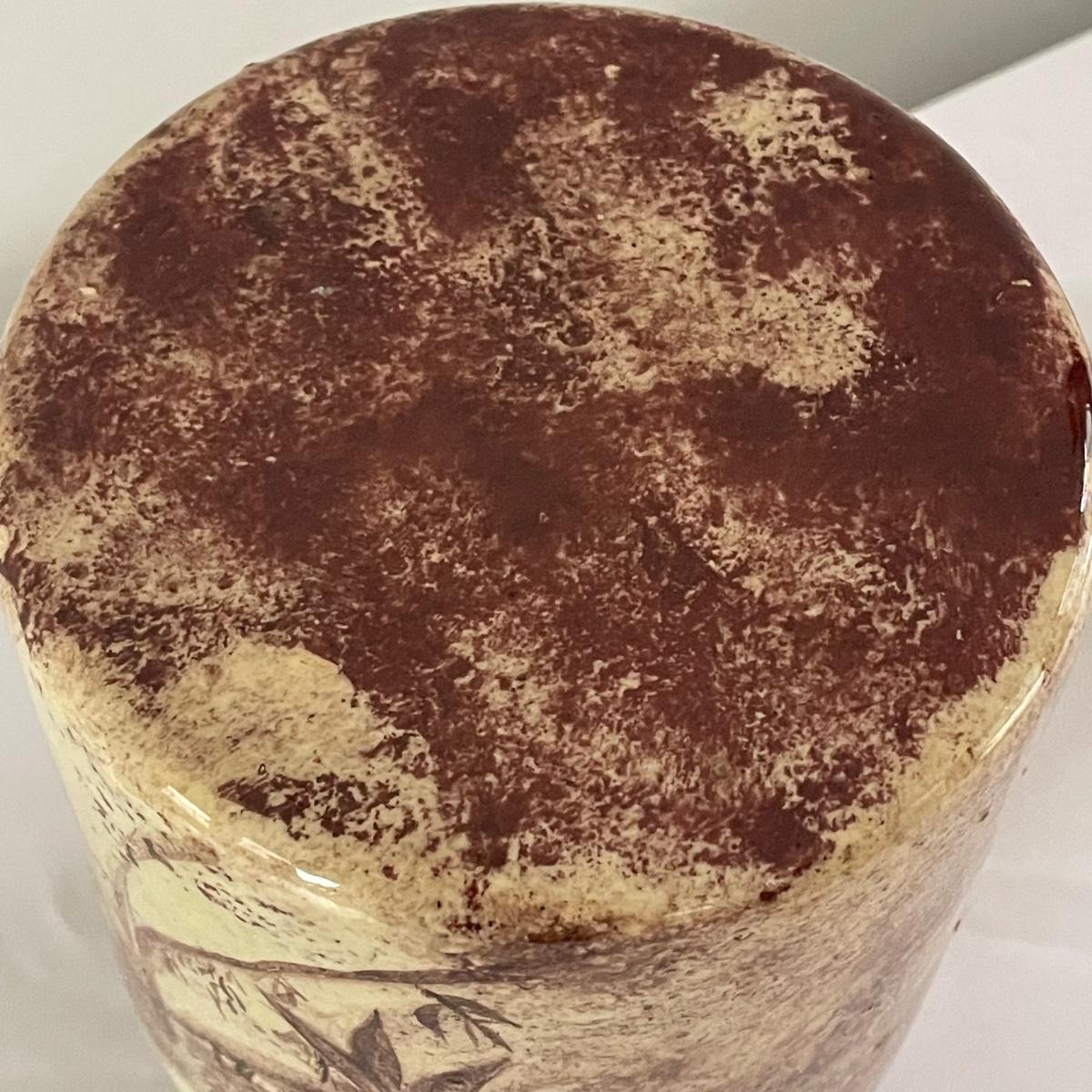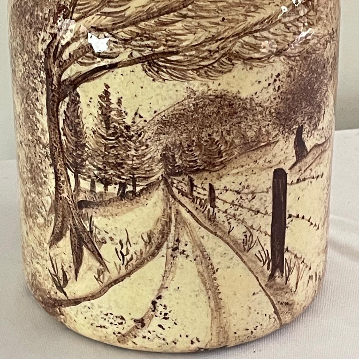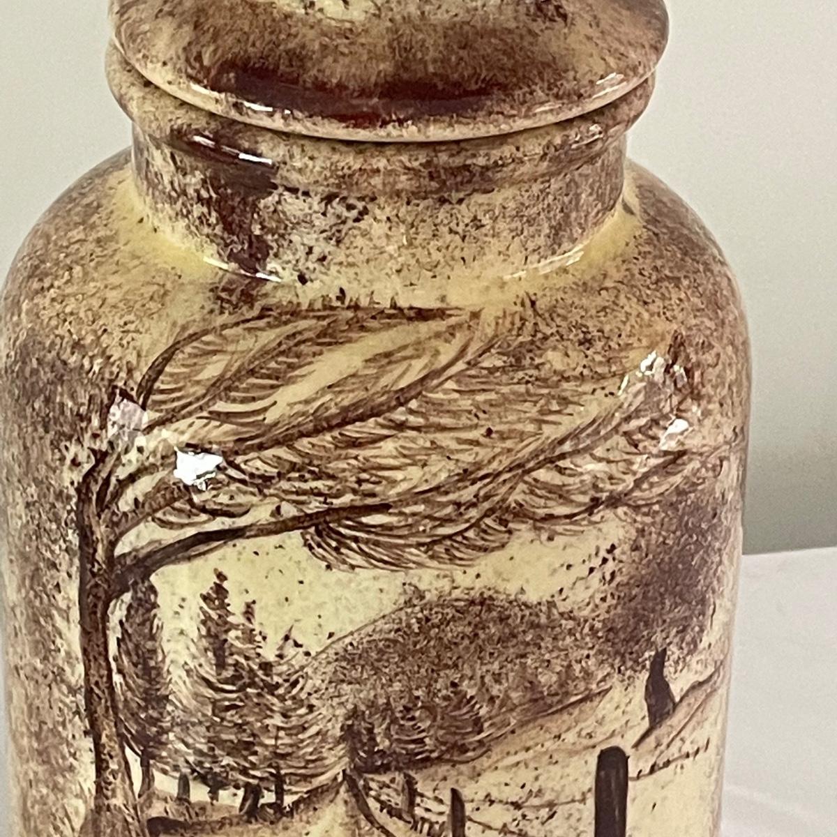 A lot of work went into this hand painted canister so its surprising that it is not signed. A beautiful piece regardless, it measures 5” d x 9.5” tall.
