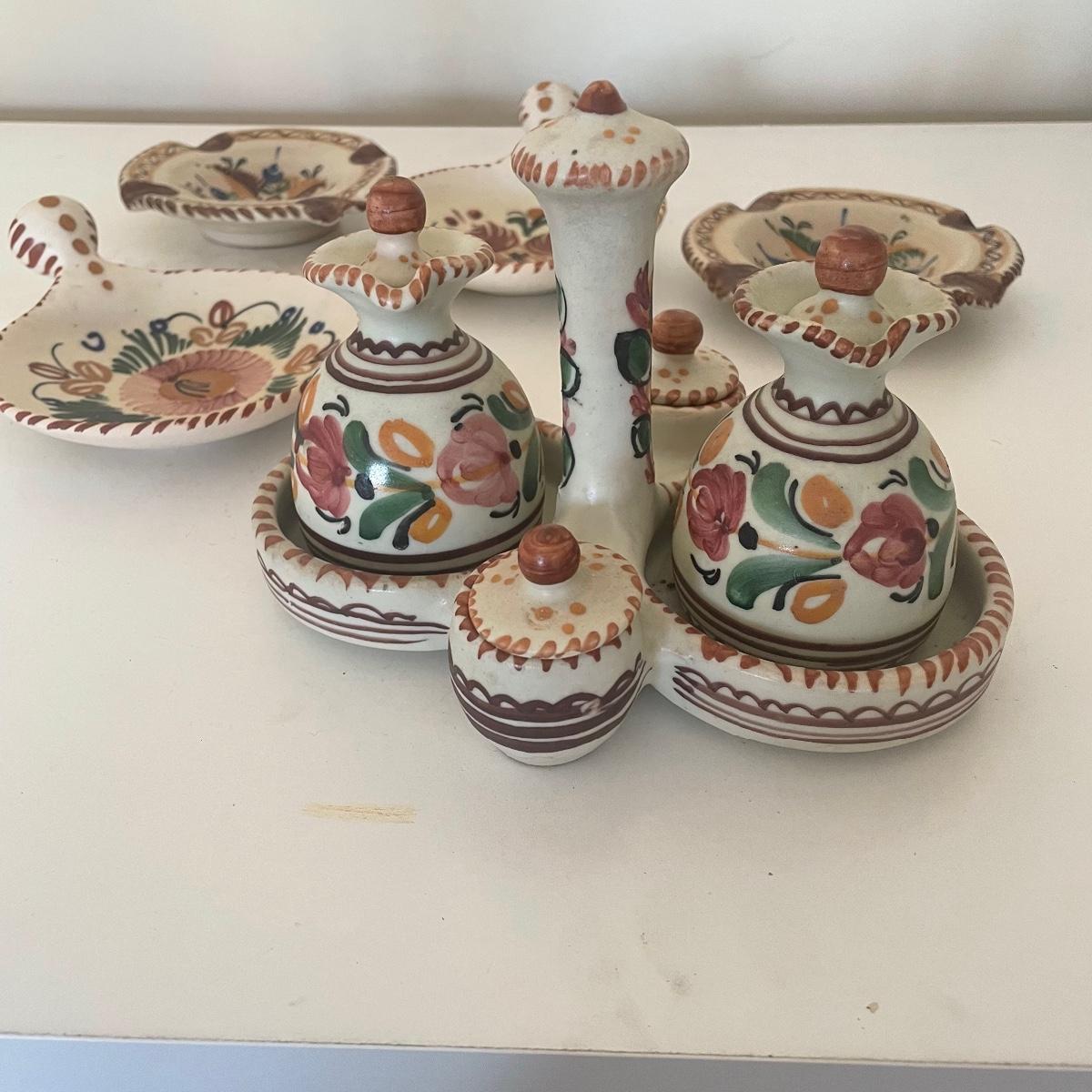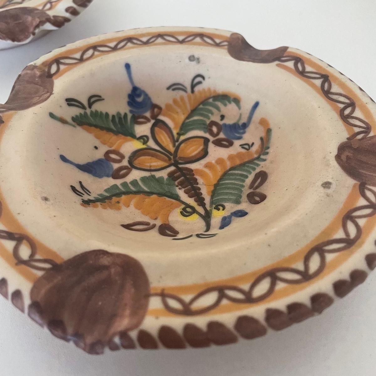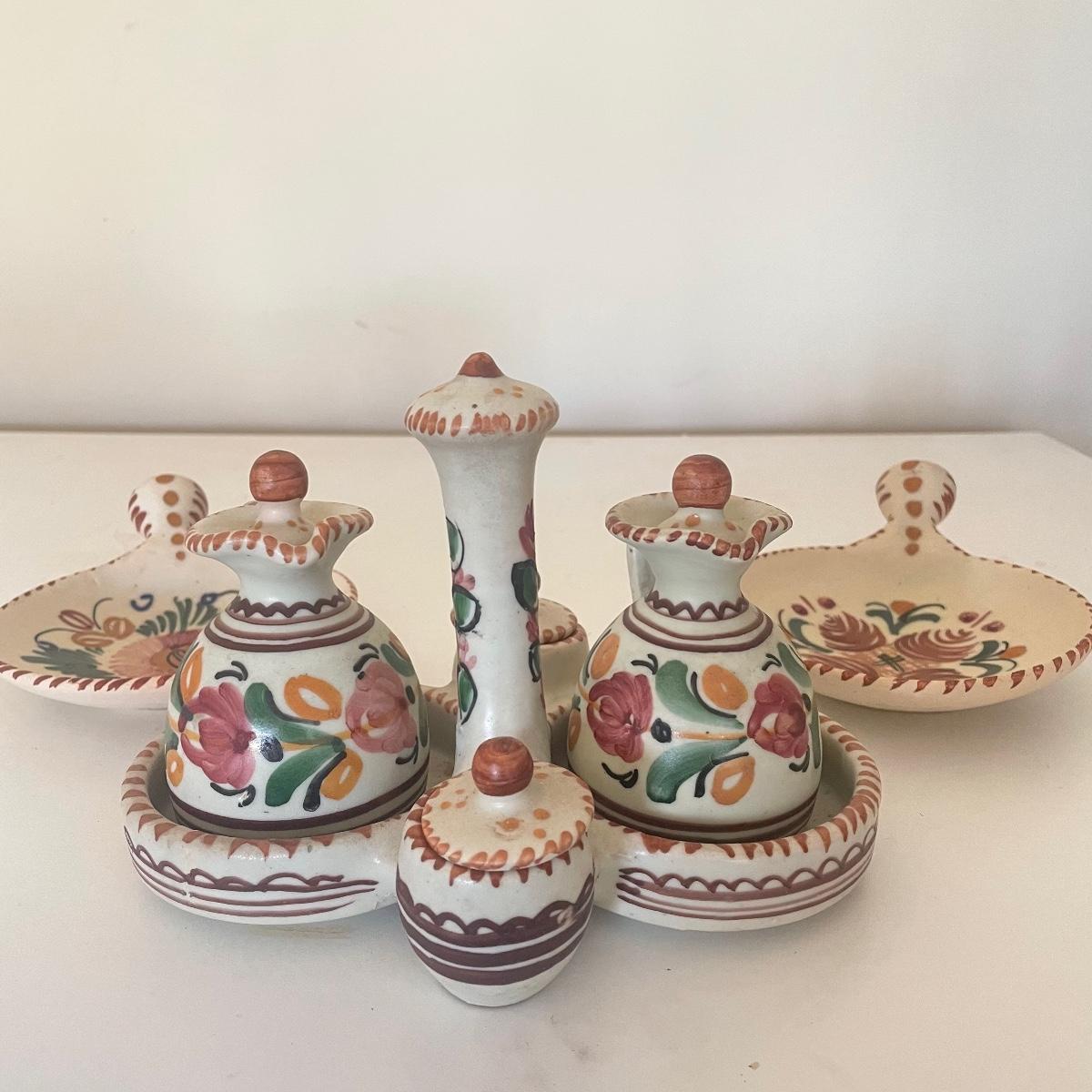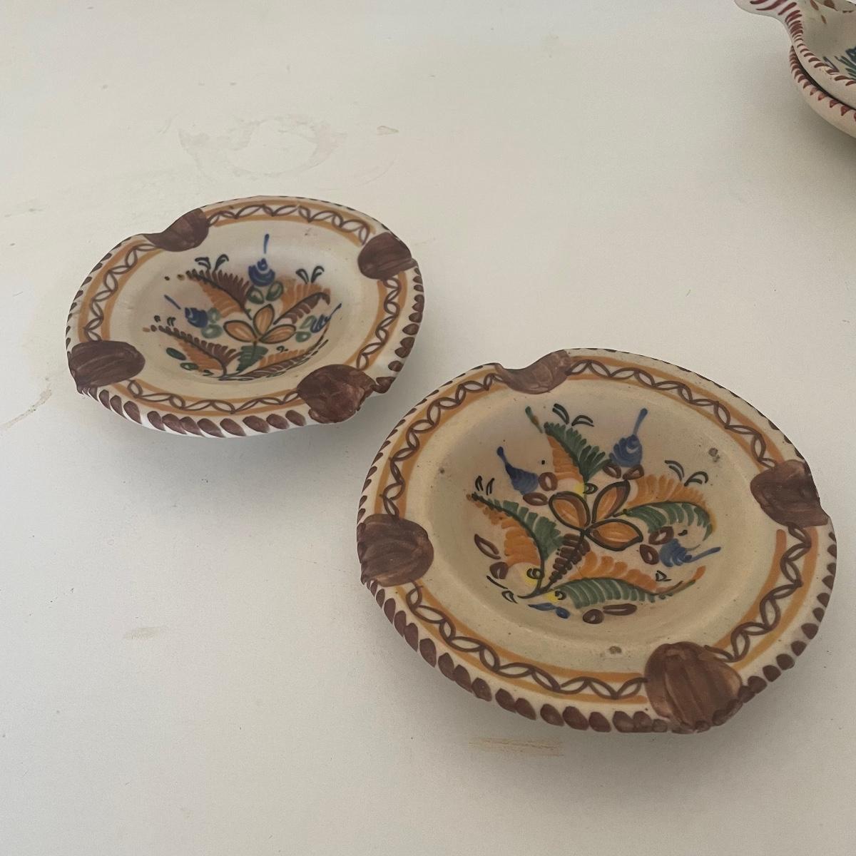 The condiment holder and pair of handled dish’s are signed LH, the two ashtrays appear to have a different signature. All are hand painted pottery. Condiment holder measures 6” x 8” x 6”.