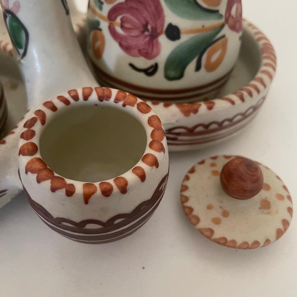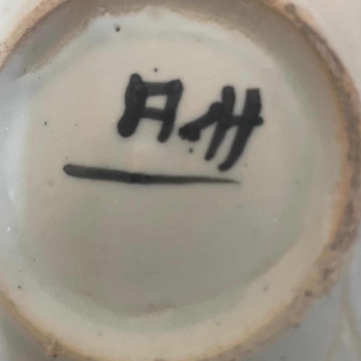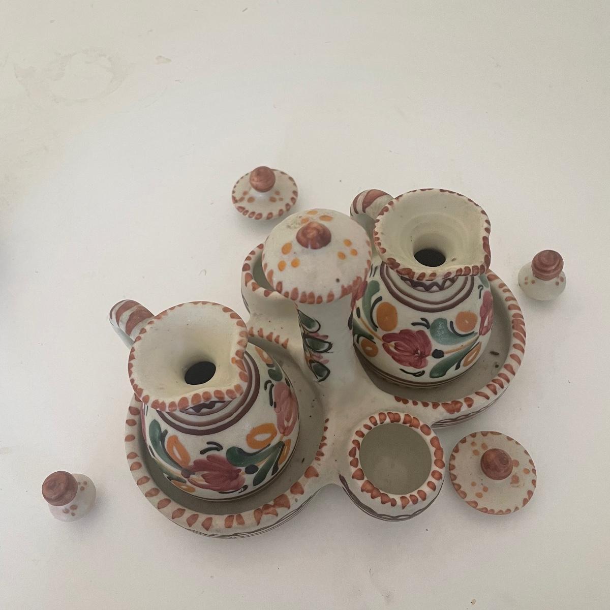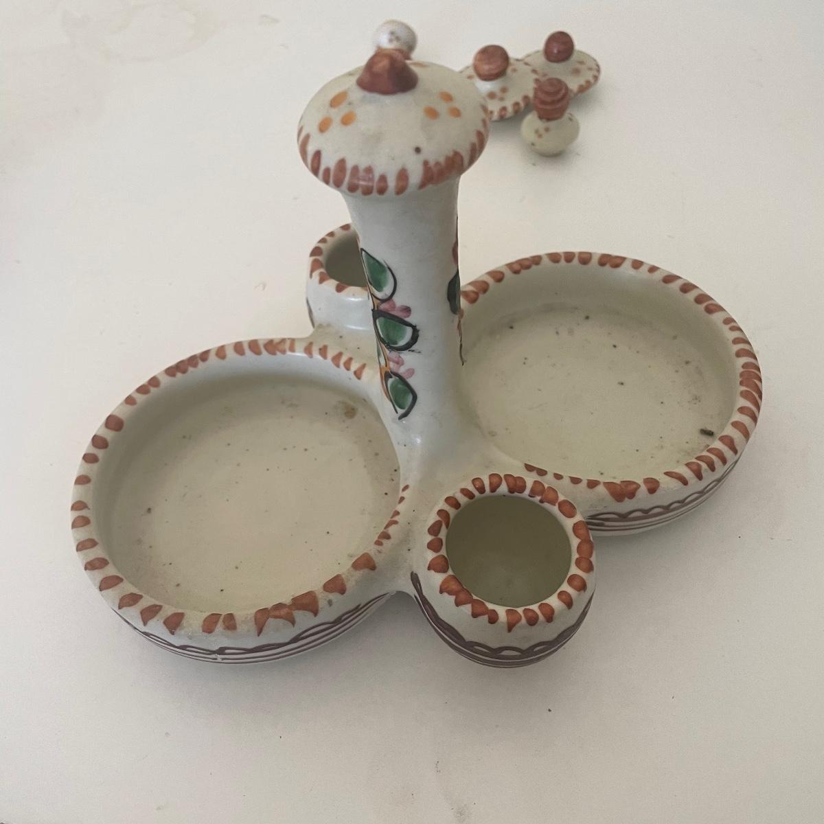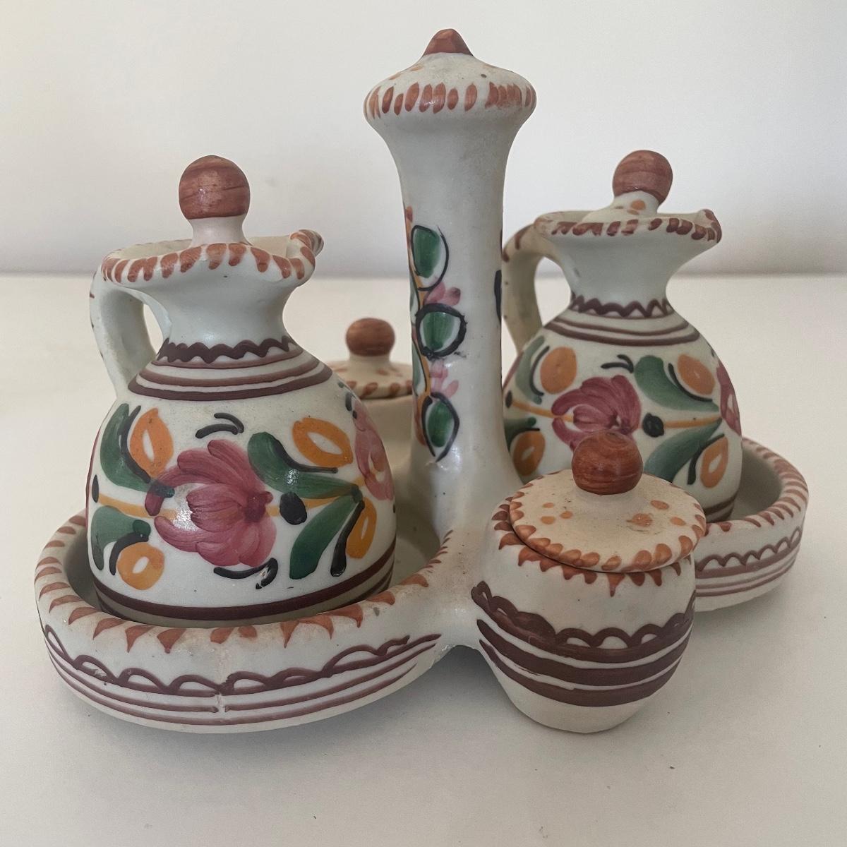 The condiment holder and pair of handled dish’s are signed LH, the two ashtrays appear to have a different signature. All are hand painted pottery. Condiment holder measures 6” x 8” x 6”.