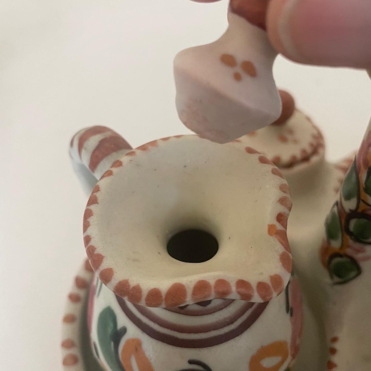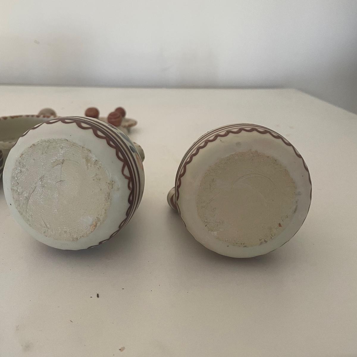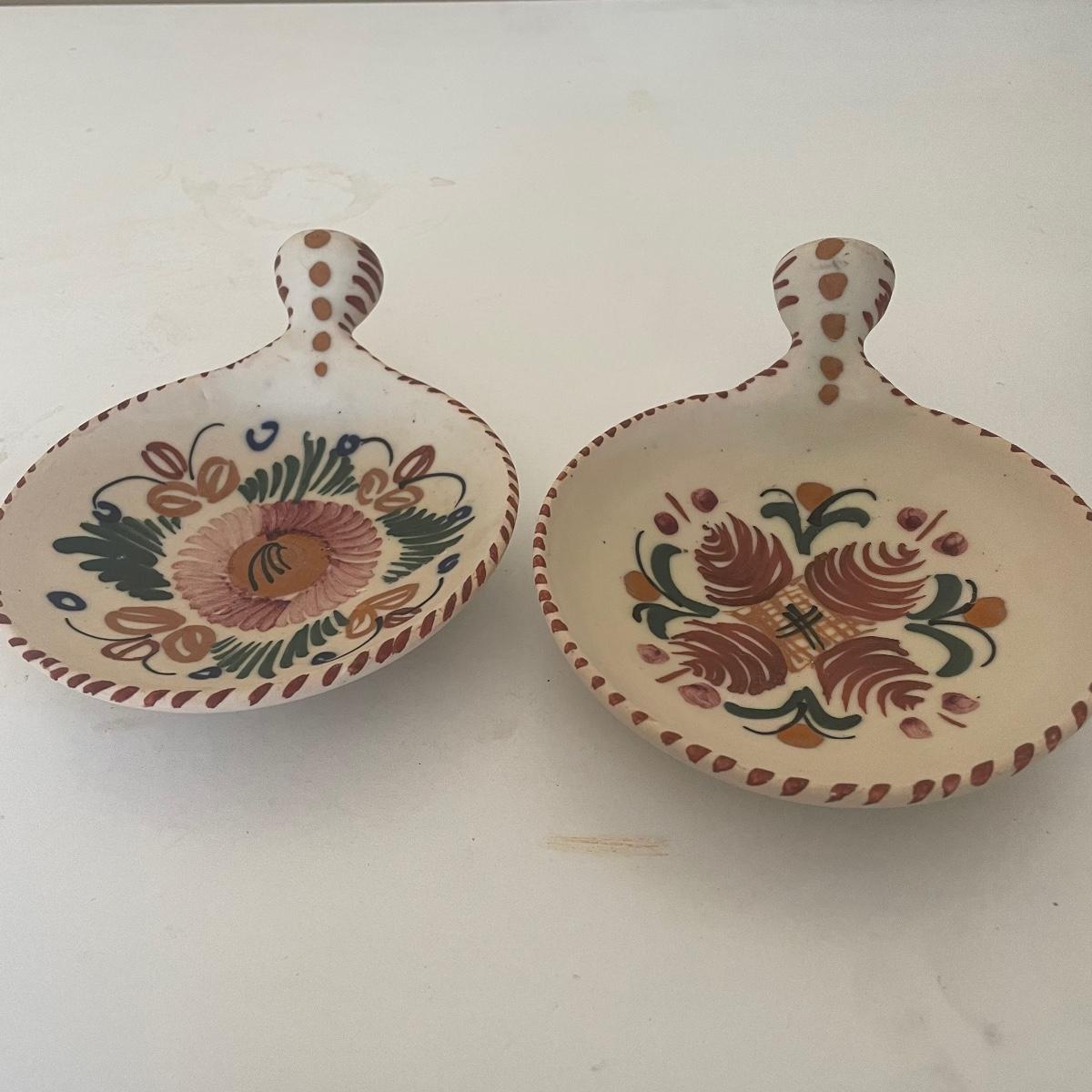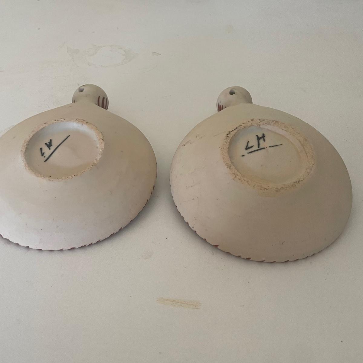 The condiment holder and pair of handled dish’s are signed LH, the two ashtrays appear to have a different signature. All are hand painted pottery. Condiment holder measures 6” x 8” x 6”.