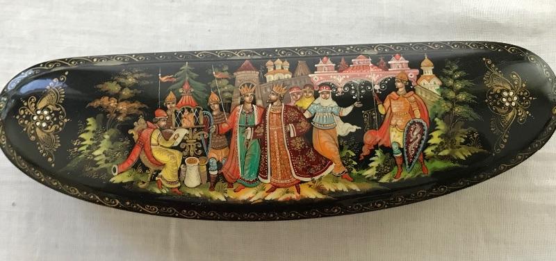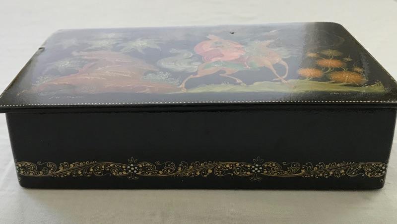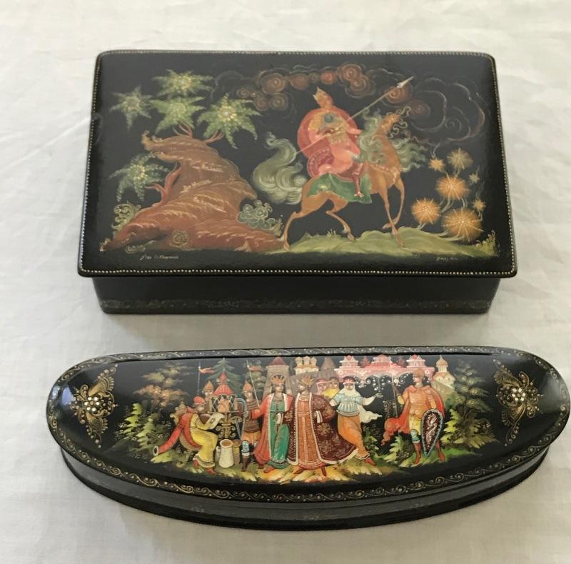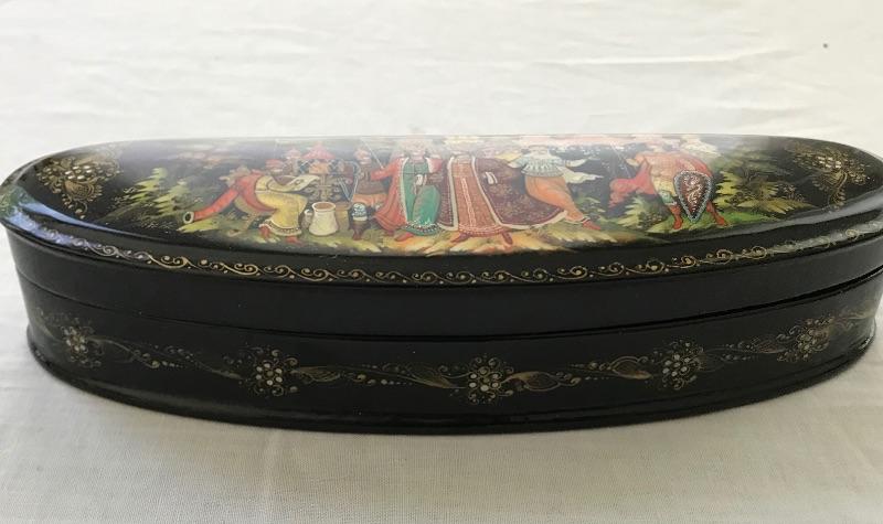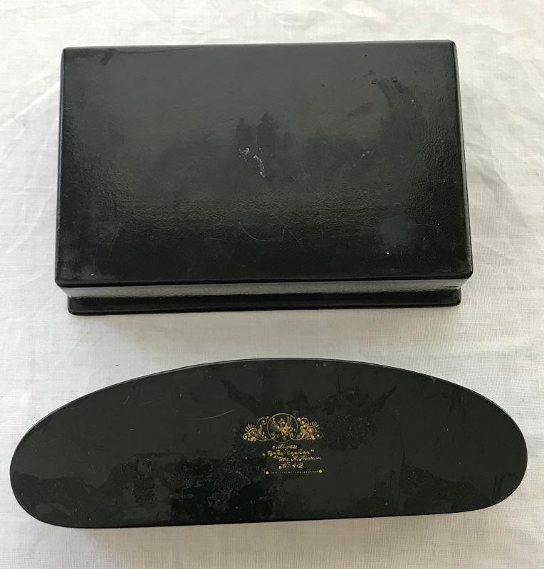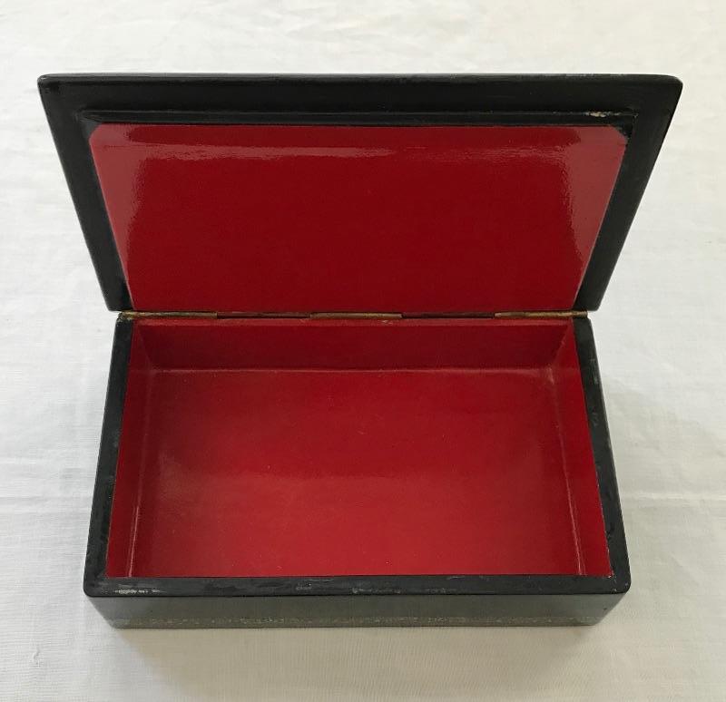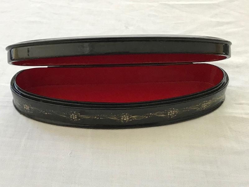 Rectangle box measures 6-3/4” long 4-1/4” wide and 2” deep. Oblong 7-3/4” long 2-1/2” wide and 2” deep