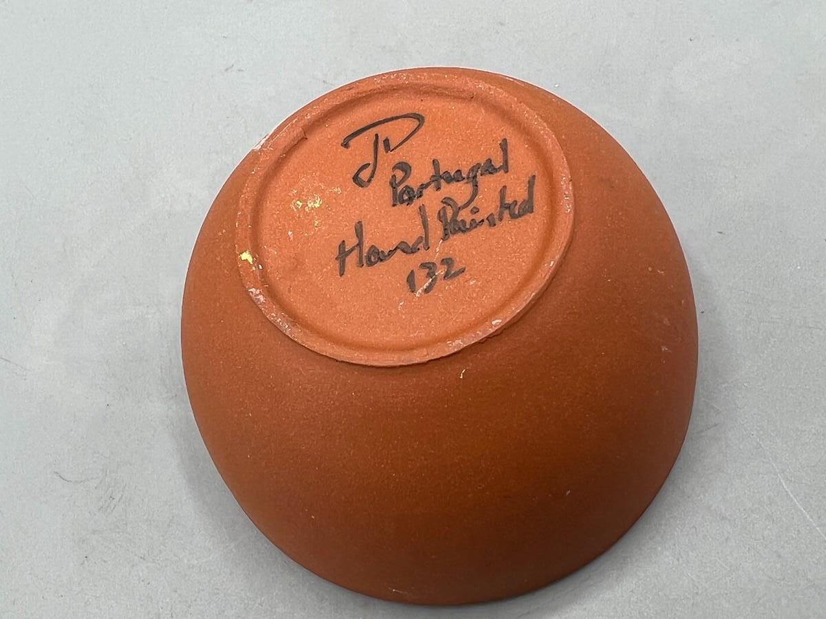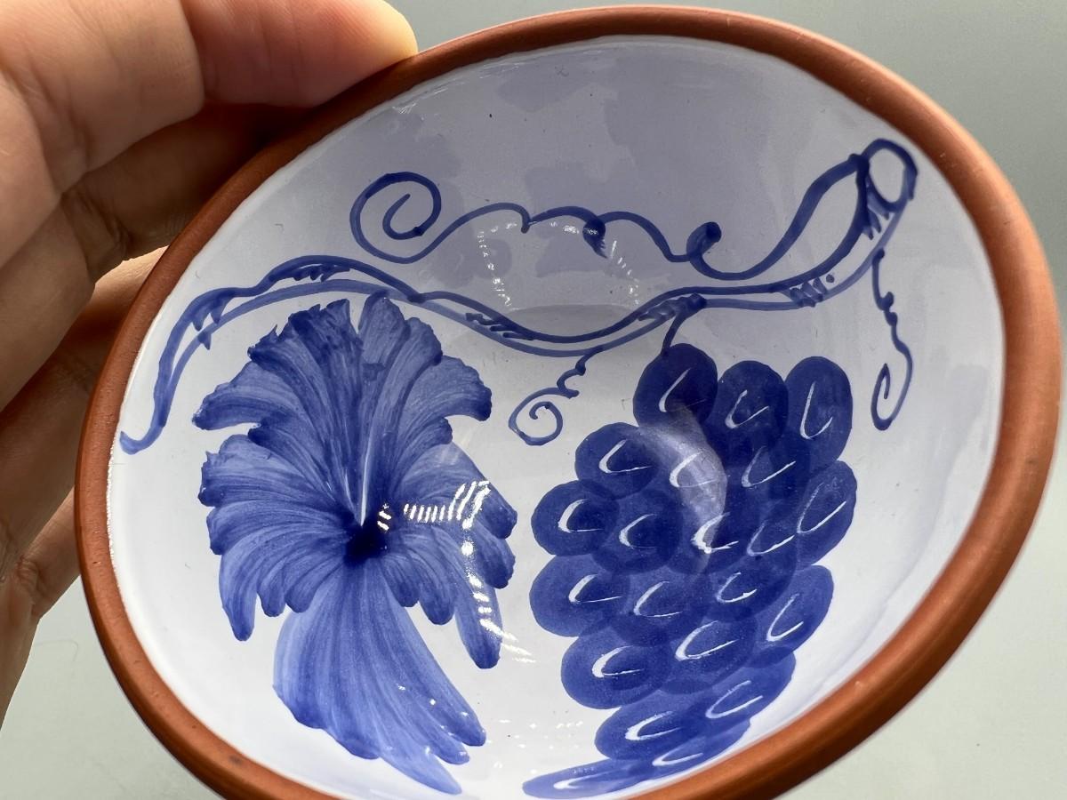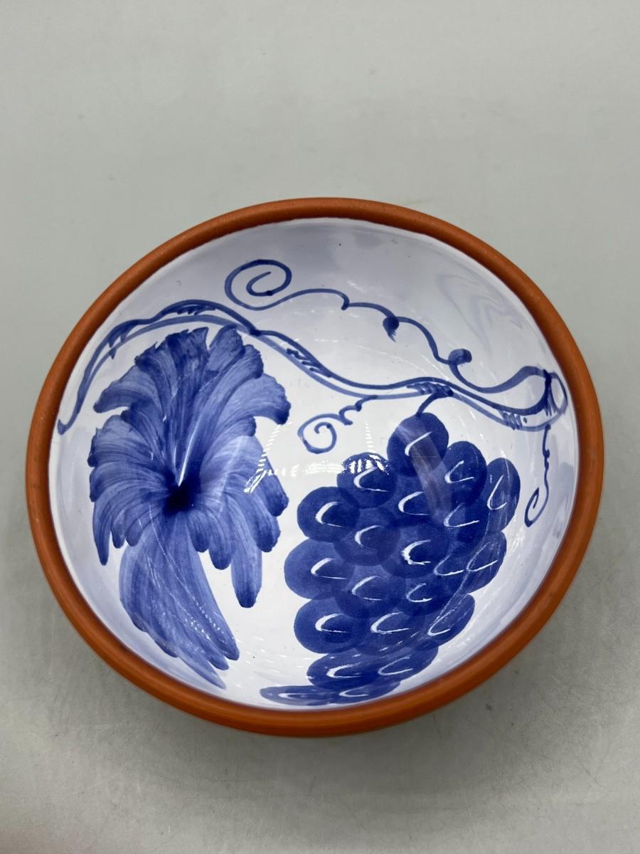 Hand Painted Small Terra Cotta Bowl Blue Grapevine Pattern Portugal