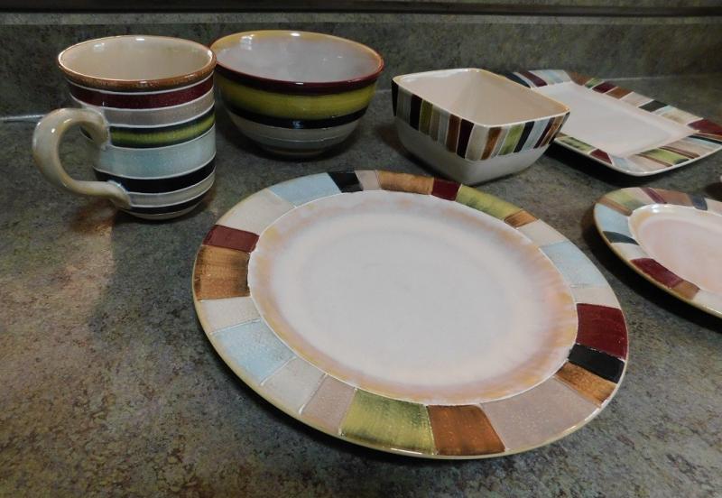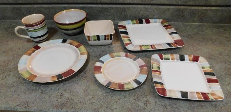Hand Painted Table Tops Sentry Dish Set 4 Place Setting in good condition. Stylish and contemporary.