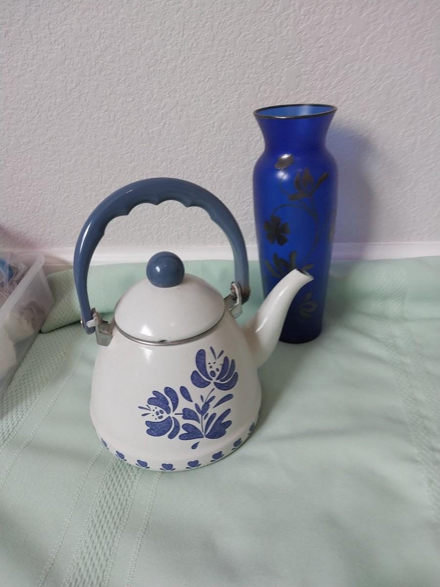 HAND PAINTED TEAPOT-CLAY CREAMER-ETCHED BLUE VASE AND DECROTIVE BASKET