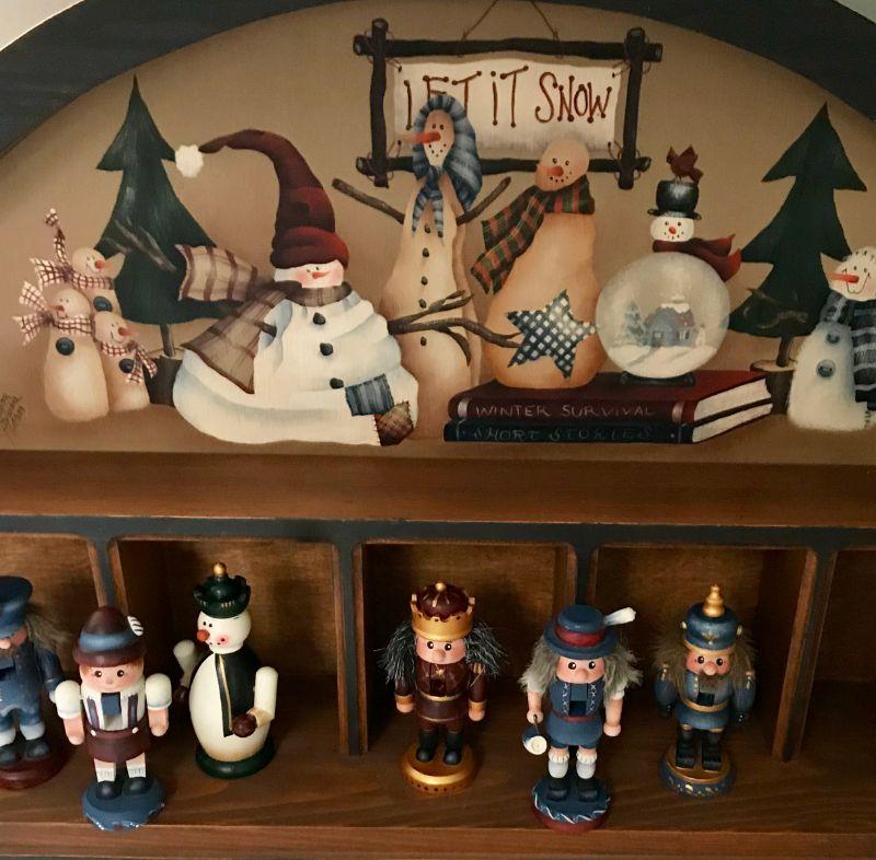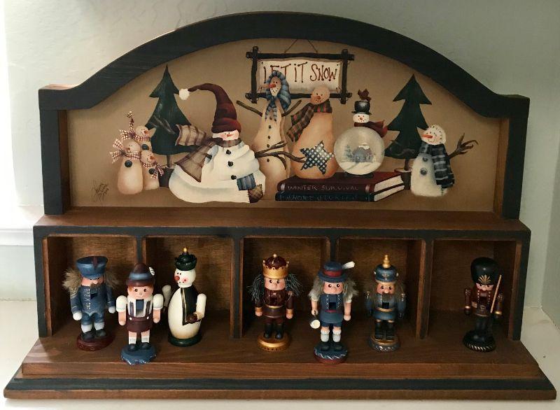 Hand Painted Tole Style Christmas Display Shelf With Figures By Sylviane Giacoletto