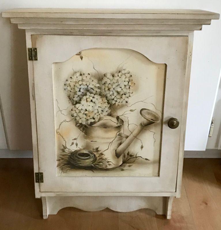 Hand Painted Tole Style White Cabinet With Watering Can By Sylviane Giacoletto