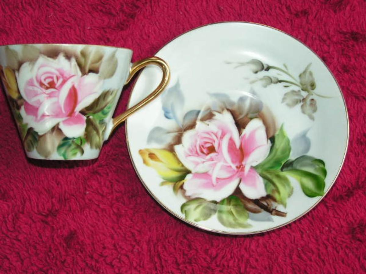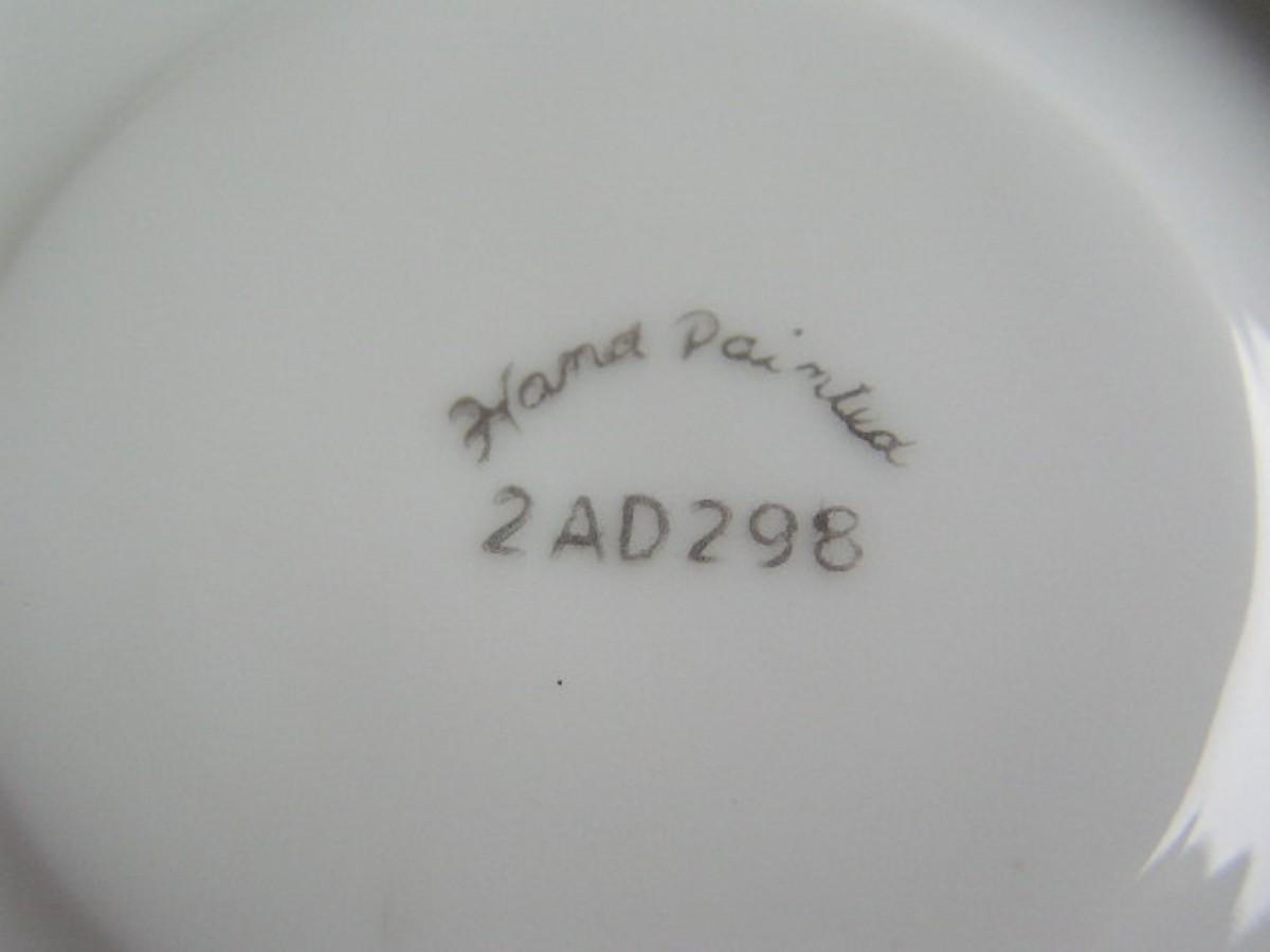 Hand painted (#2AD298) vintage (?Japan?) more traditional Japanese style teacup & saucer, porcelain, gold trimmed. Unknown manufacturer?