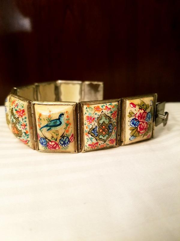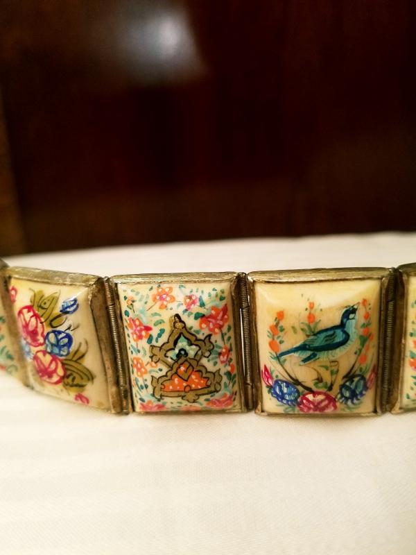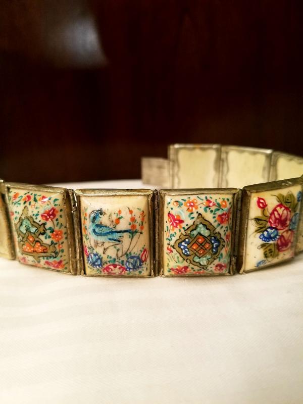 Each tile is hand painted with various scenes of flowers emblems and birds. set in a silver covered metal bezel setting. Absolutely Stunning craftsmanship. Very unique since no two are exactly alike. They were purchased by servicemen stationed overseas during the war and brought back to loved ones.