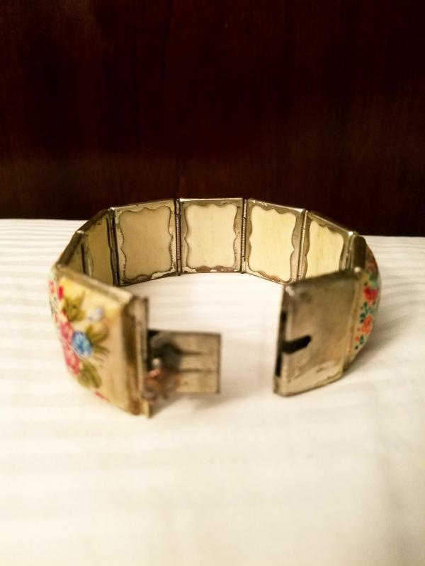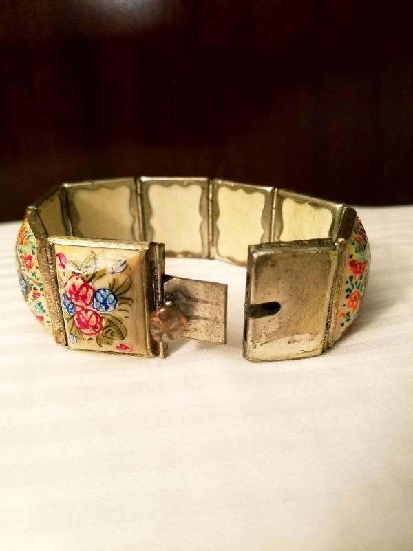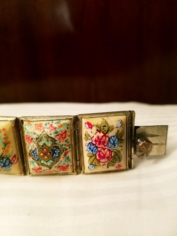 Each tile is hand painted with various scenes of flowers emblems and birds. set in a silver covered metal bezel setting. Absolutely Stunning craftsmanship. Very unique since no two are exactly alike. They were purchased by servicemen stationed overseas during the war and brought back to loved ones.