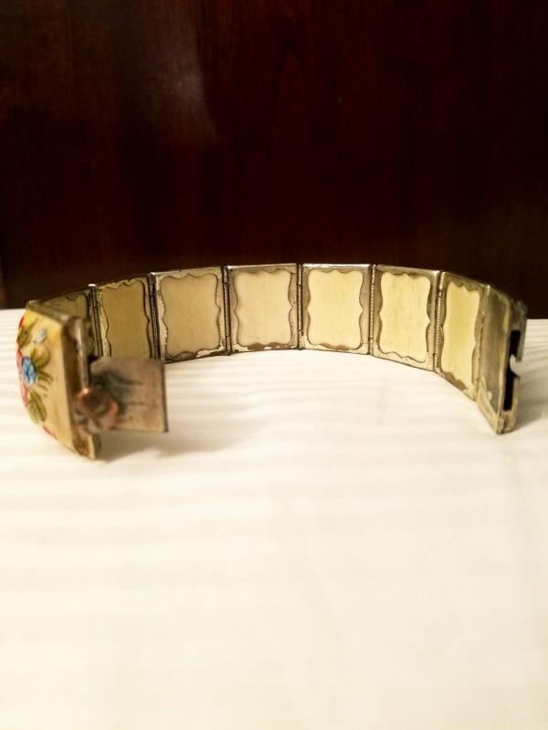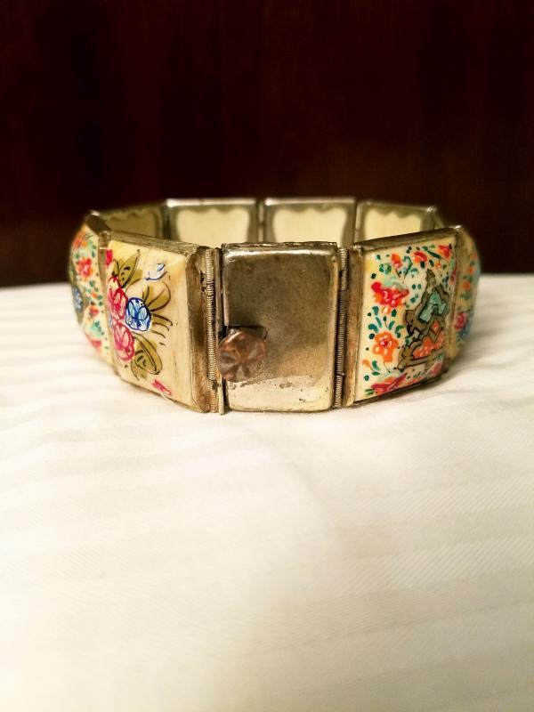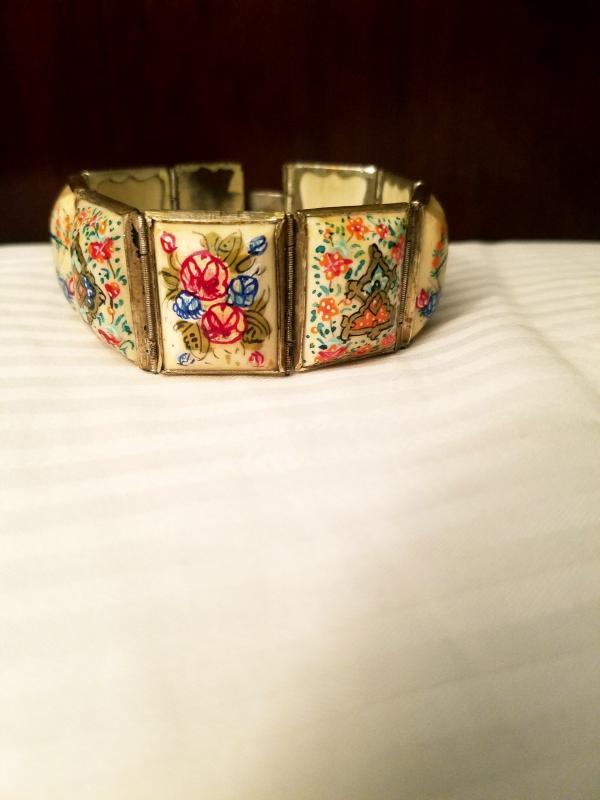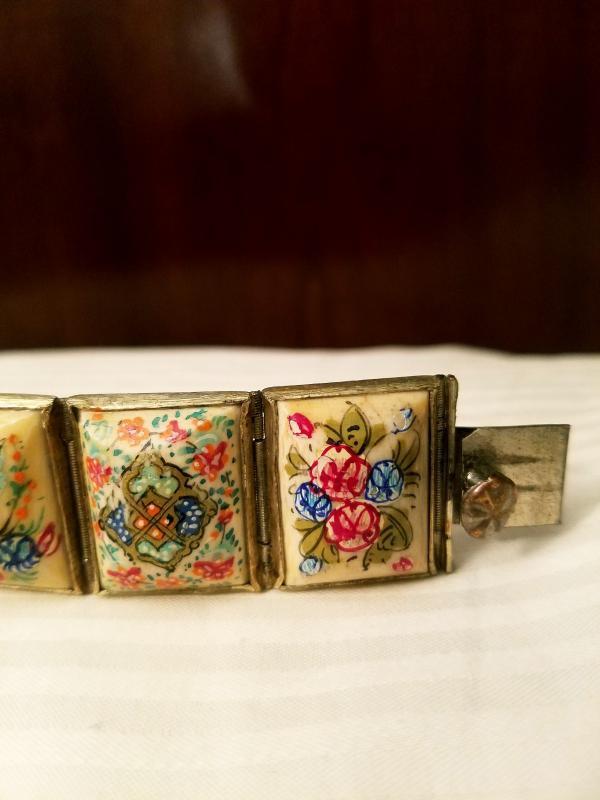 Hand painted vintage Persian 8 panel silver covered bracelet 1940's