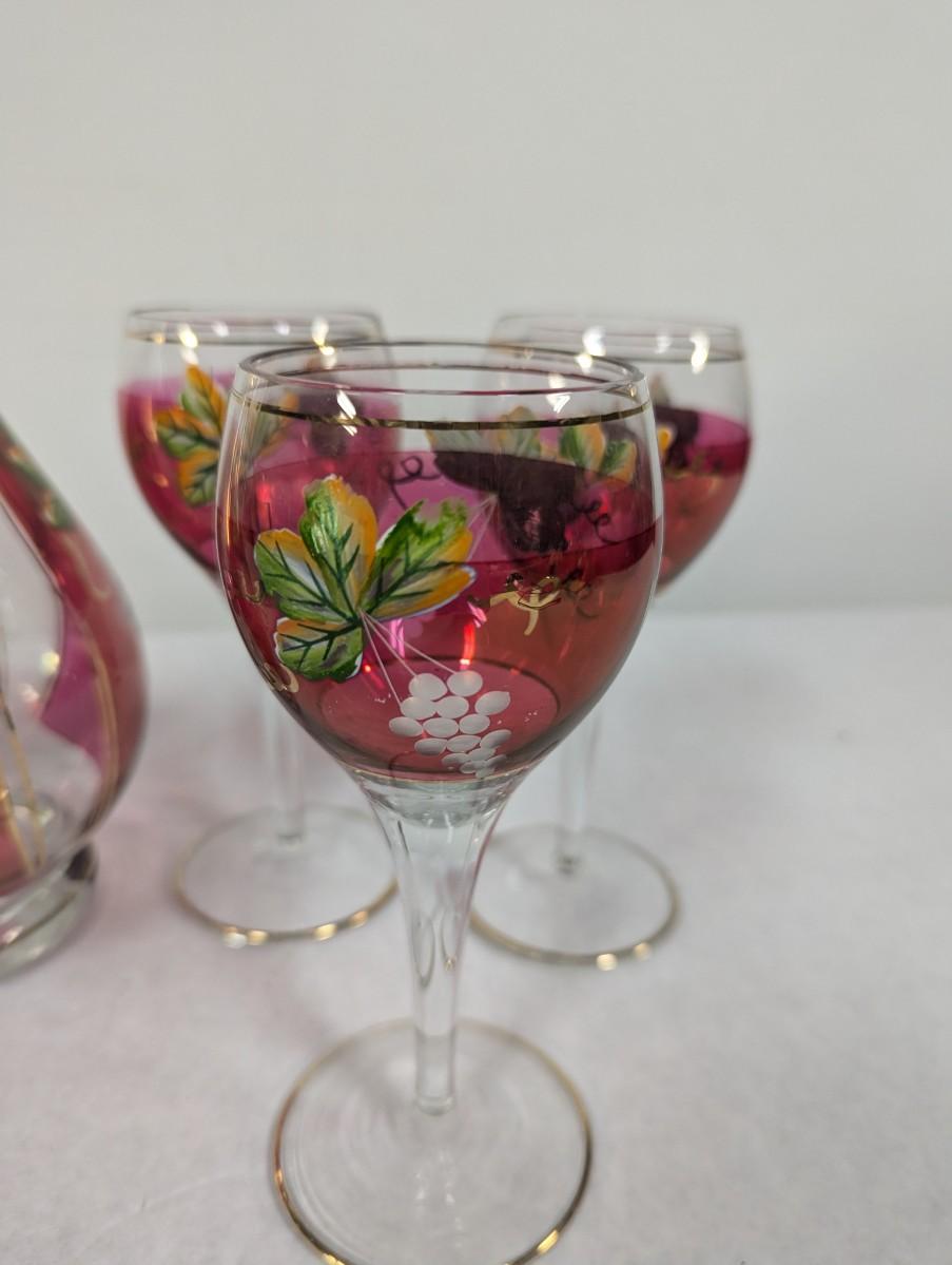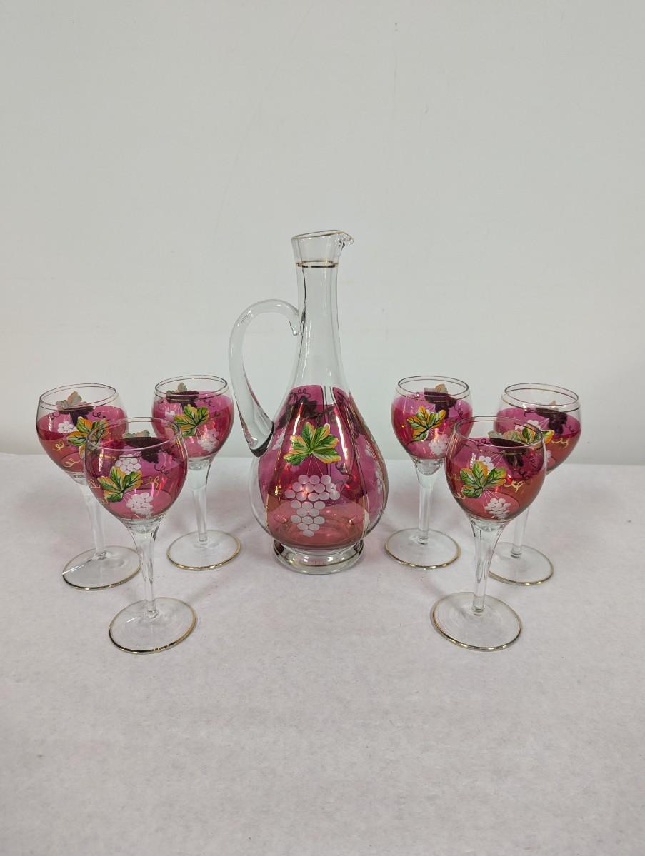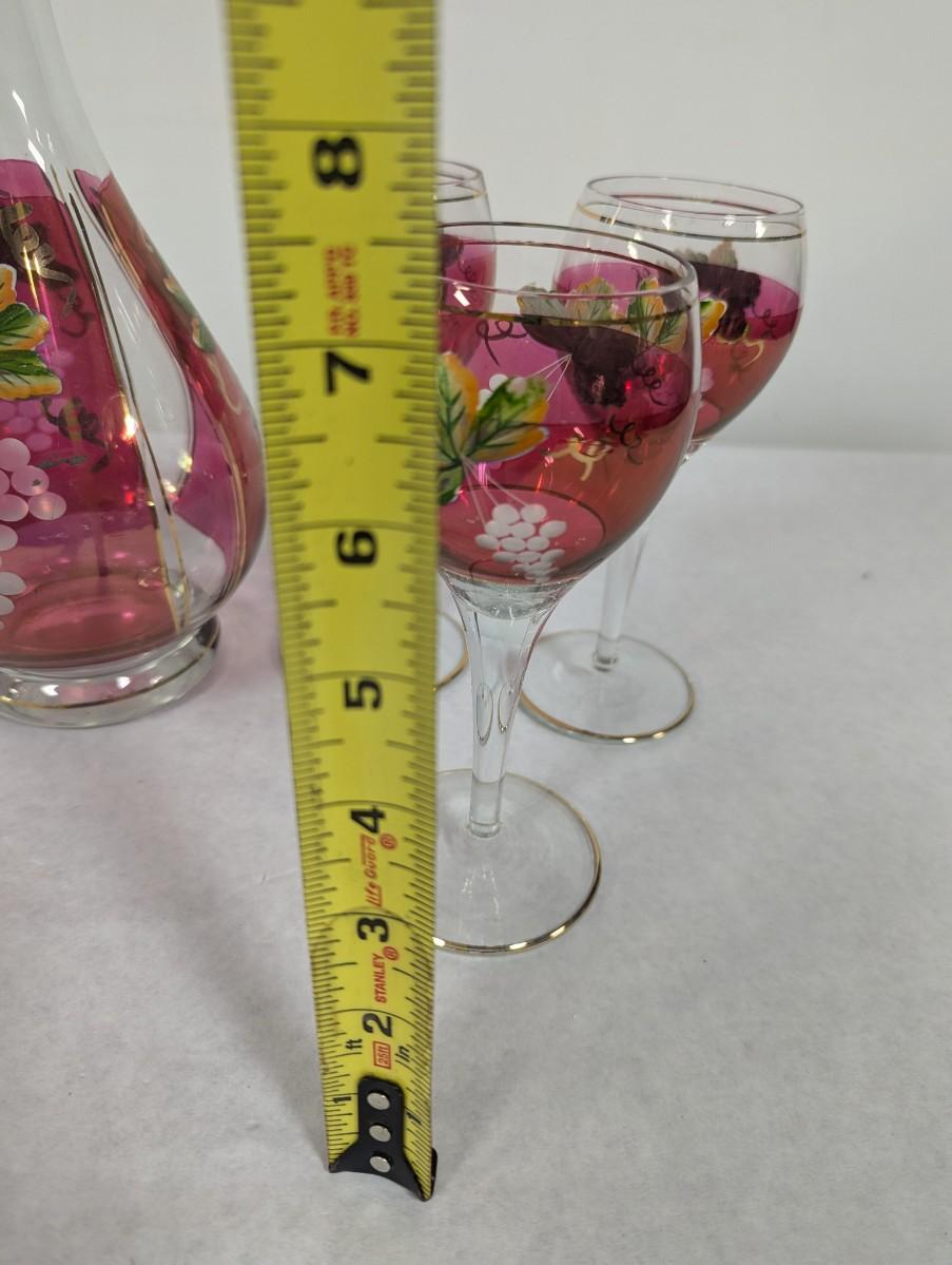 Hand Painted Vintage Wine Decanter & 6 Glasses