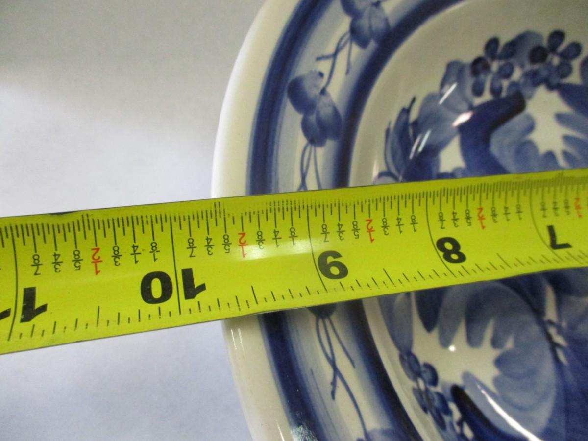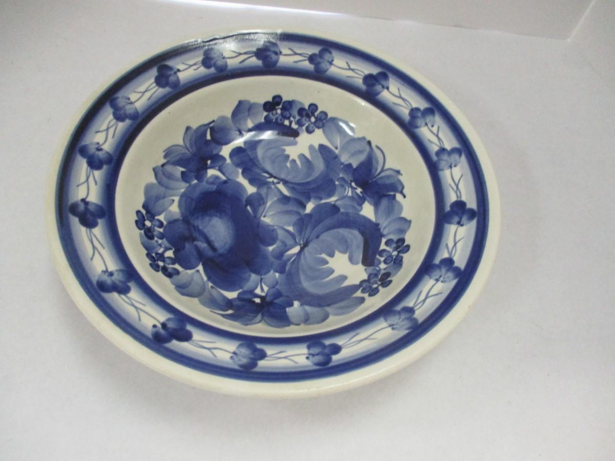 The product is a hand-painted vintage Wloclawek Fajans Polish pottery plate with a beautiful blue floral design. This piece of decorative cookware is crafted using traditional pottery techniques, adding charm and character to any table setting. The intricate blue floral pattern gives it a unique and traditional look that would make a lovely addition to any collection of pottery and glass items. Perfect for serving meals or as a standalone decorative piece.