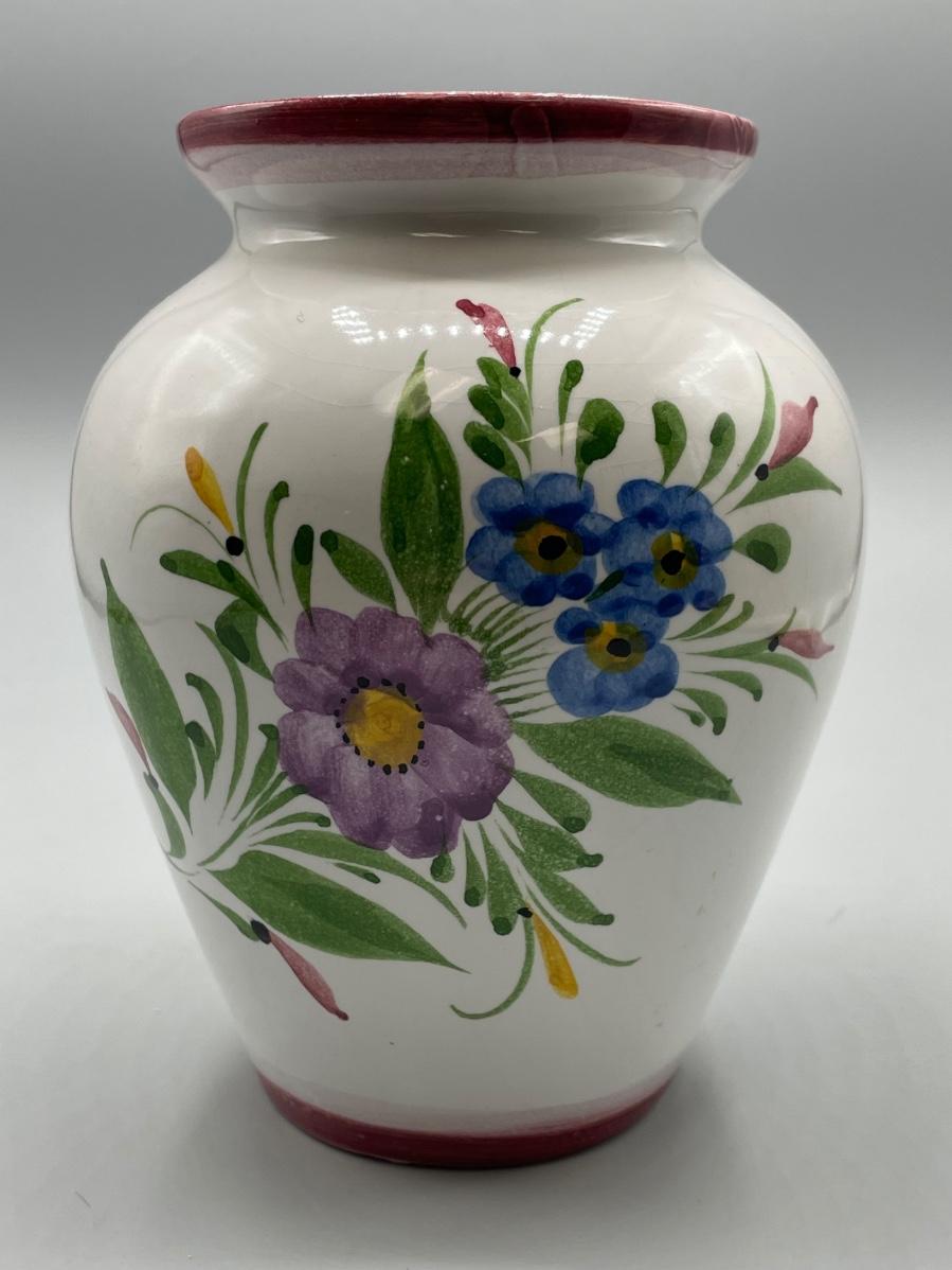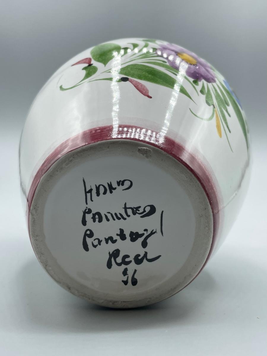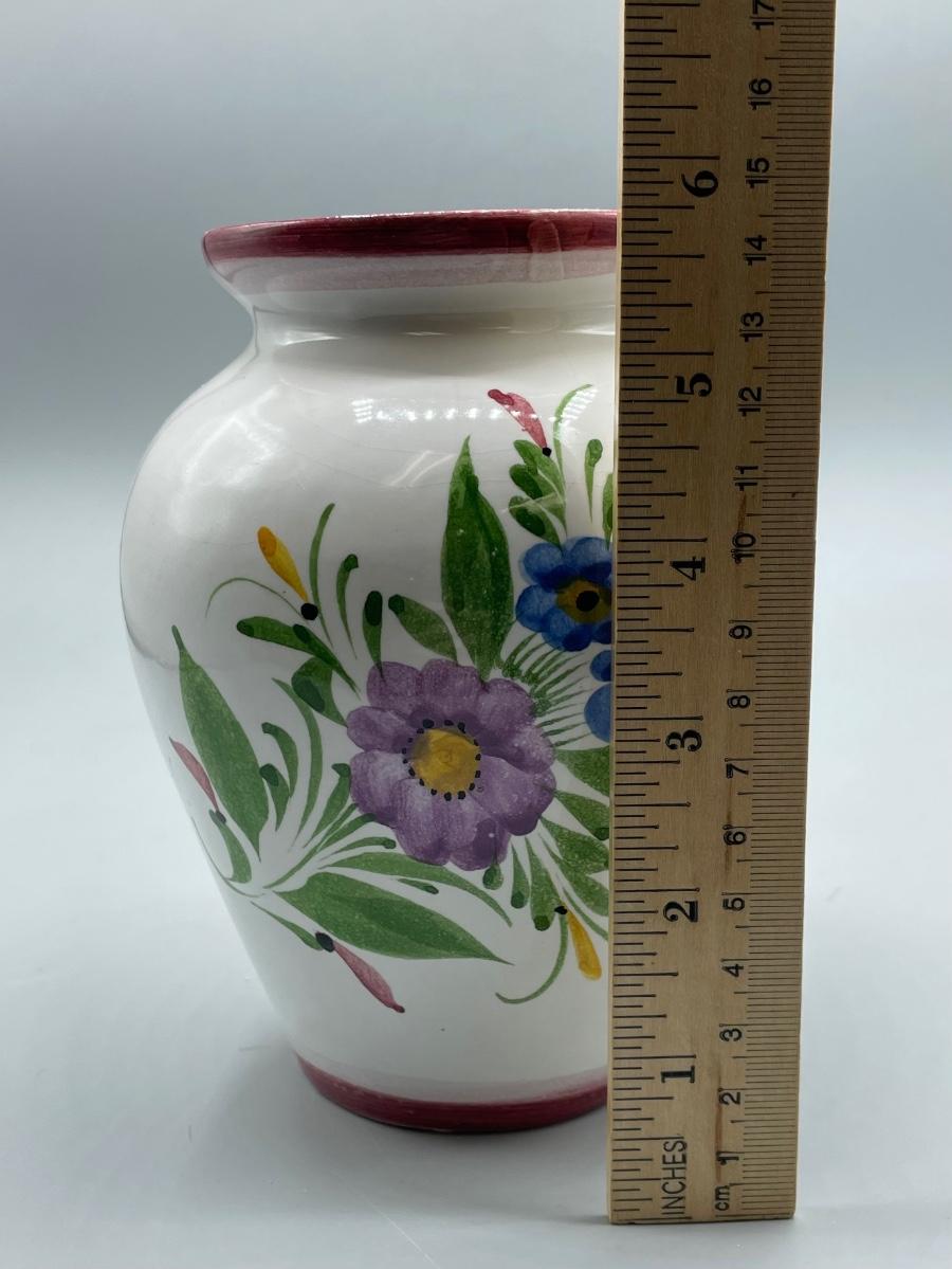 This item is in good condition. It’s hand painted but it has a few faded spots on it. The pottery is approximately 6” tall. There is two of the same floral designs on both sides.
