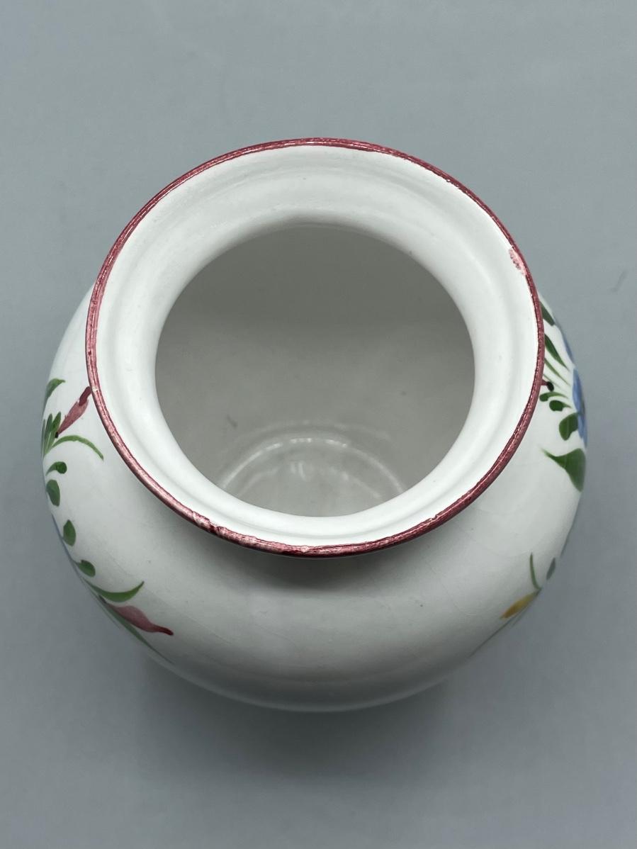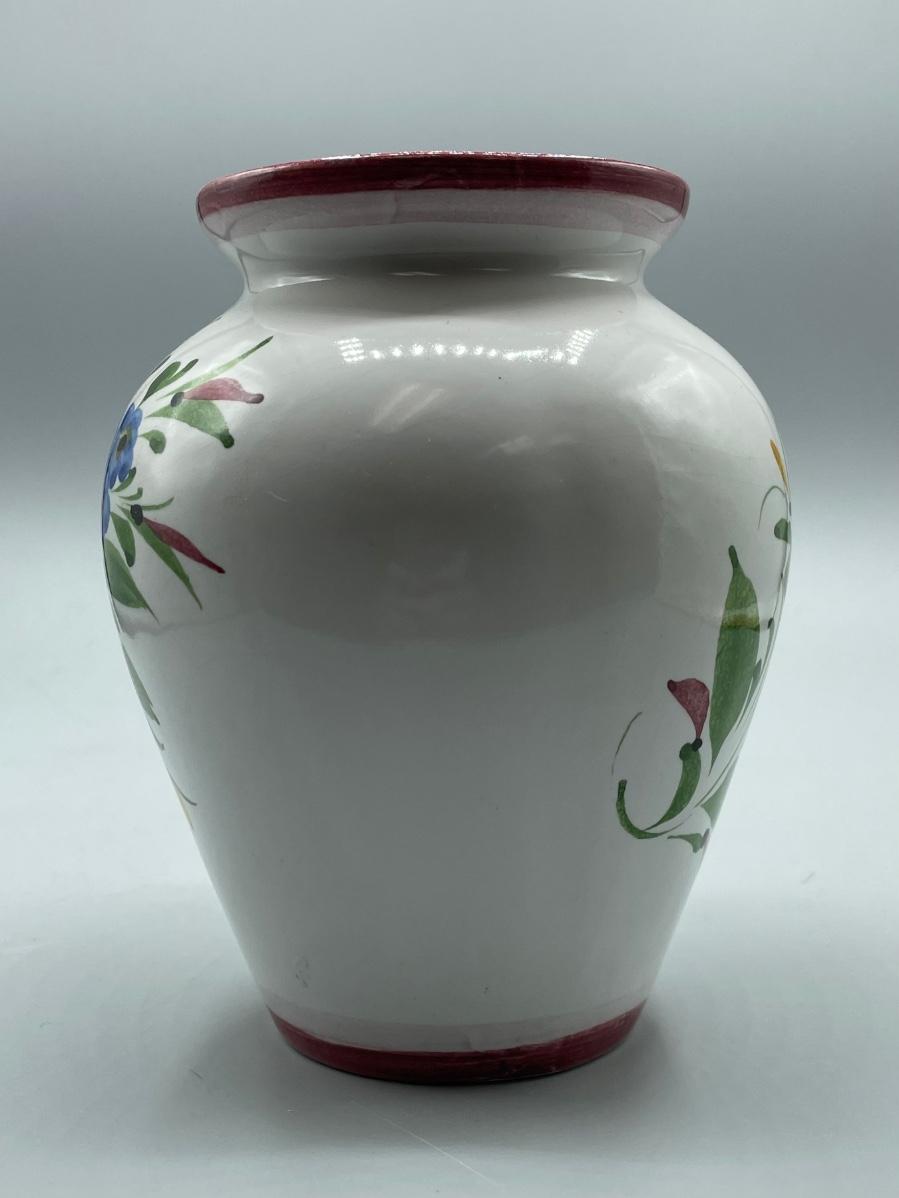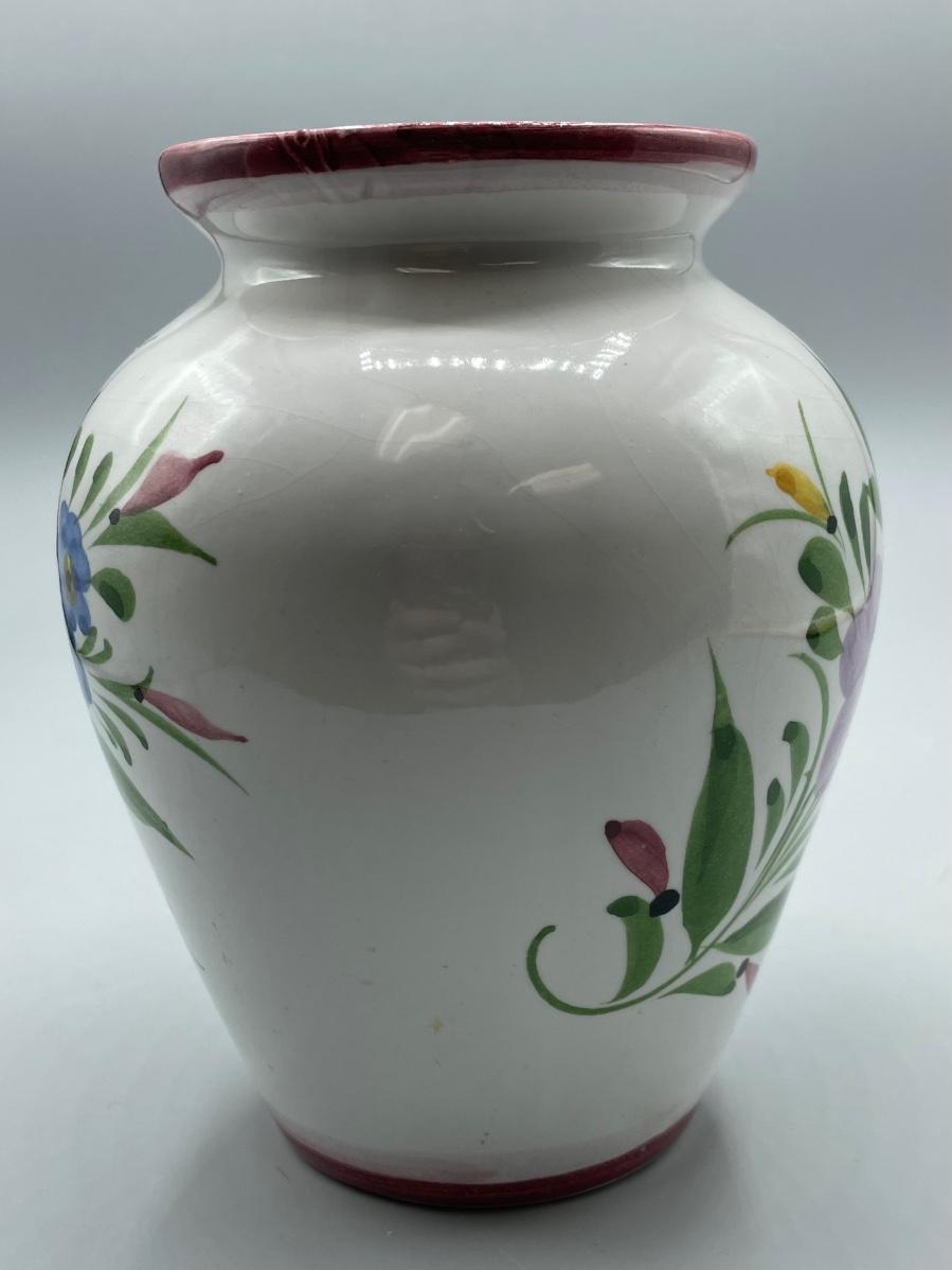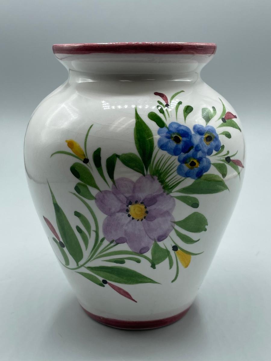 This item is in good condition. It’s hand painted but it has a few faded spots on it. The pottery is approximately 6” tall. There is two of the same floral designs on both sides.
