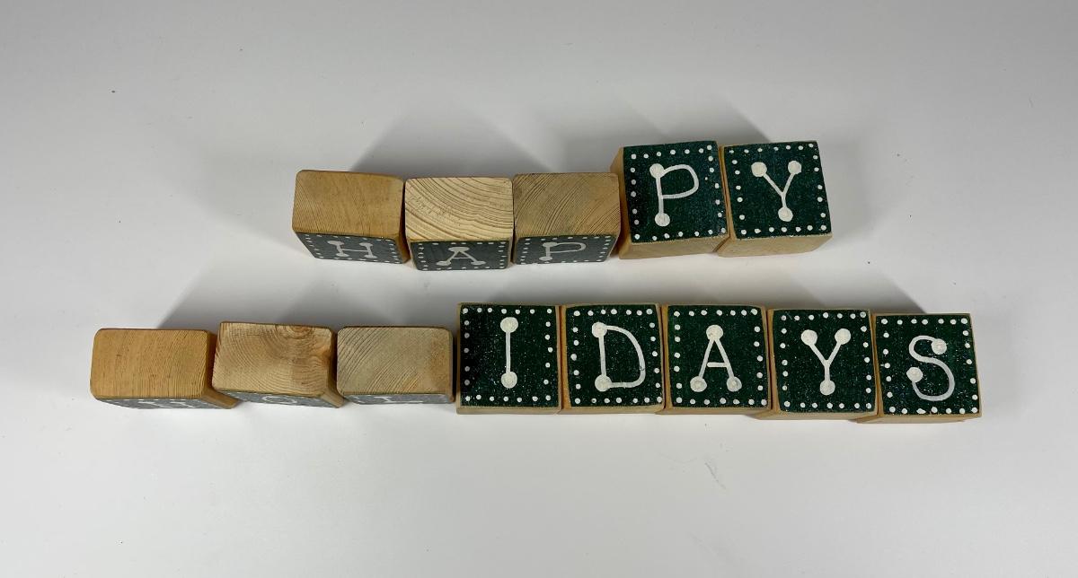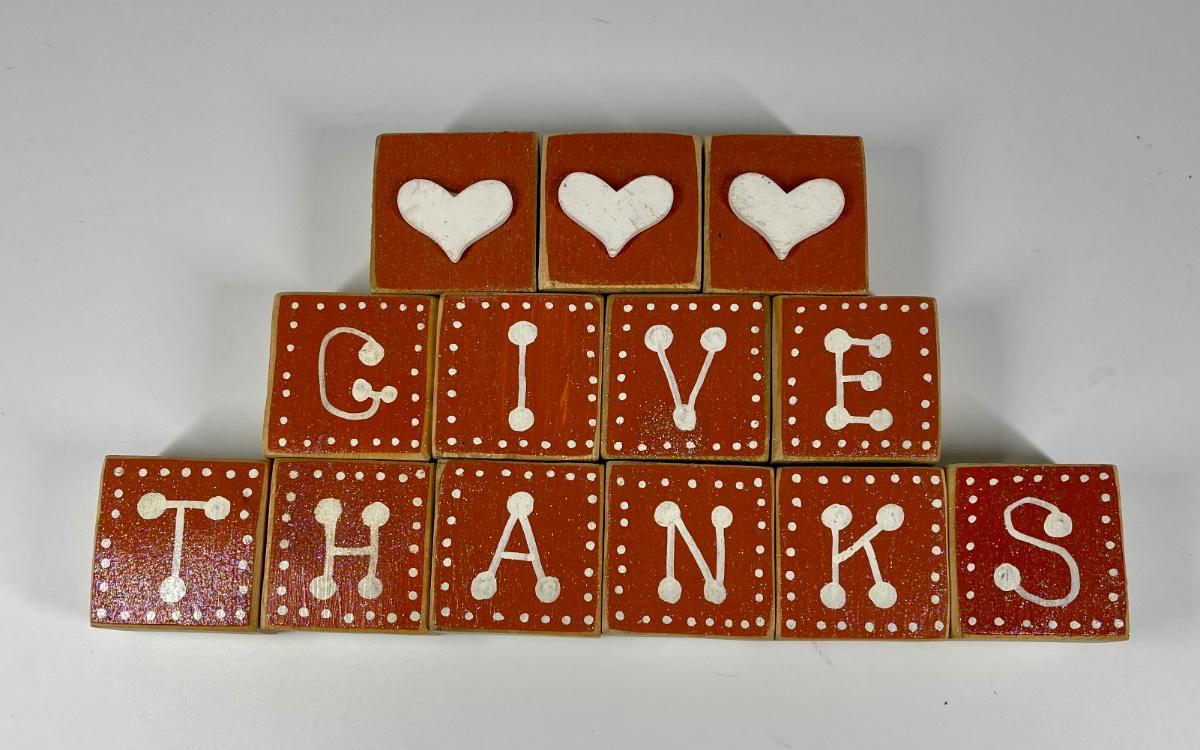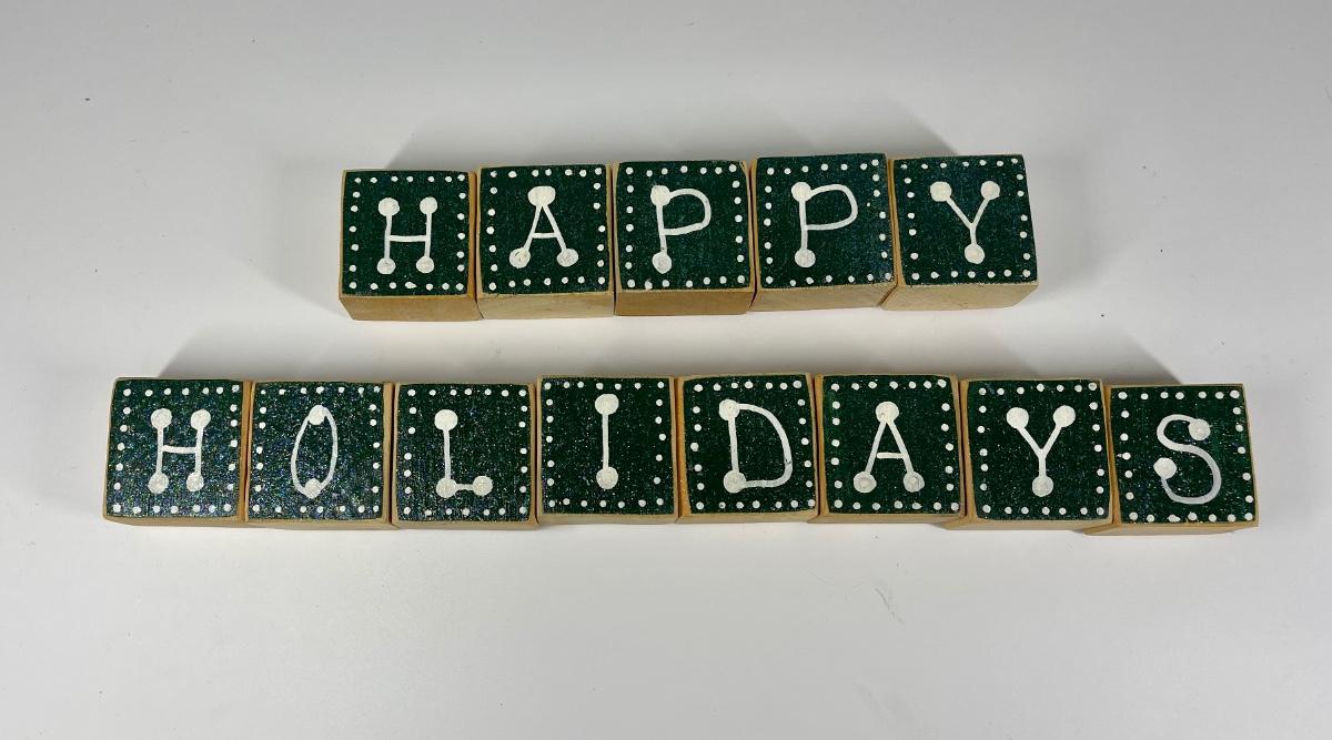 Blocks spell out “give thanks” on one side and “happy holidays” on the other. Blocks measure approximately 2” x 2” x 1 1/2”. In good condition