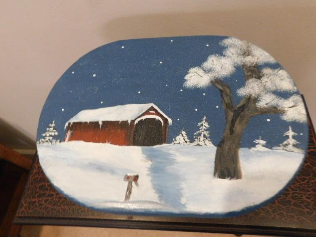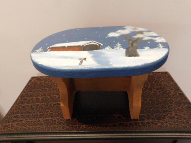 Hand Painted Wood Stool Winter Covered Bridge Scene 12"x8"