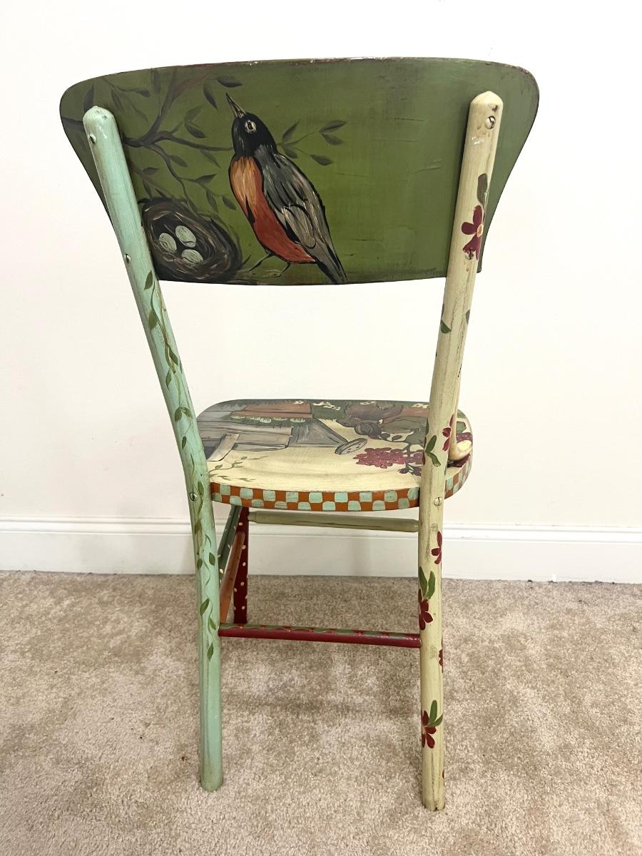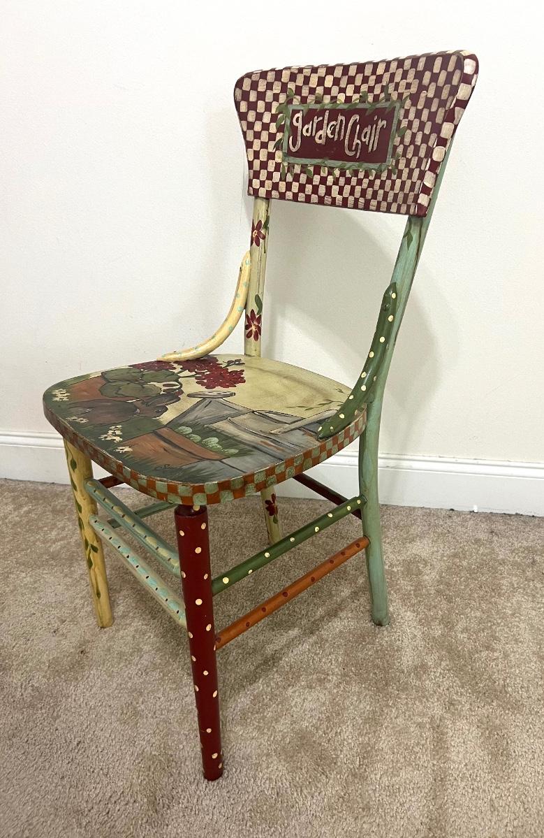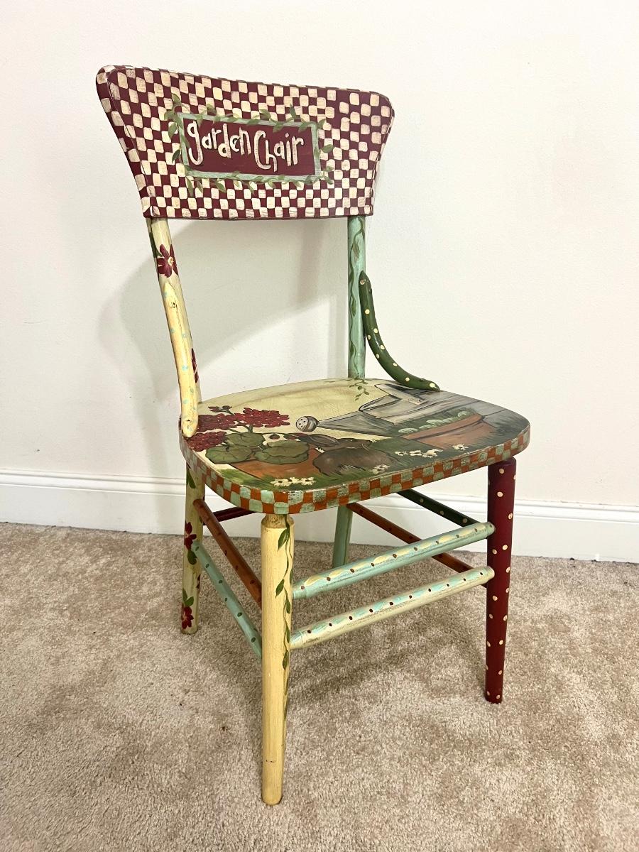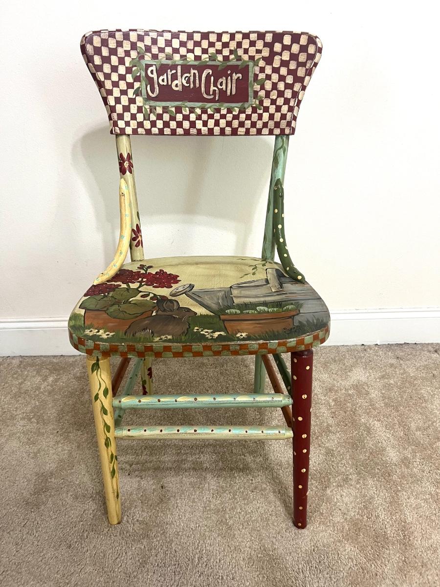 Hand Painted Wooden Accent Chair. Measures 34 1/2 inches tall, 17 inches wide and 18 1/2 inches deep. Floor to seat measures 17 1/2 inches.