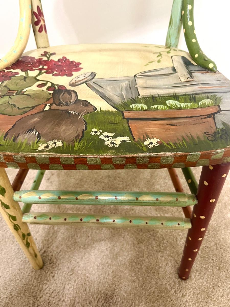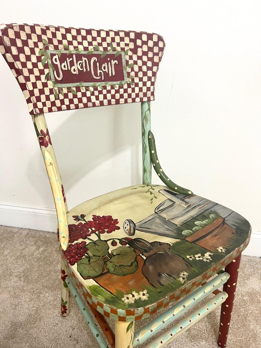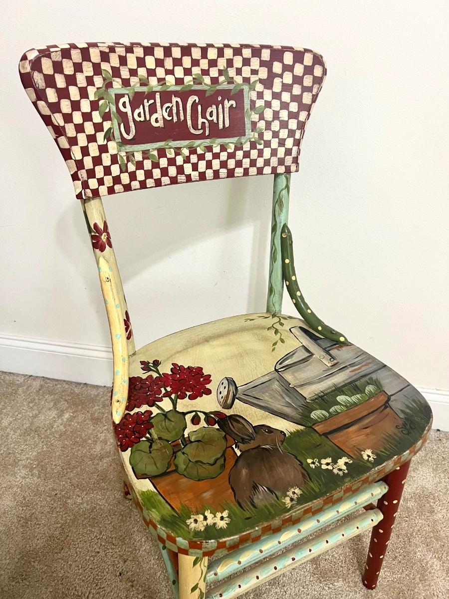 Hand Painted Wooden Accent Chair. Measures 34 1/2 inches tall, 17 inches wide and 18 1/2 inches deep. Floor to seat measures 17 1/2 inches.