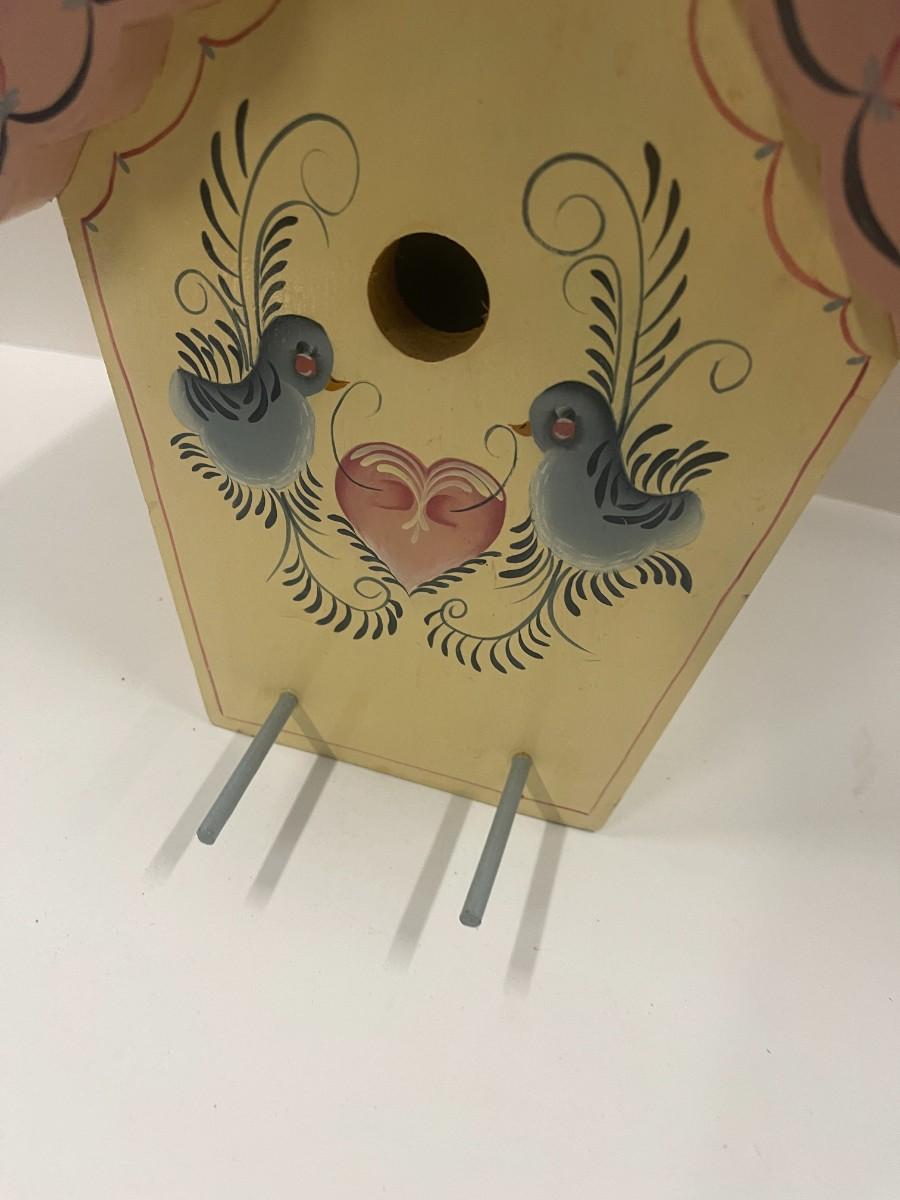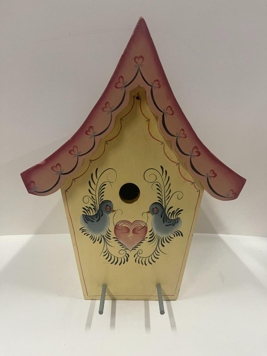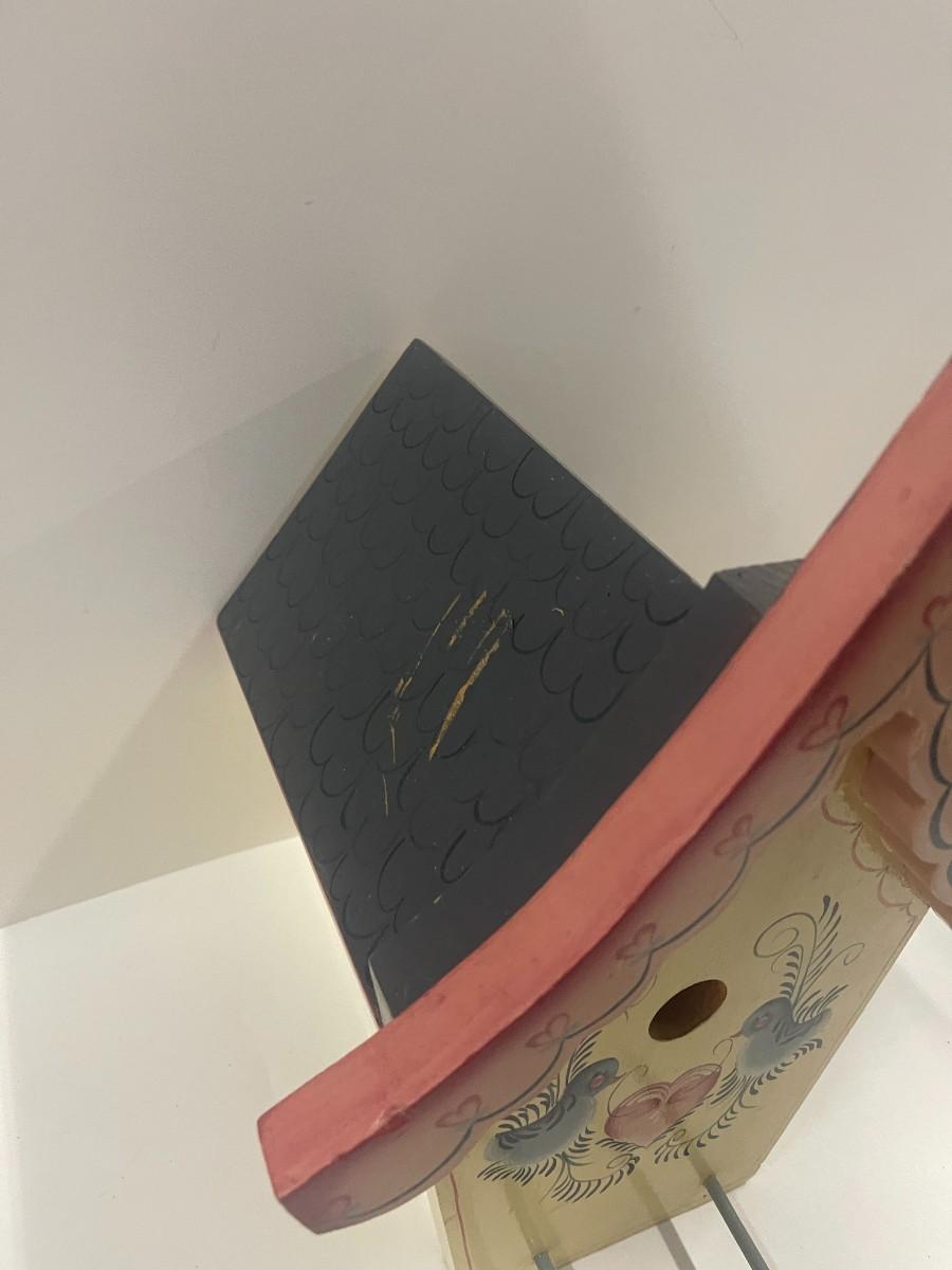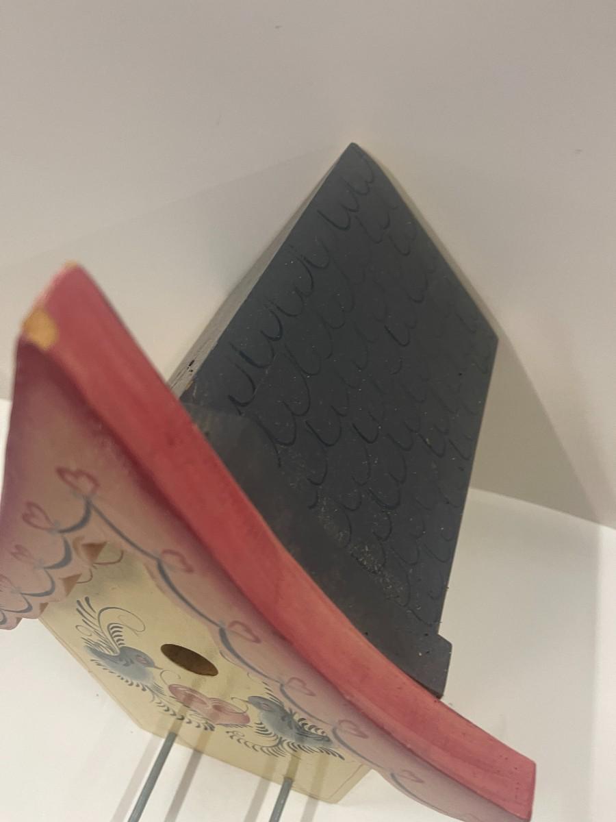 Hand painted wooden bird house. Has some scratches on the one side of the roof. Otherwise very good condition. 9 1/2" long x 13" high x 9 1/2" wide.