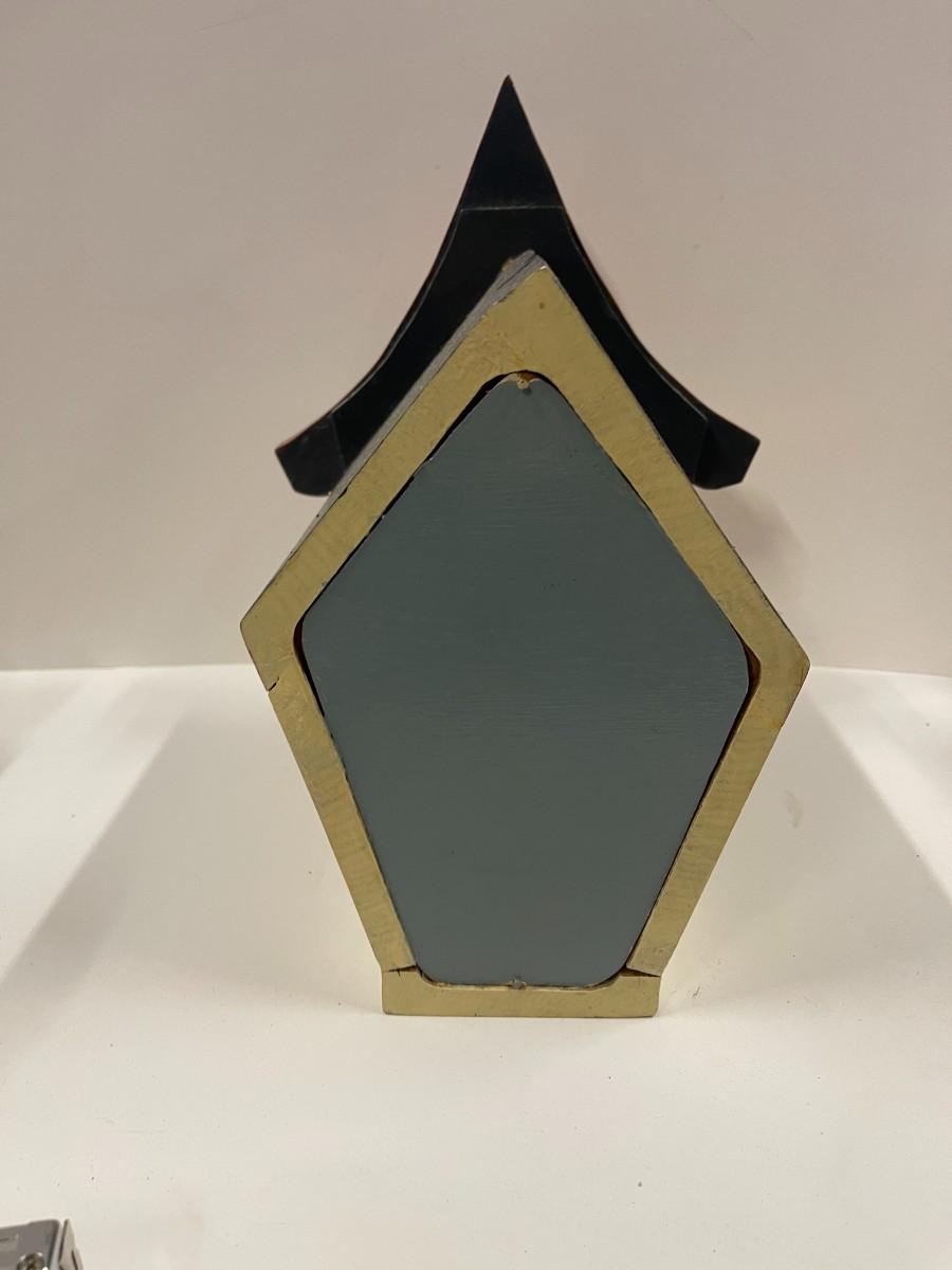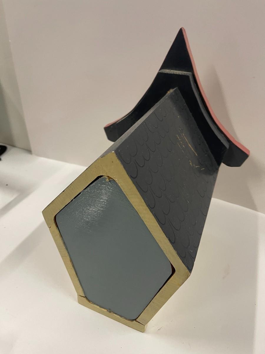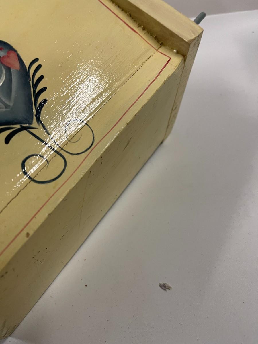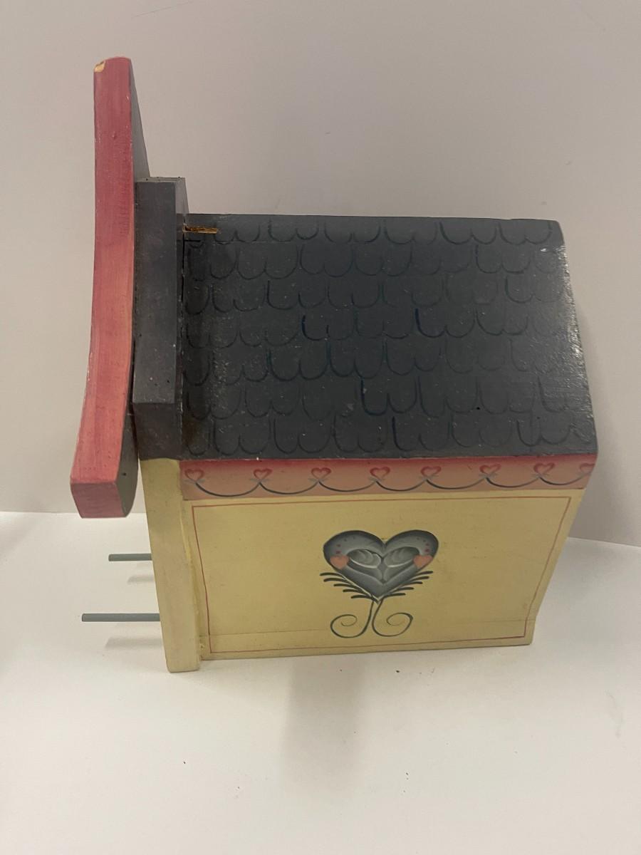 Hand painted wooden bird house. Has some scratches on the one side of the roof. Otherwise very good condition. 9 1/2" long x 13" high x 9 1/2" wide.