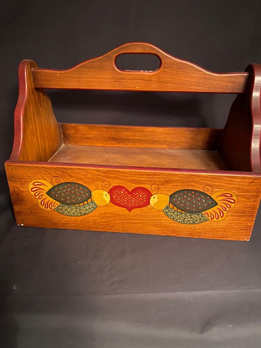 Hand painted on all sides. One drawer. Wooden carrier - 17 1/2”w x 13”h x 10 1/2”d. Excellent condition