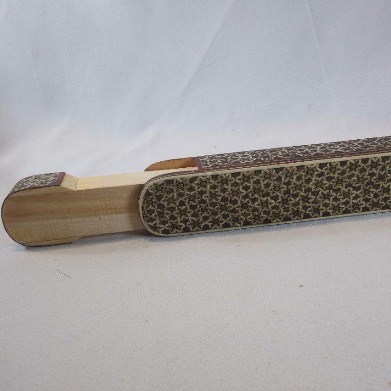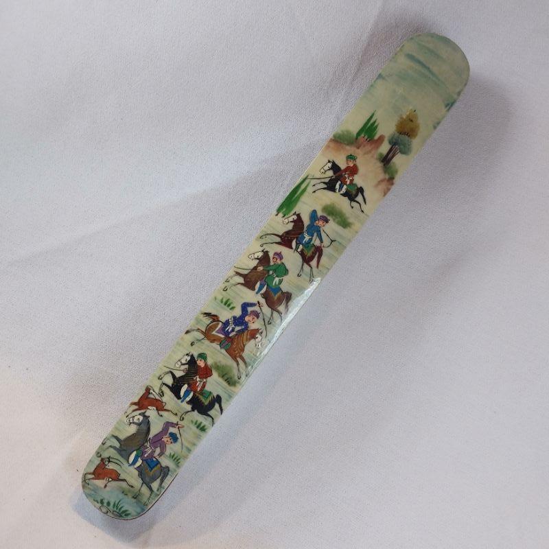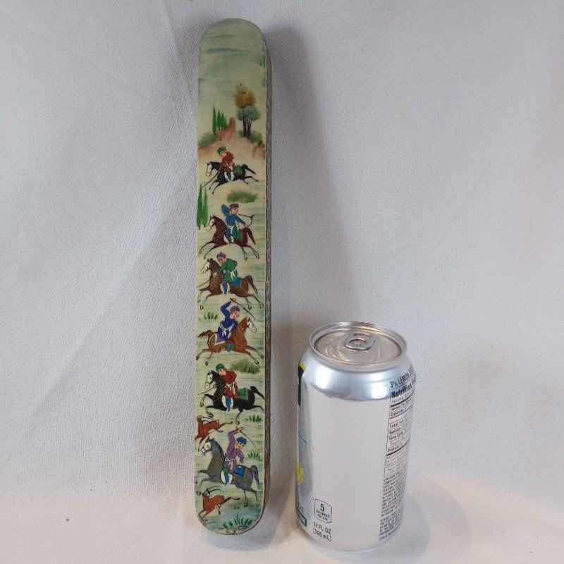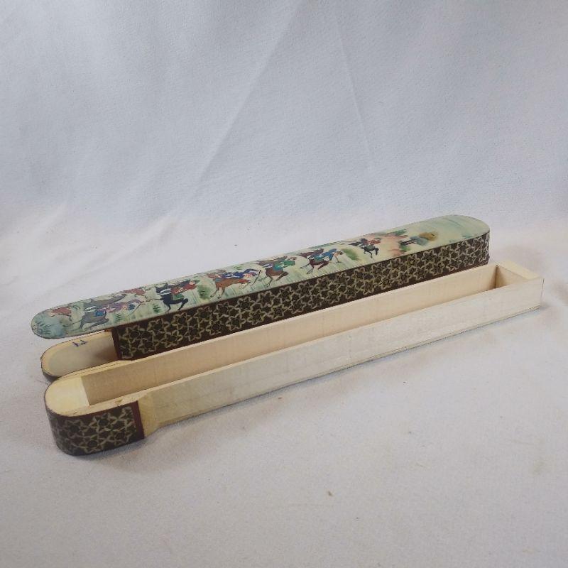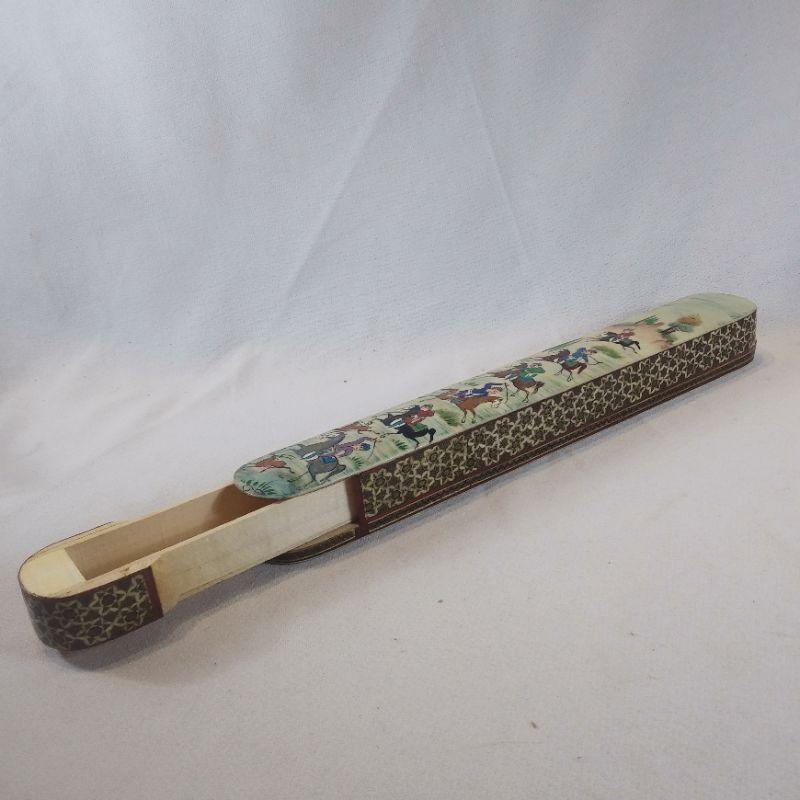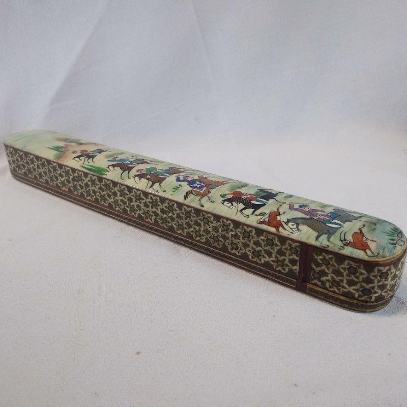 Hand-Painted Persian Wood Pencil Box. Box measures 12-inches long and would hold about 6 pencils or pens. It boasts Asian-themed hunting scenes on top of the handmade box. Very good condition. Appears unused. Great decorator piece.