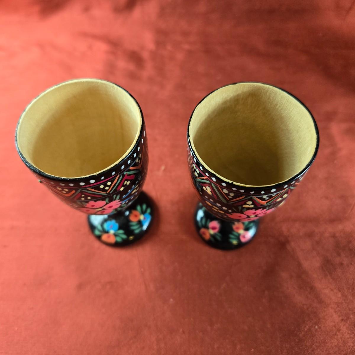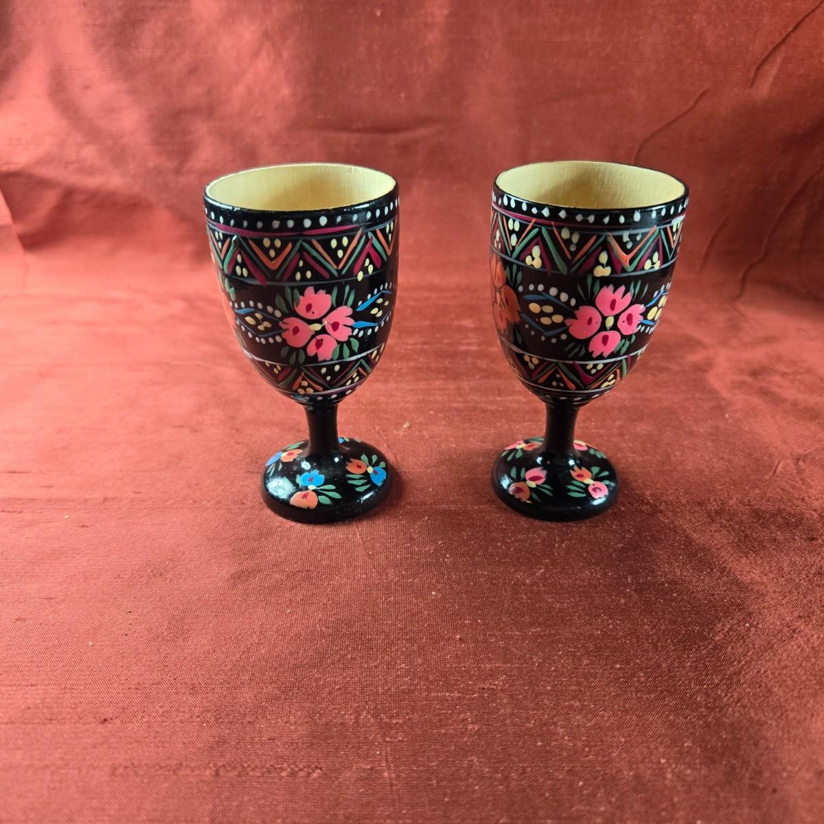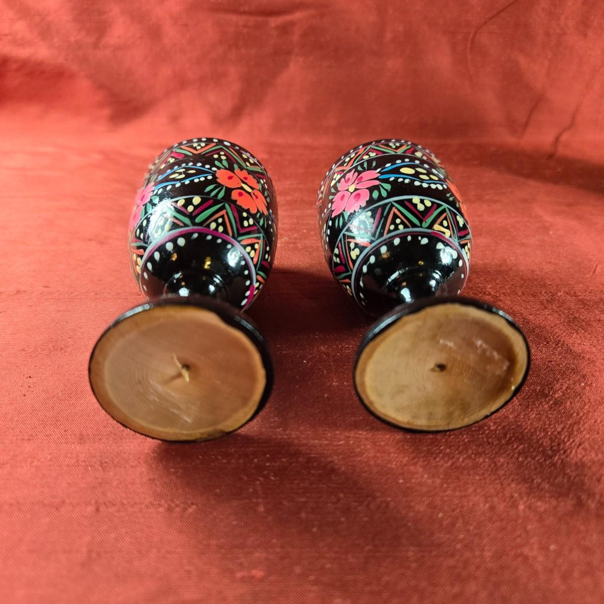 This auction lot is for a pair of Hand-Painted Wooden Egg Holders. This is a very nice pair of wooden, hand-turned and hand-painted egg holders. Most likely Ukrainian or upper Russian. The painting style is reminiscent of Russian painted boxes. These are in great condition and ready to serve your special person a delicious soft-boiled egg for Easter breakfast.