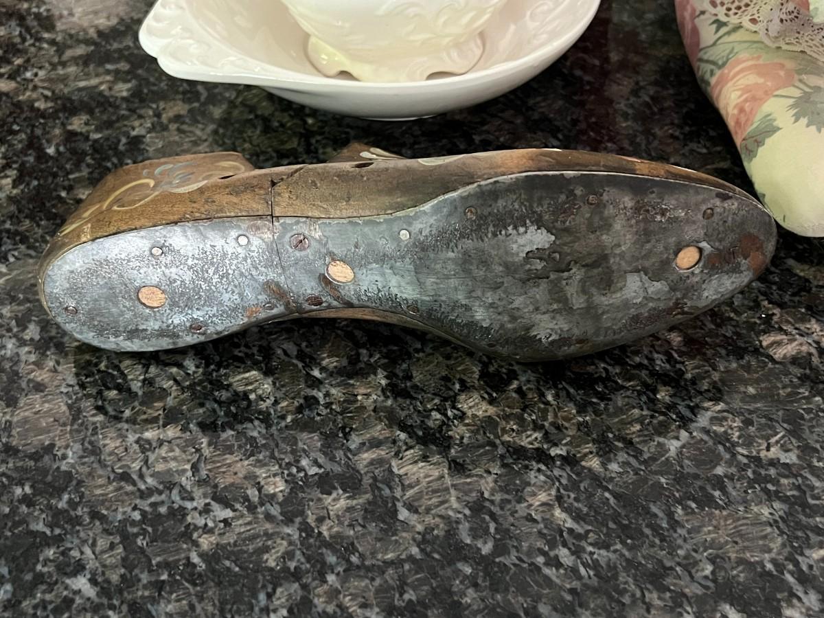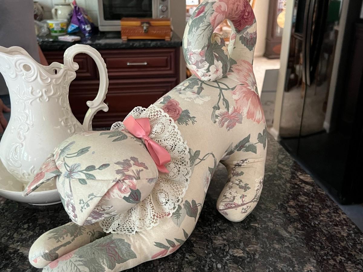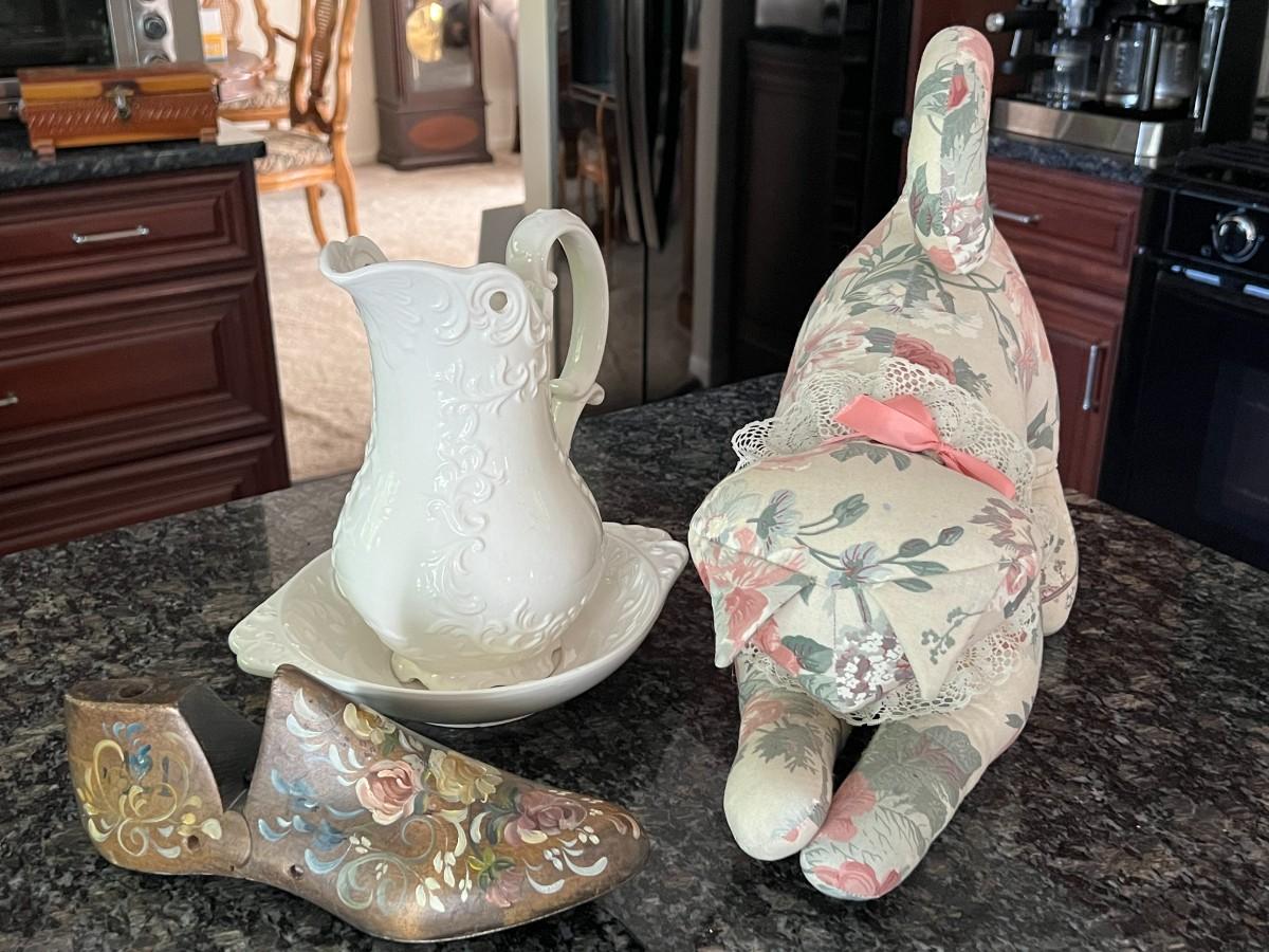 Hand Painted Wooden Shoe Stretcher, Floral Cat, and Decorative Water Pitcher Set