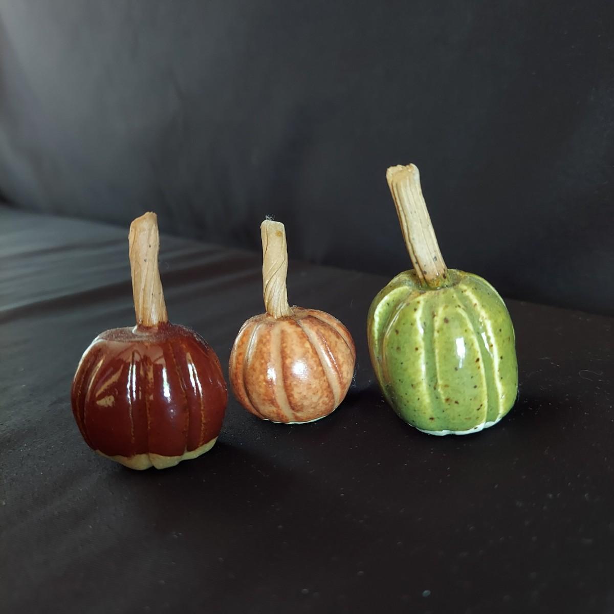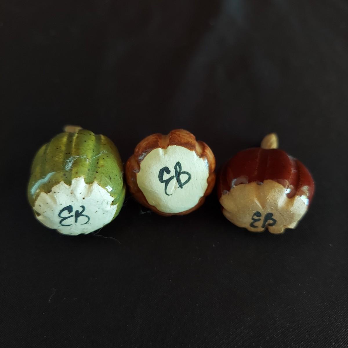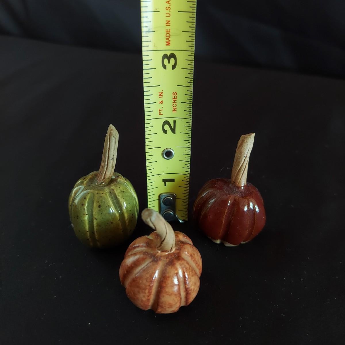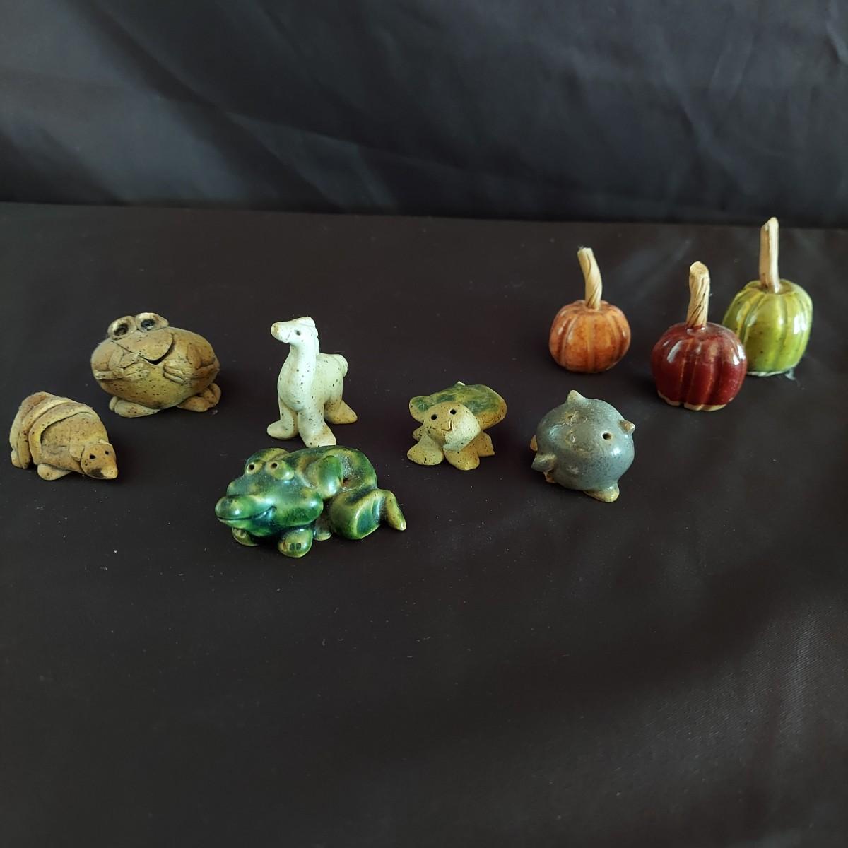 Three hand carved glazed pumpkins. Also includes six animals or creatures. Some have condition issues. Approximately 1-2" tall. Shipping available