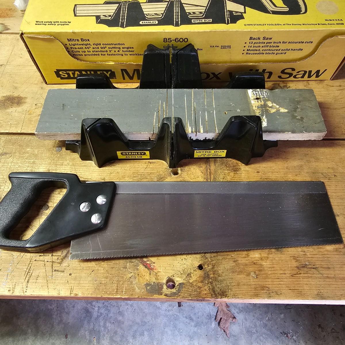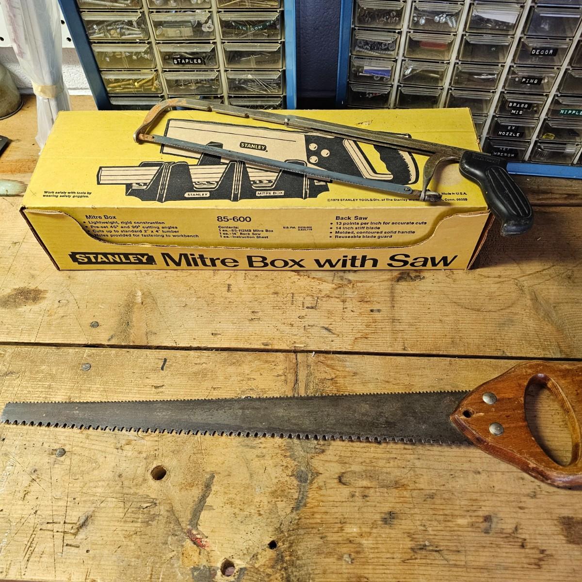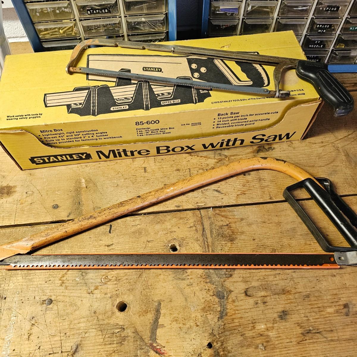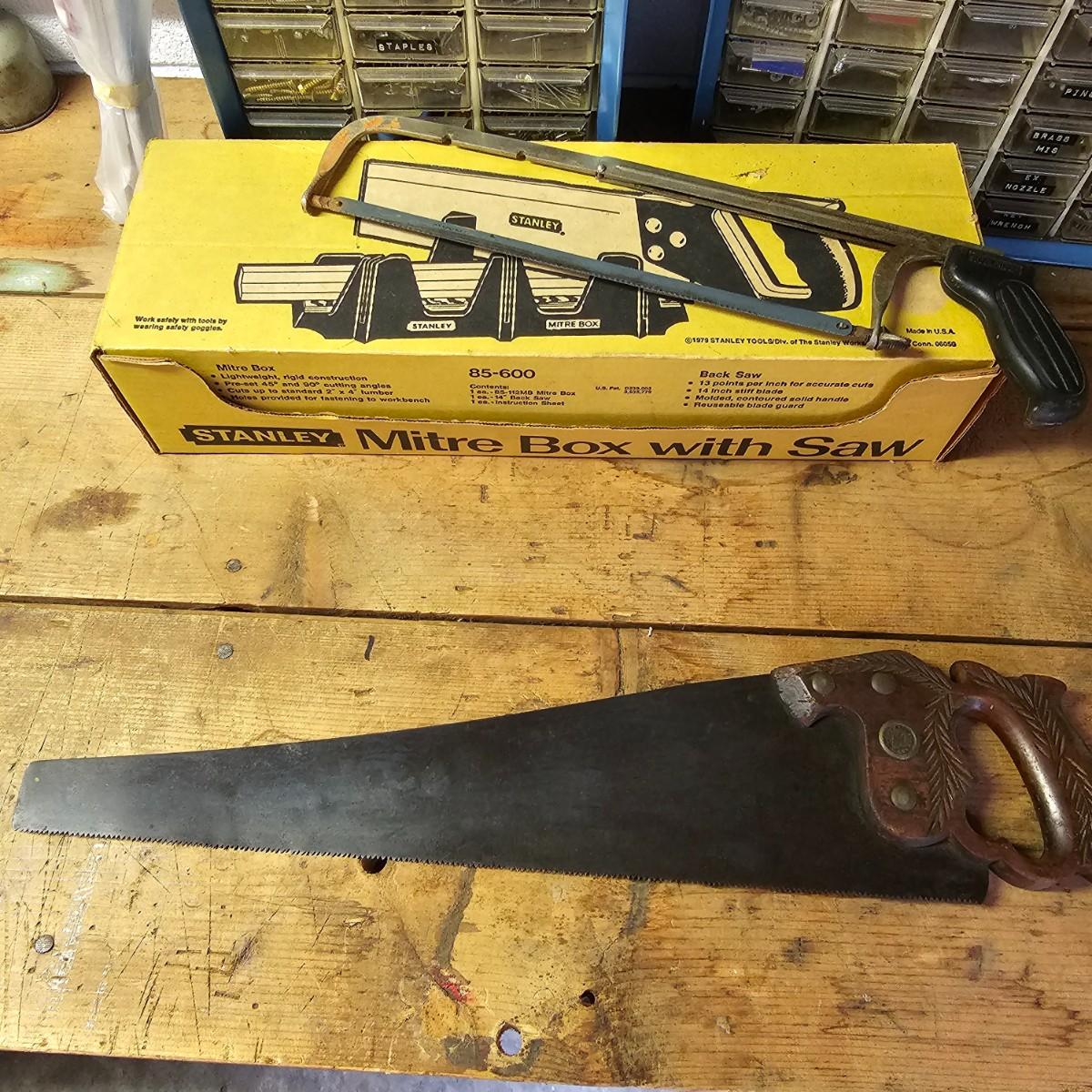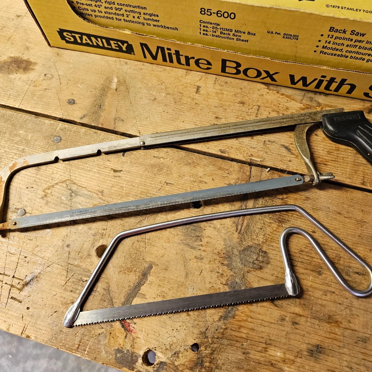 An assortment of hand saws, miter box, hack saw. Stanley miter box with 14" back saw, some crosscut saws for tree work. Extra hacksaw blades included. See photos for details. Shipping available.