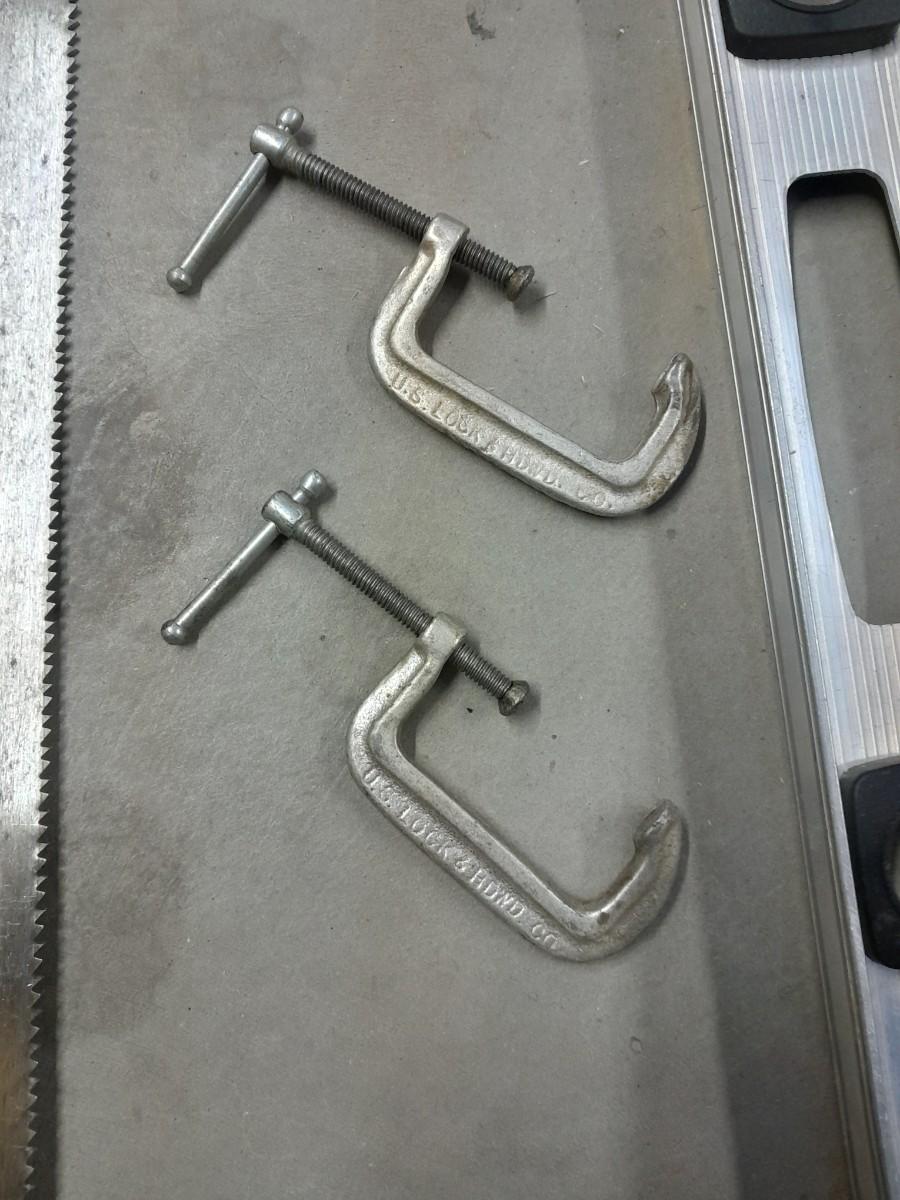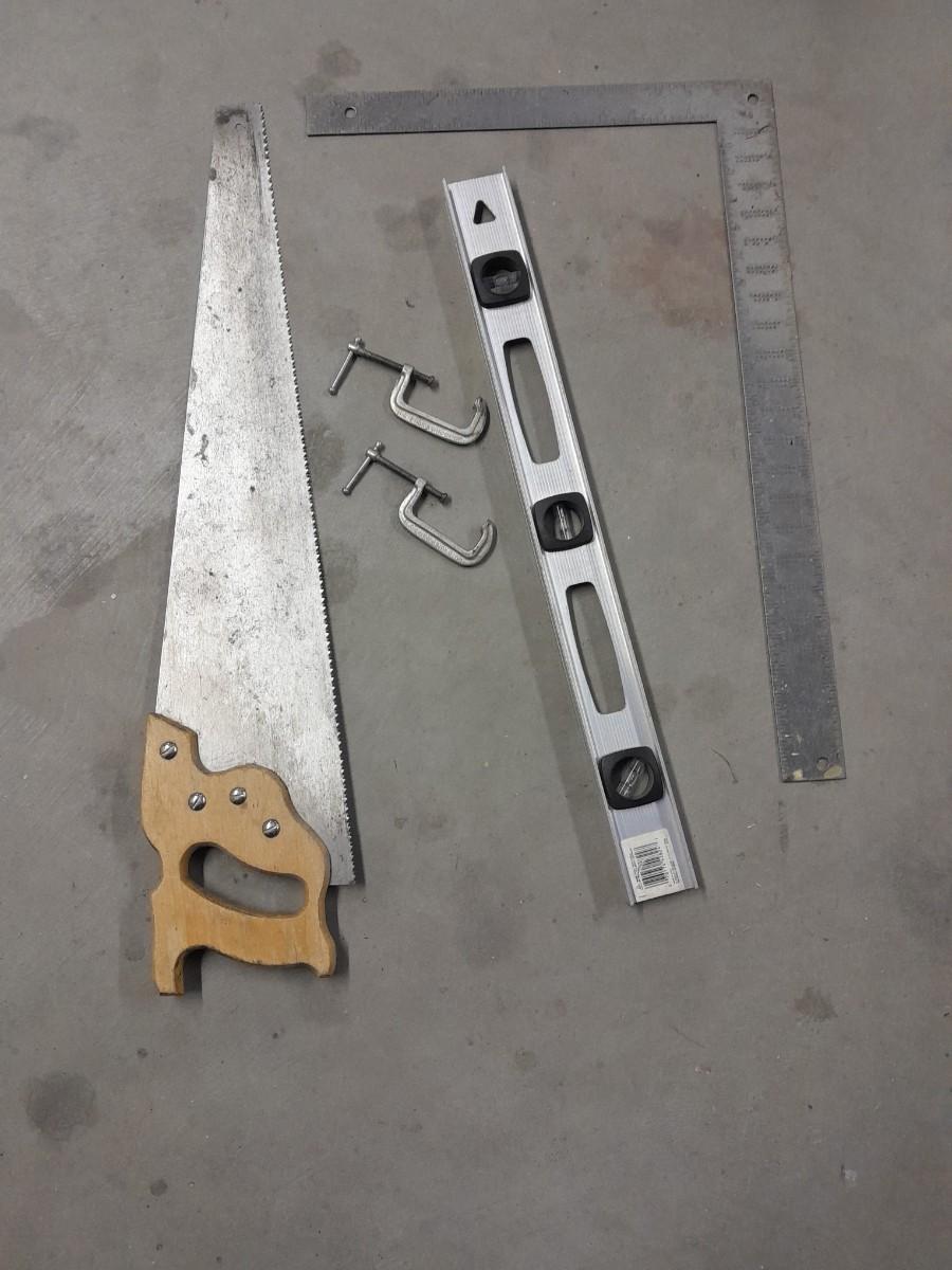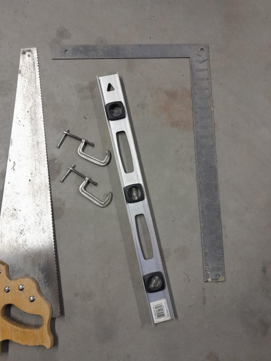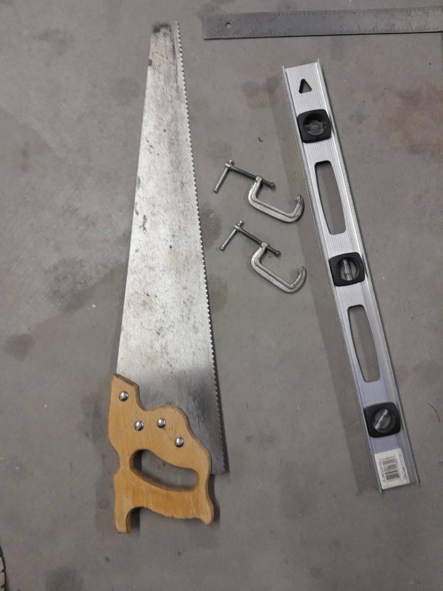 HAND SAW, CLAMPS, LEVEL AND A CARPENTERS SQUARE