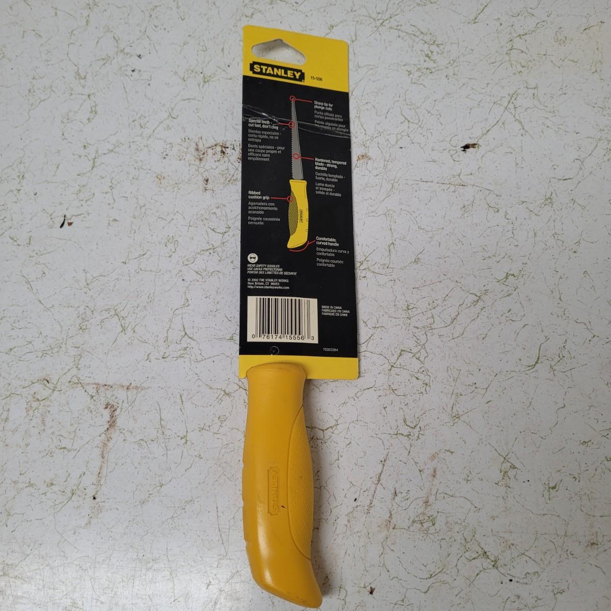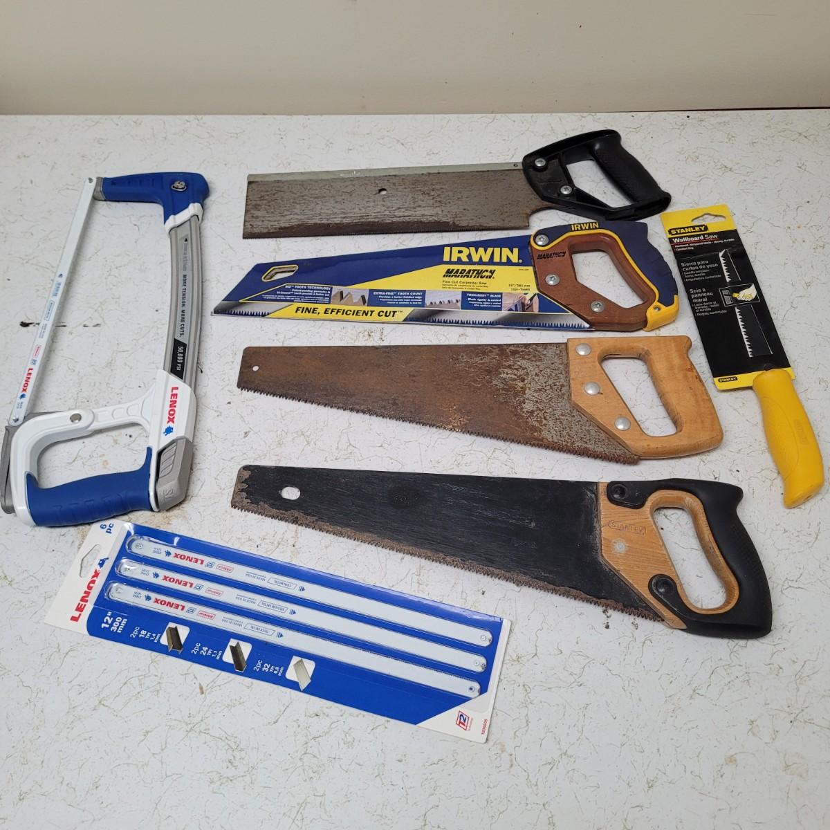 This lot includes six individual saws. Five of which are intended for wood with a sixth saw for metal with backup blades. Brands include Stanley, Irwin, and Lenox. The wood saws are 15" in length. There is a wallboard saw with a 6" blade. And the metal saw measures 16.5" in length.