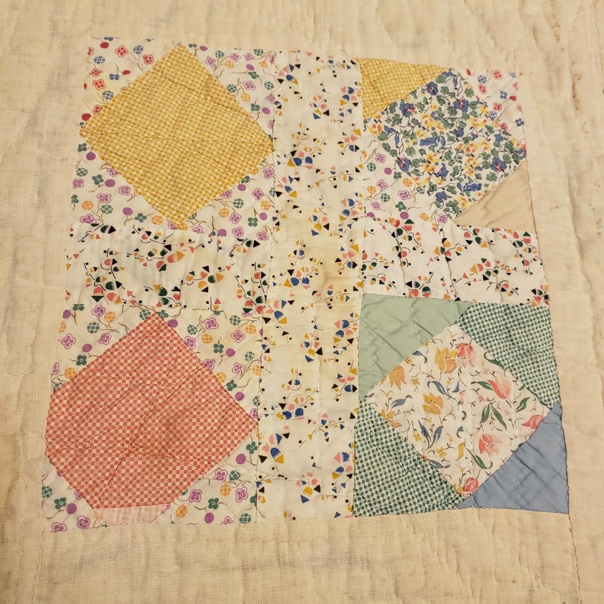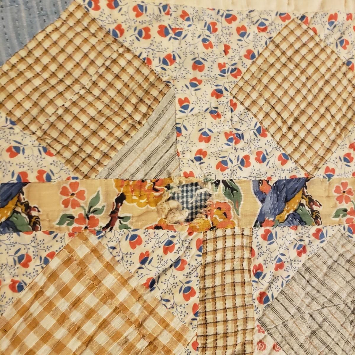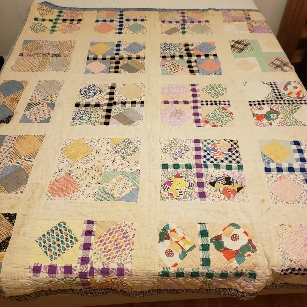 This hand sewn quilt has felt the love! It measures 75" x 62" and has a big block pattern. There are some tears and spots that add to it's legacy.