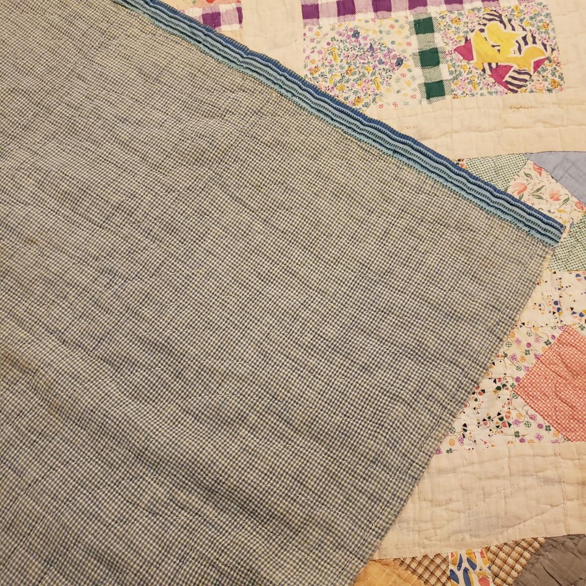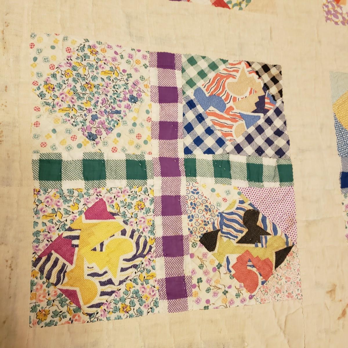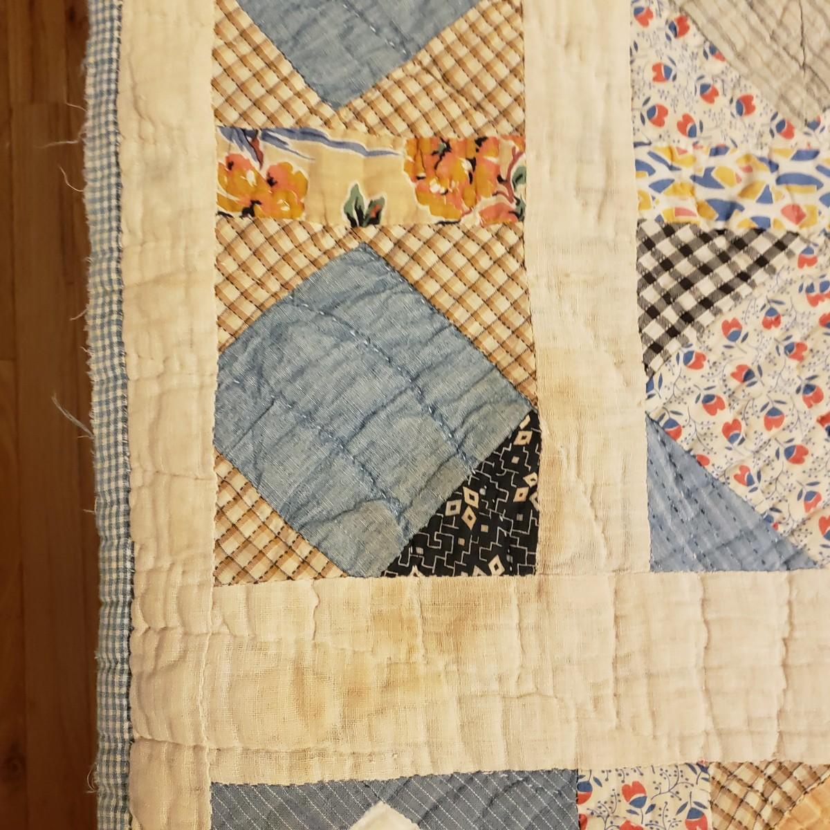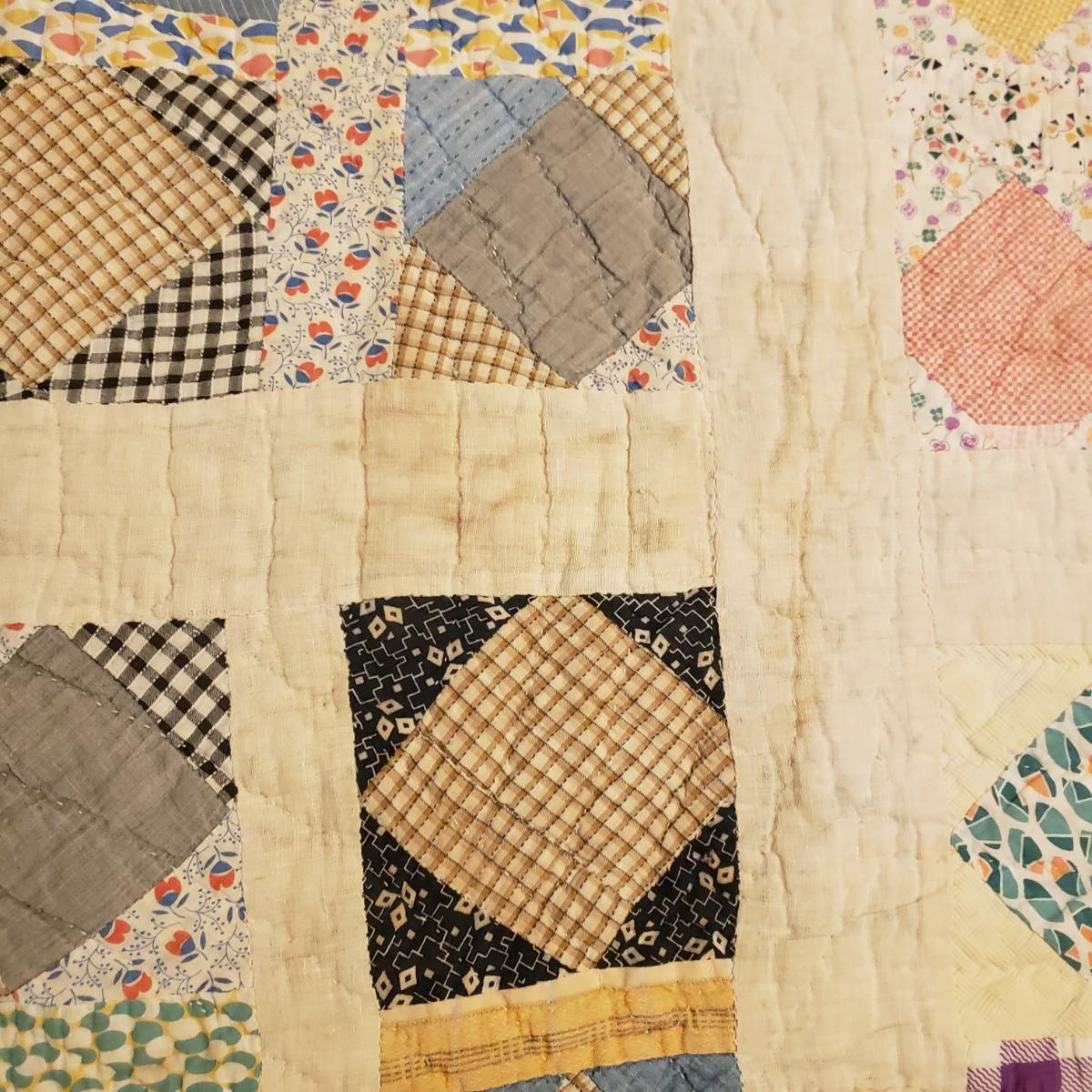 This hand sewn quilt has felt the love! It measures 75" x 62" and has a big block pattern. There are some tears and spots that add to it's legacy.