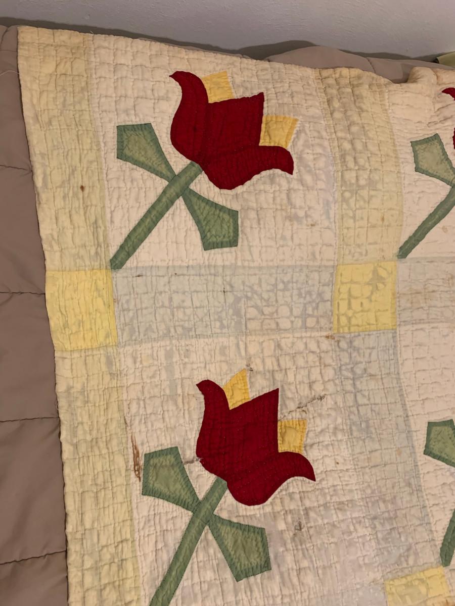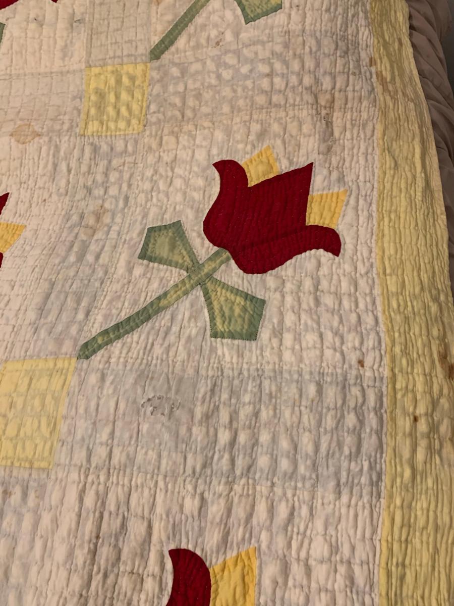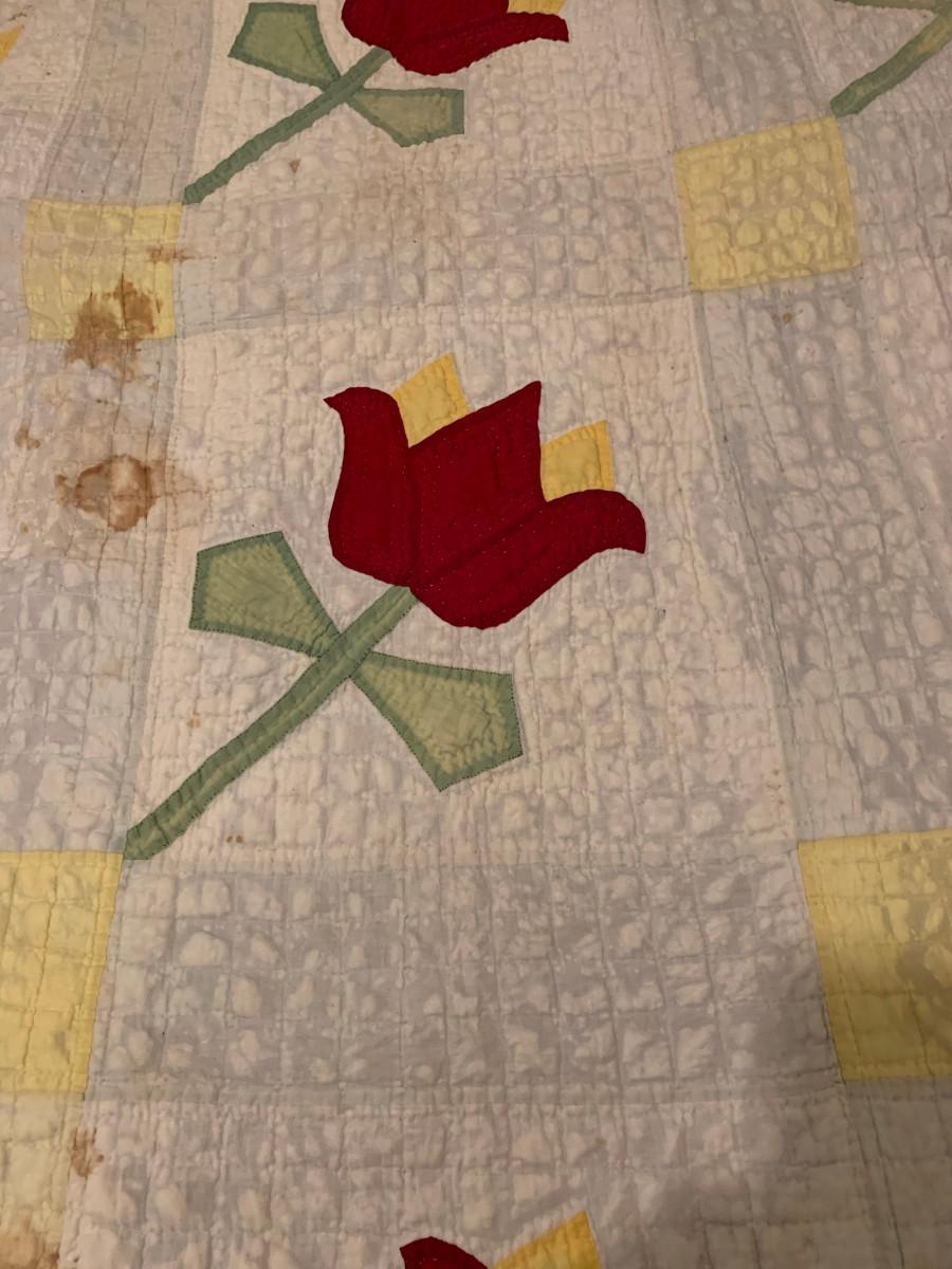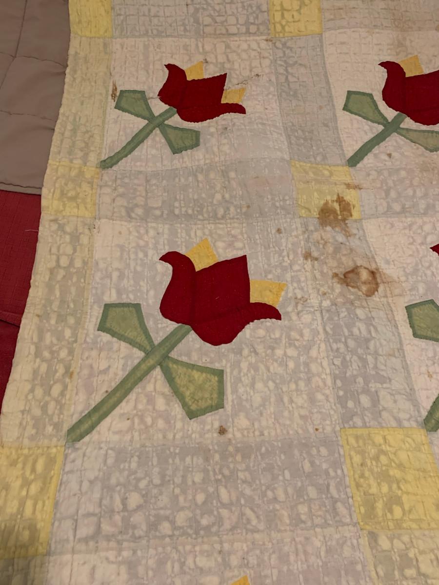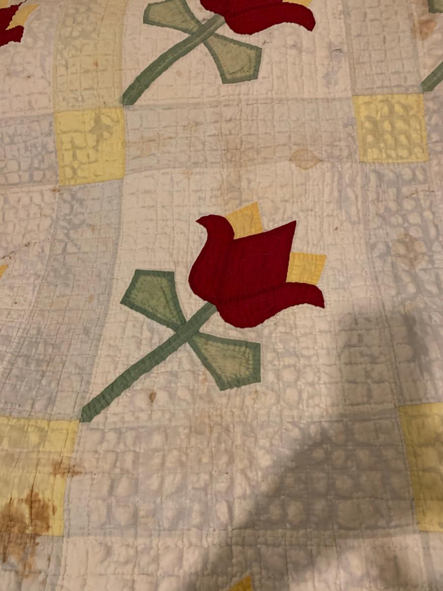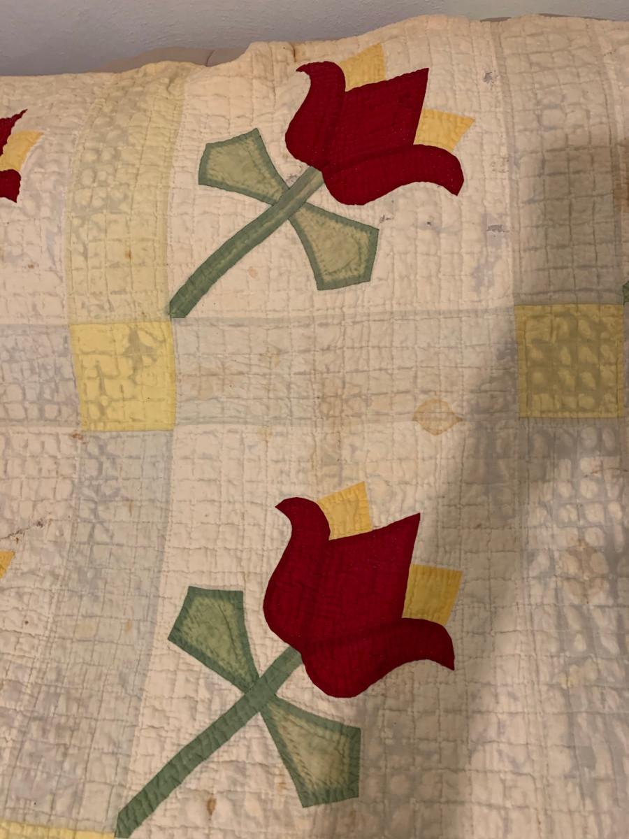 Hand sewn quilt w tulip flower design has some staining. Owner has used dawn platinum and soaked overnight- some of the staining was removed-no idea what it is -please view pics and make your decision. This is beautiful hand stitching, very detailed, using multiple colors and each tiny square is hand stitched. Perhaps it can be restored or used to make other items.