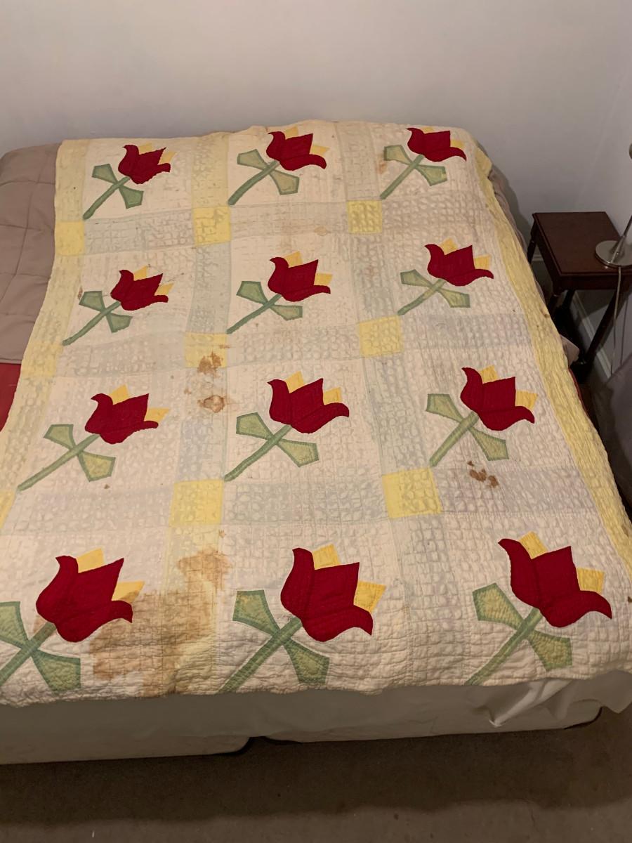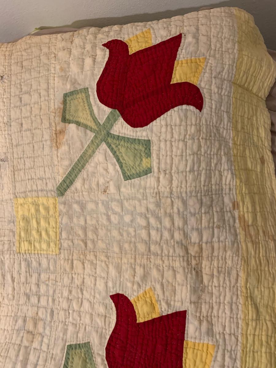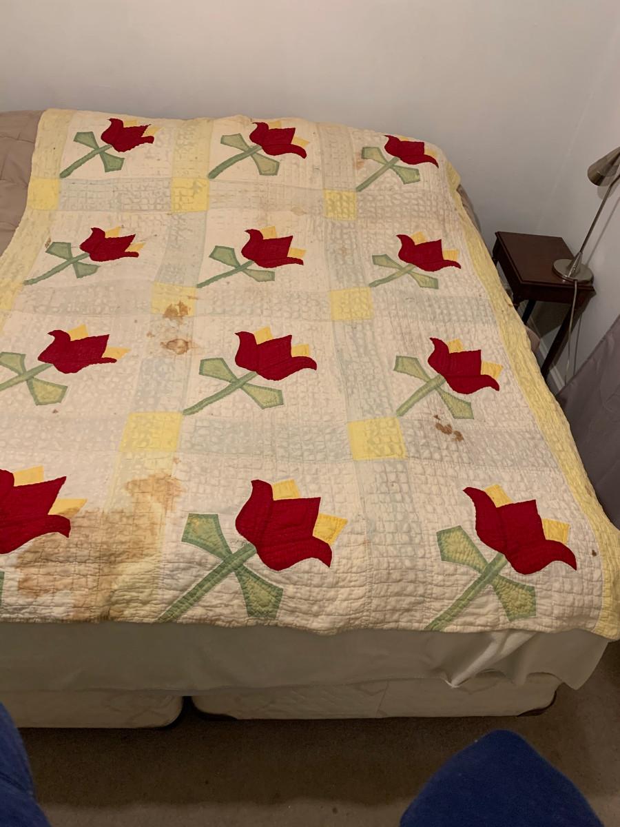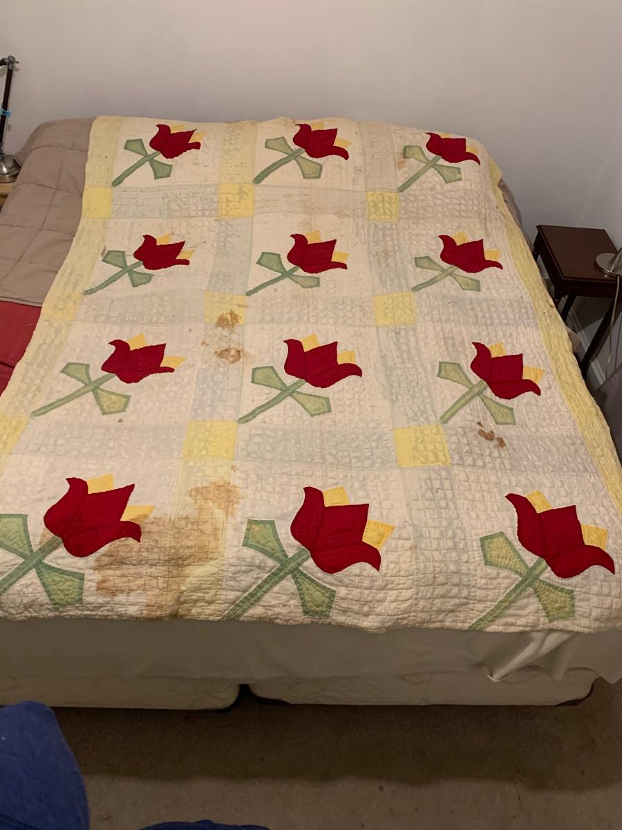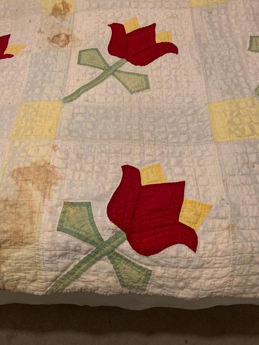 Hand sewn quilt w tulip flower design has some staining. Owner has used dawn platinum and soaked overnight- some of the staining was removed-no idea what it is -please view pics and make your decision. This is beautiful hand stitching, very detailed, using multiple colors and each tiny square is hand stitched. Perhaps it can be restored or used to make other items.