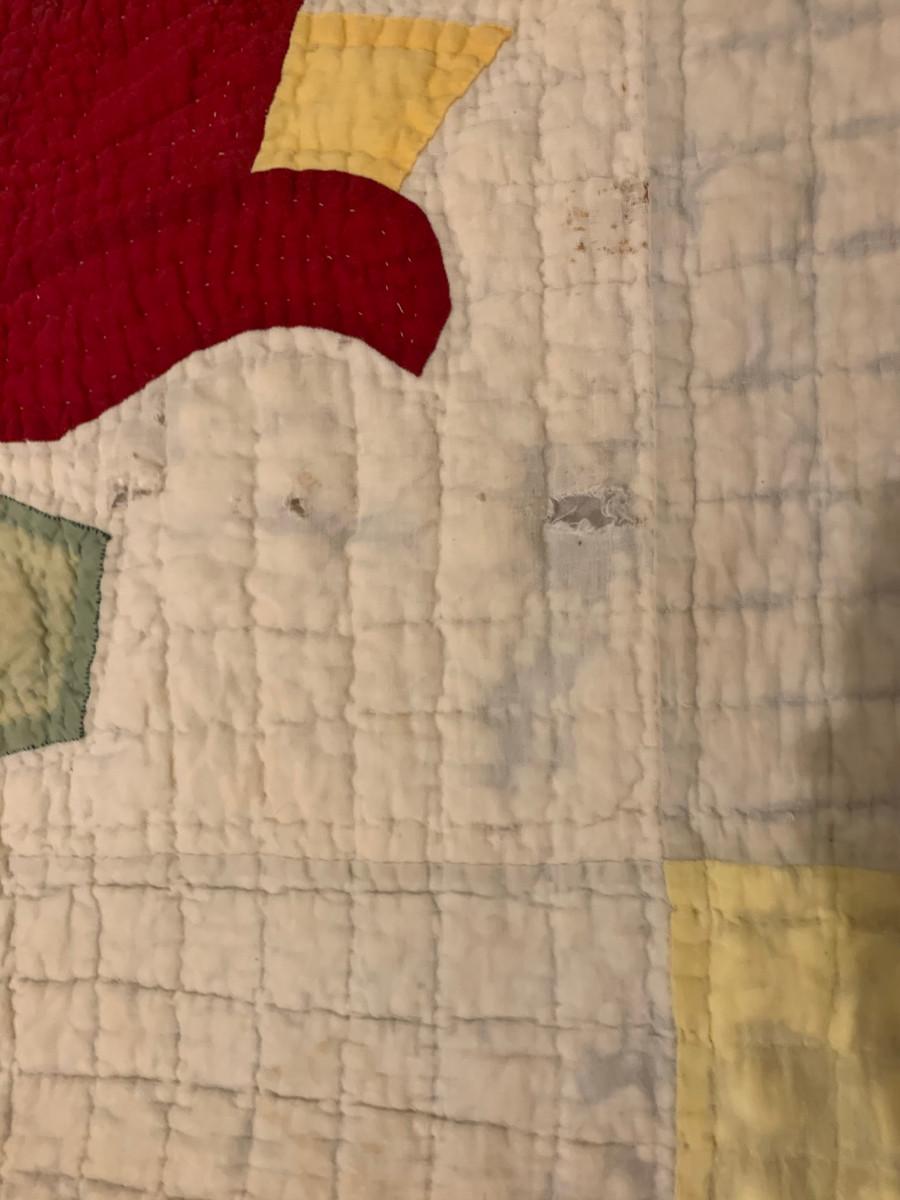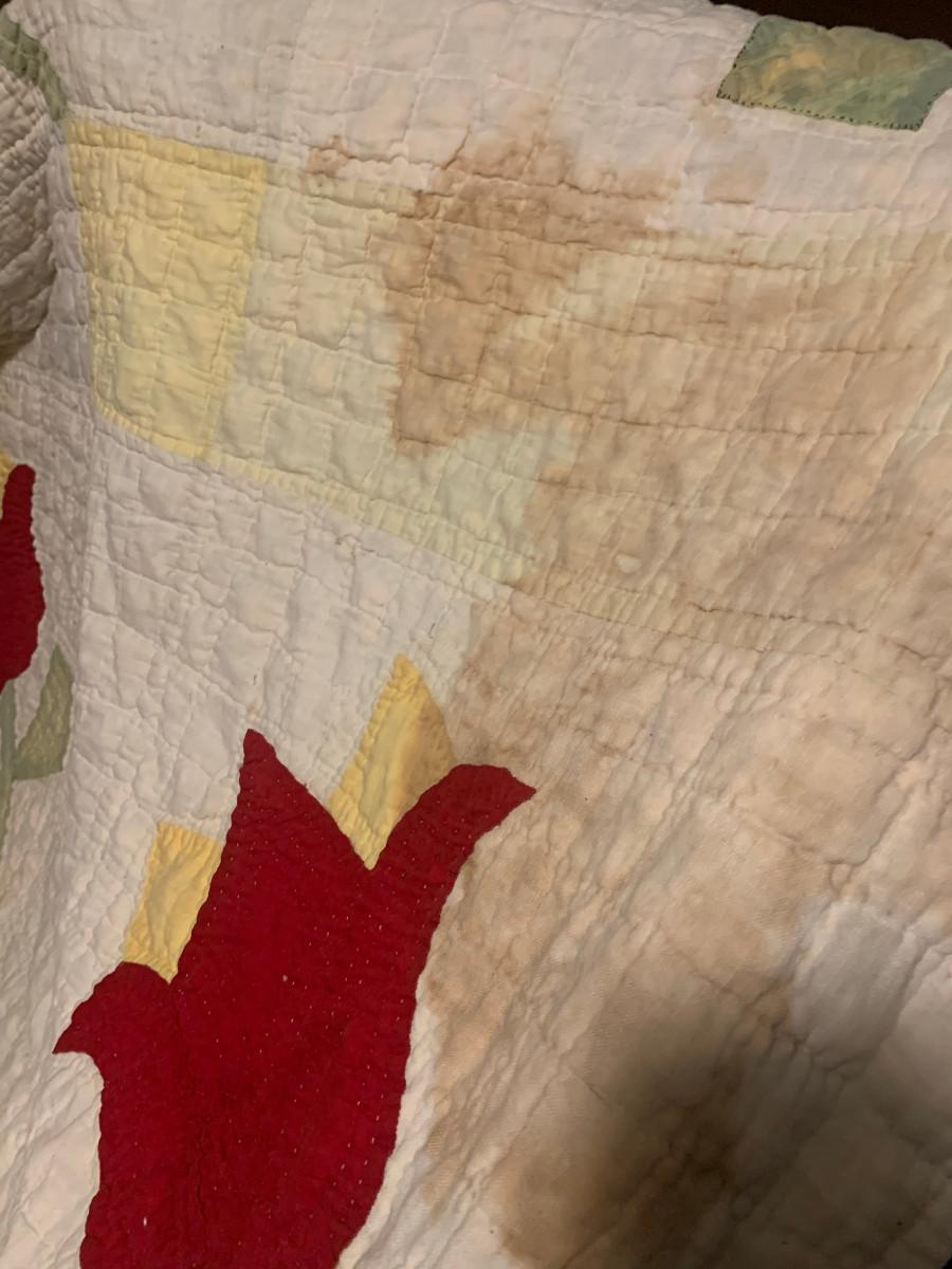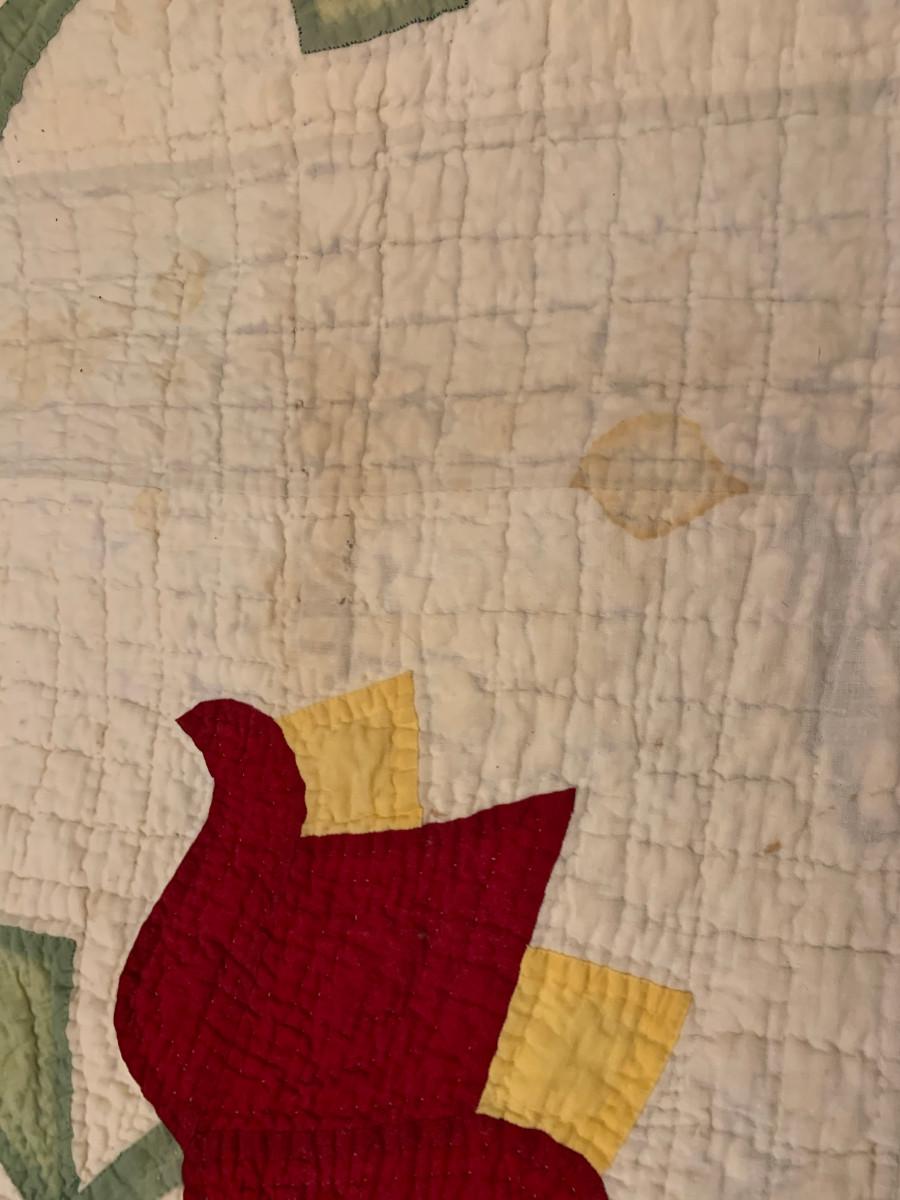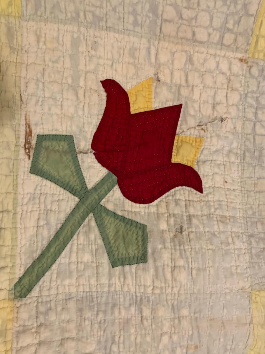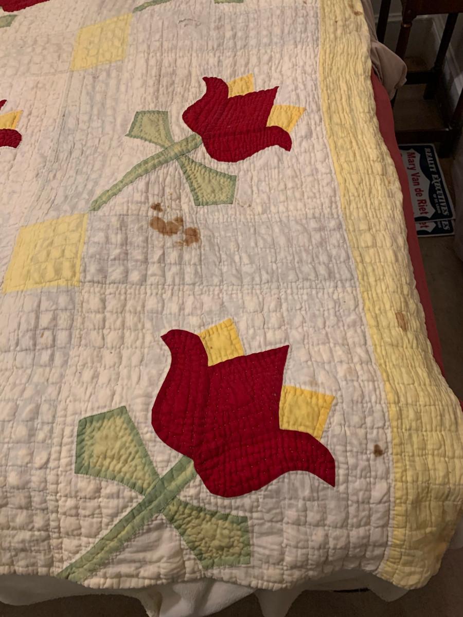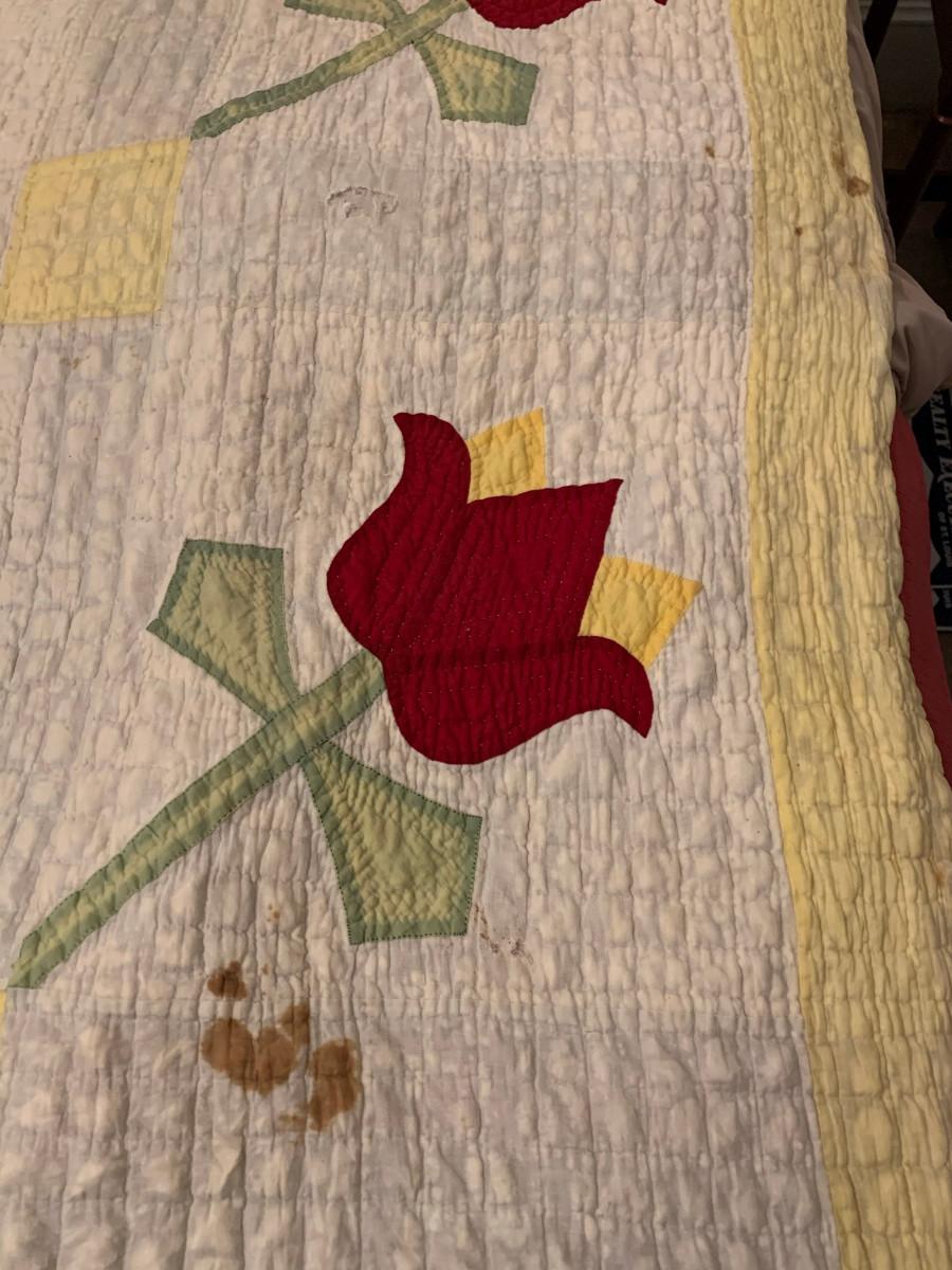 Hand sewn quilt w tulip flower design has some staining. Owner has used dawn platinum and soaked overnight- some of the staining was removed-no idea what it is -please view pics and make your decision. This is beautiful hand stitching, very detailed, using multiple colors and each tiny square is hand stitched. Perhaps it can be restored or used to make other items.